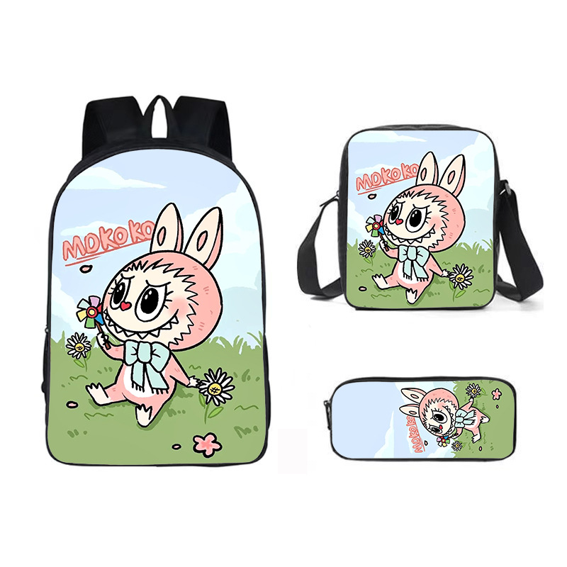 跨境新品印花Labubu三件套装书包卡通兔子学生背包挎包笔袋男女孩