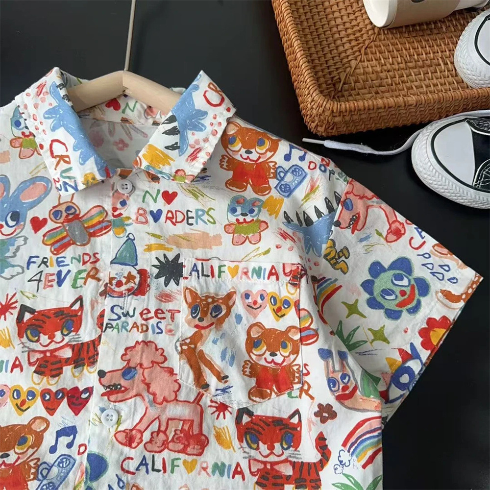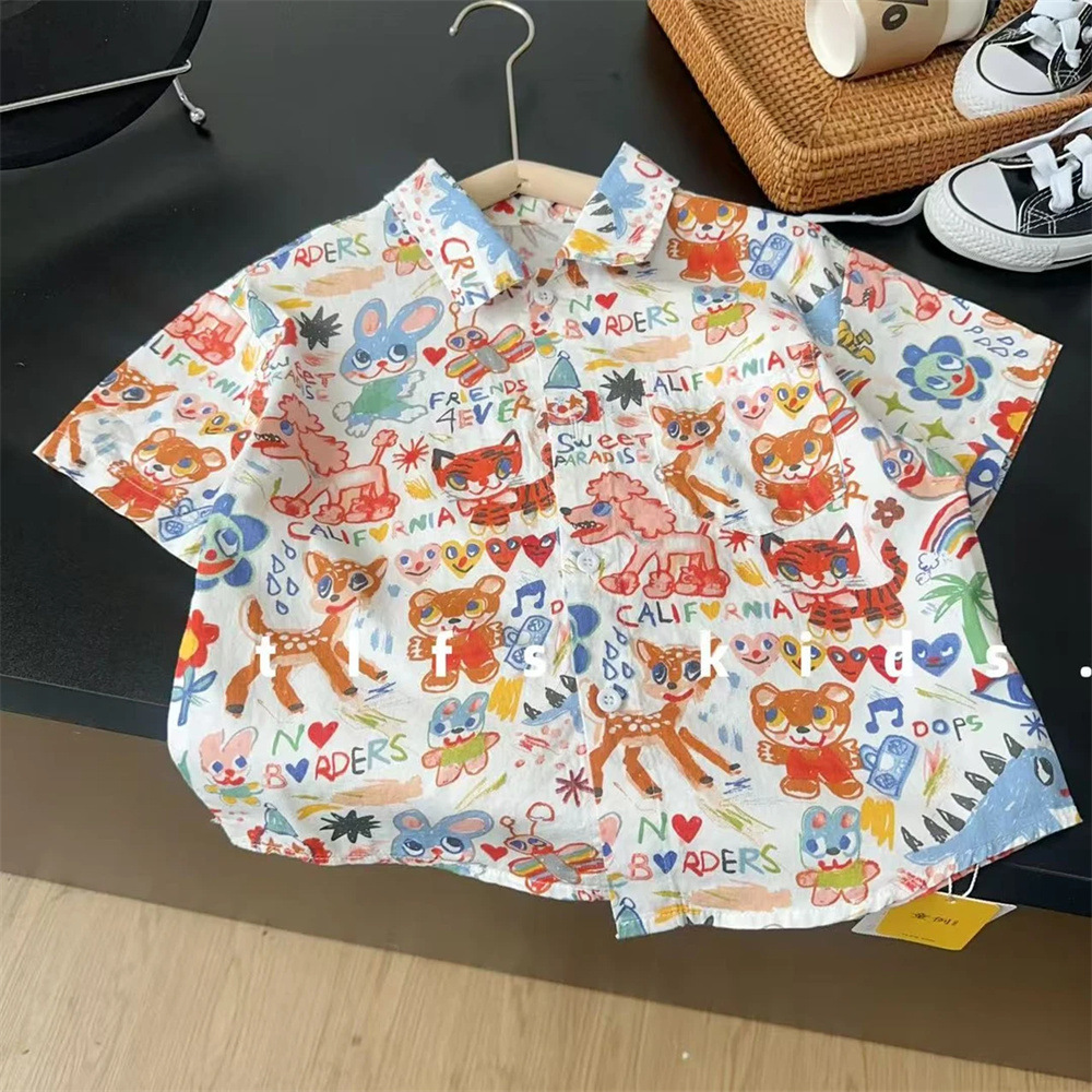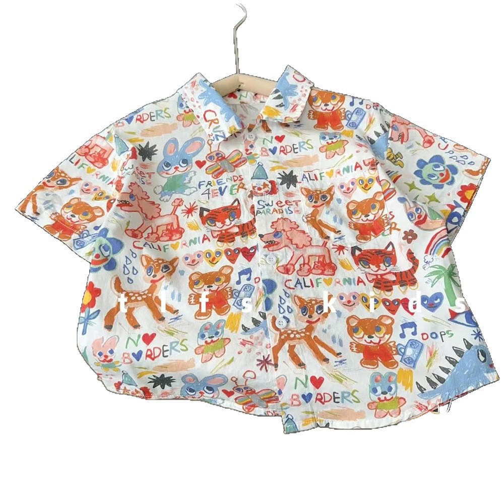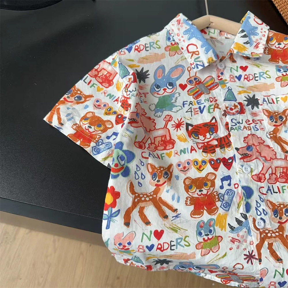 柠里儿童衬衫短袖男夏季新款小童满印上衣宝宝卡通休闲衬衣女薄款