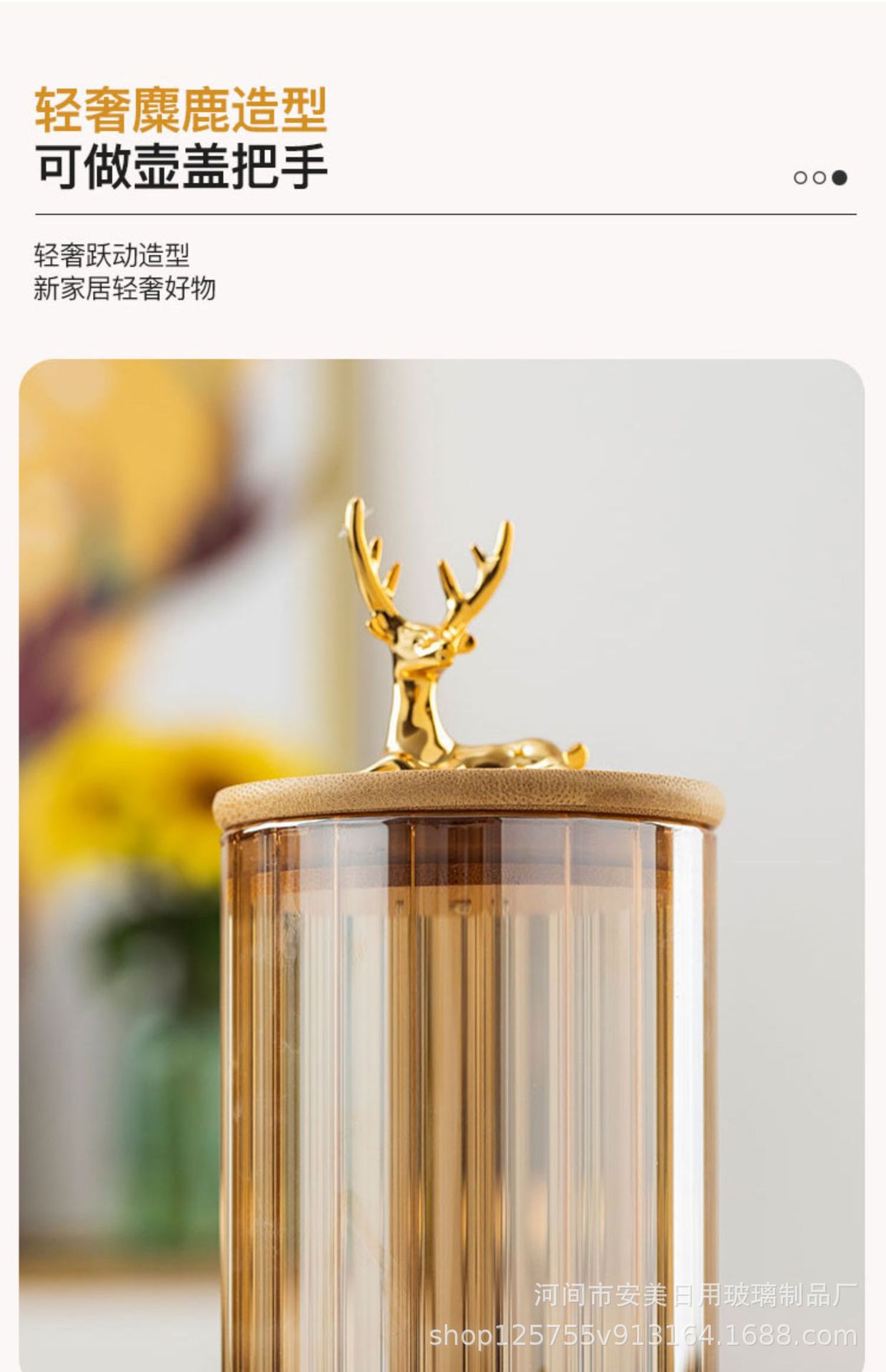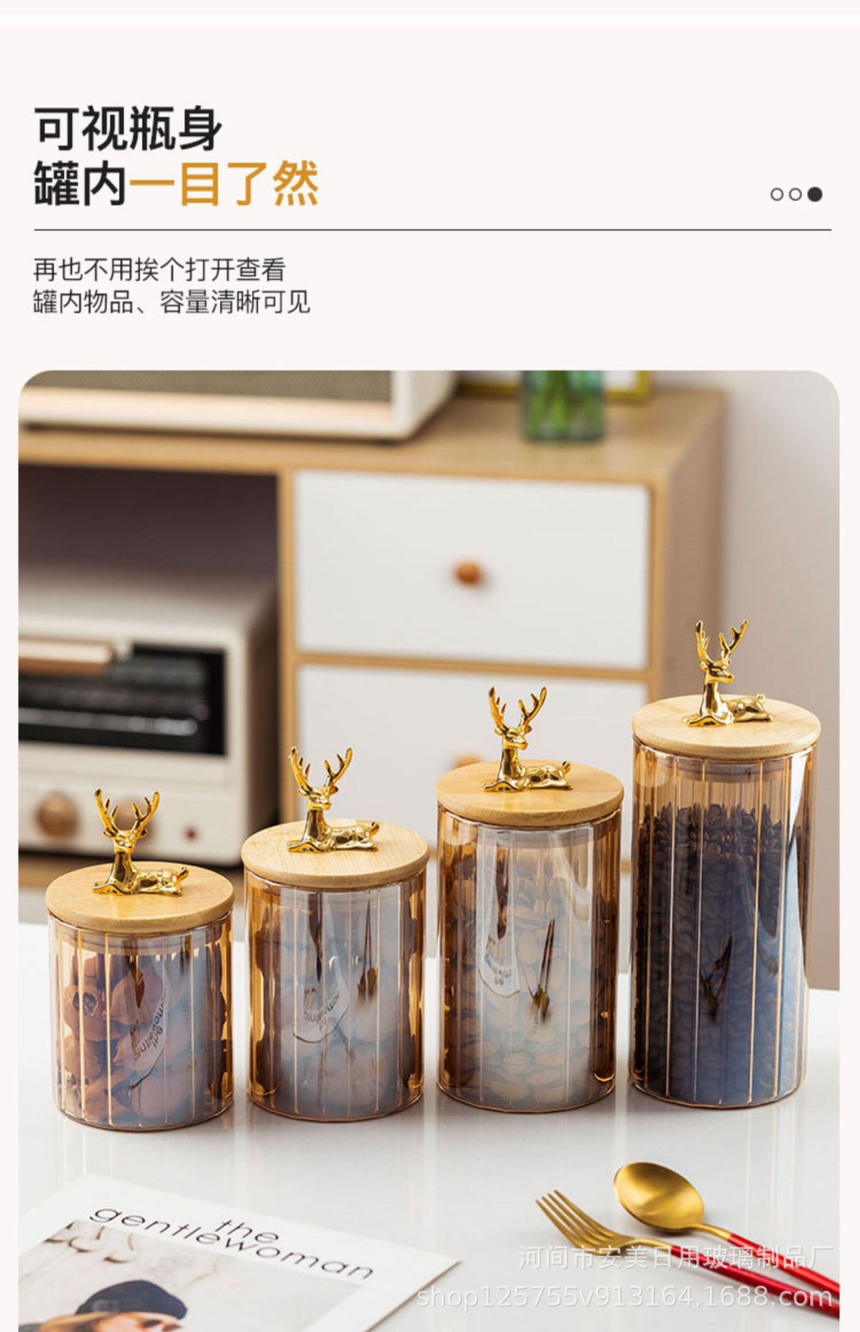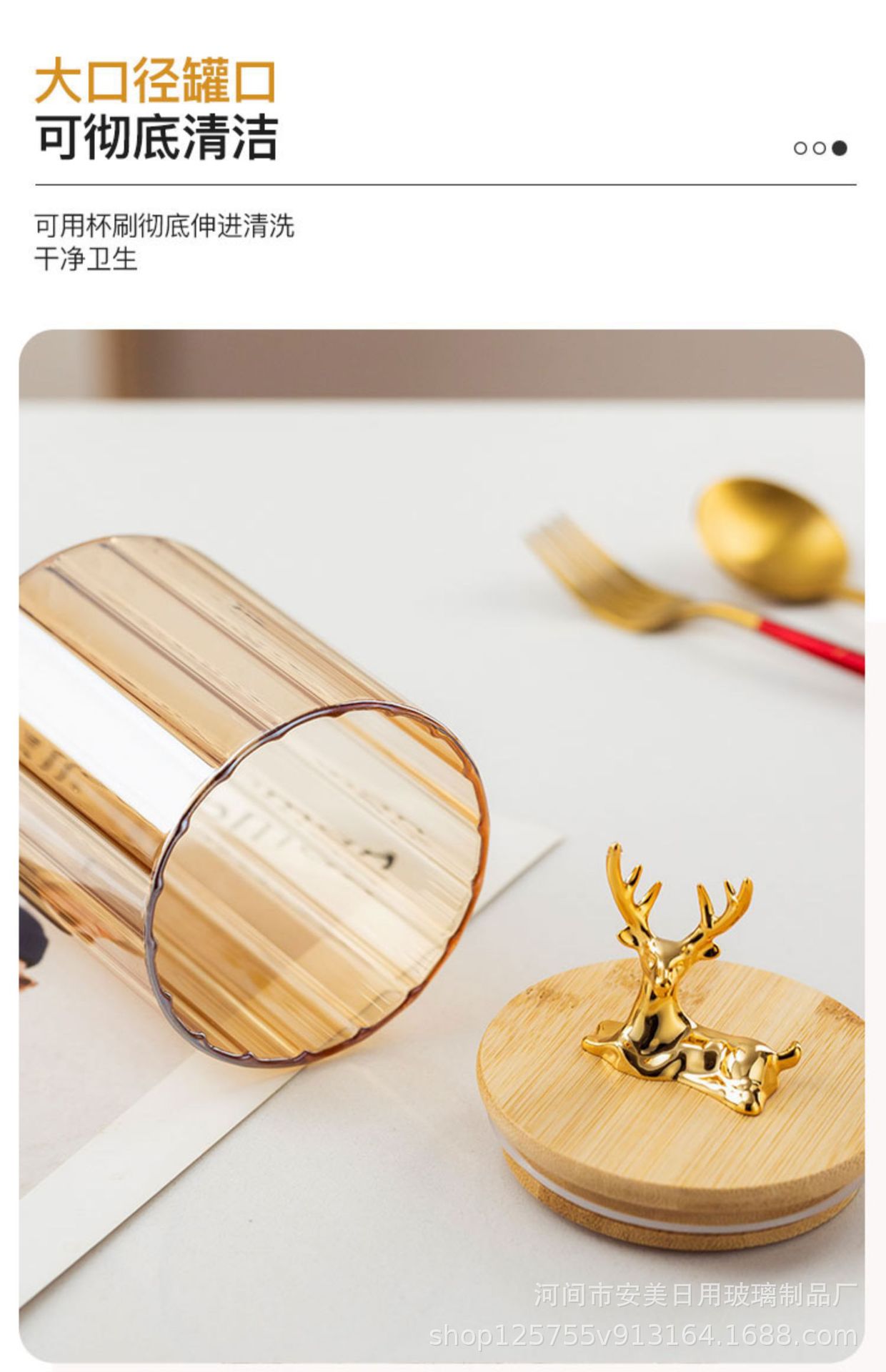 玻璃储物罐跨境小麋鹿收纳罐竖纹琥珀色高硼硅茶叶罐竹盖密封罐