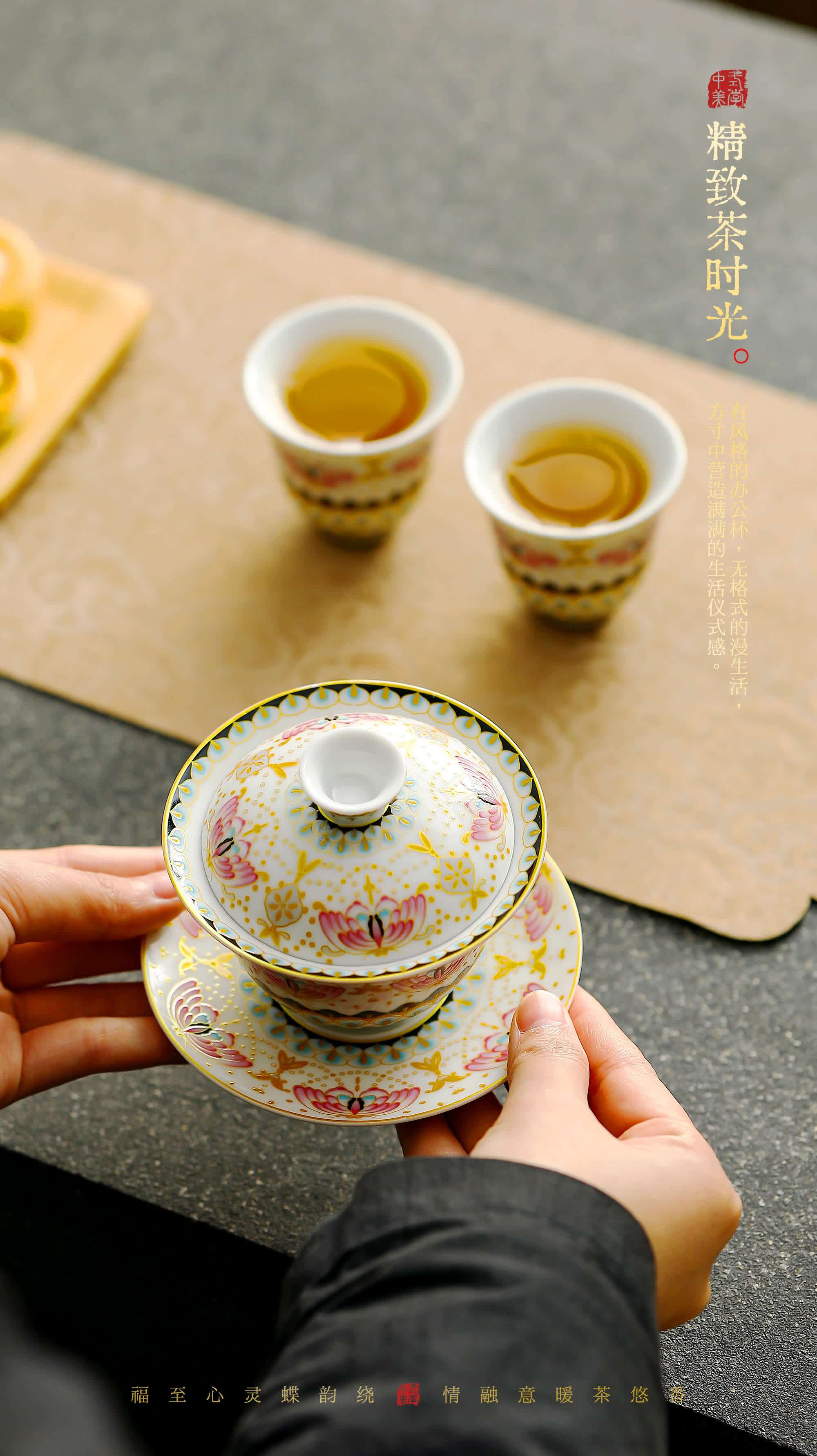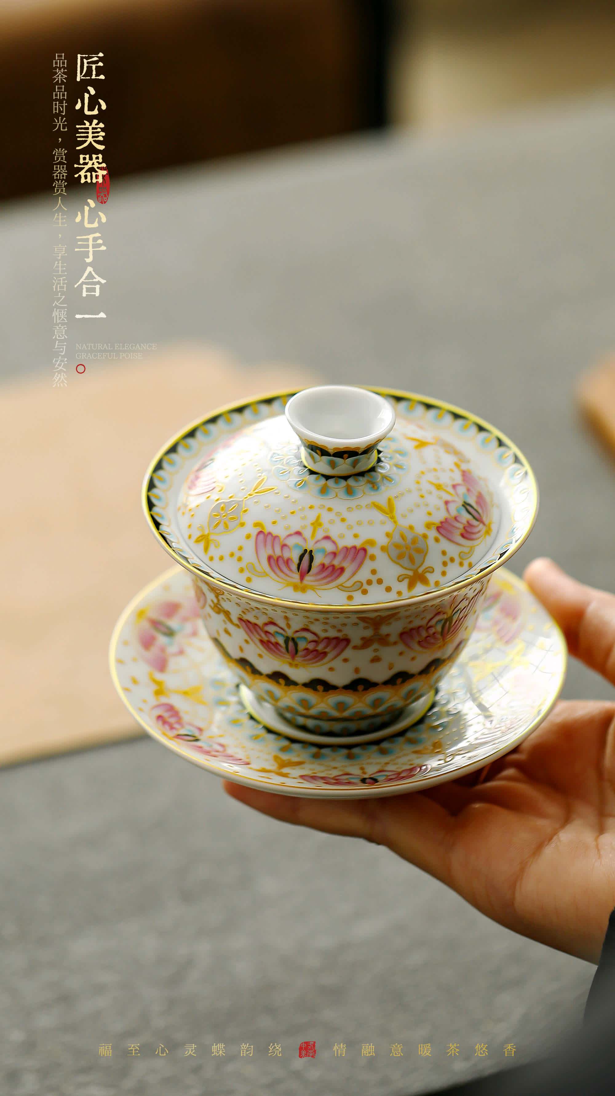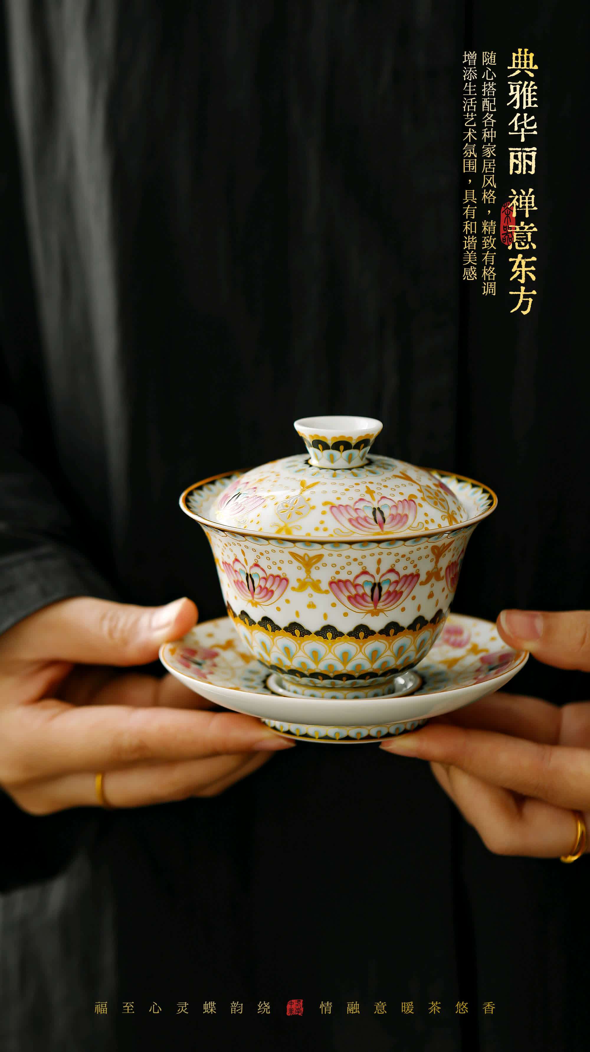 景德镇陶瓷原创系列手工珐琅彩三才盖碗精美礼盒送礼乔迁套装