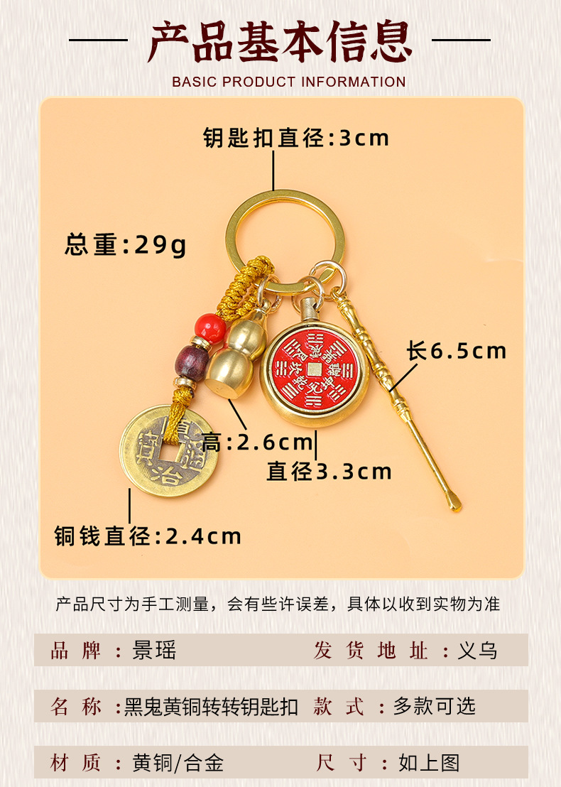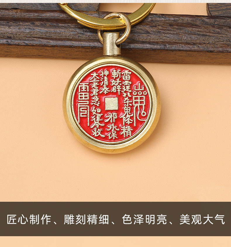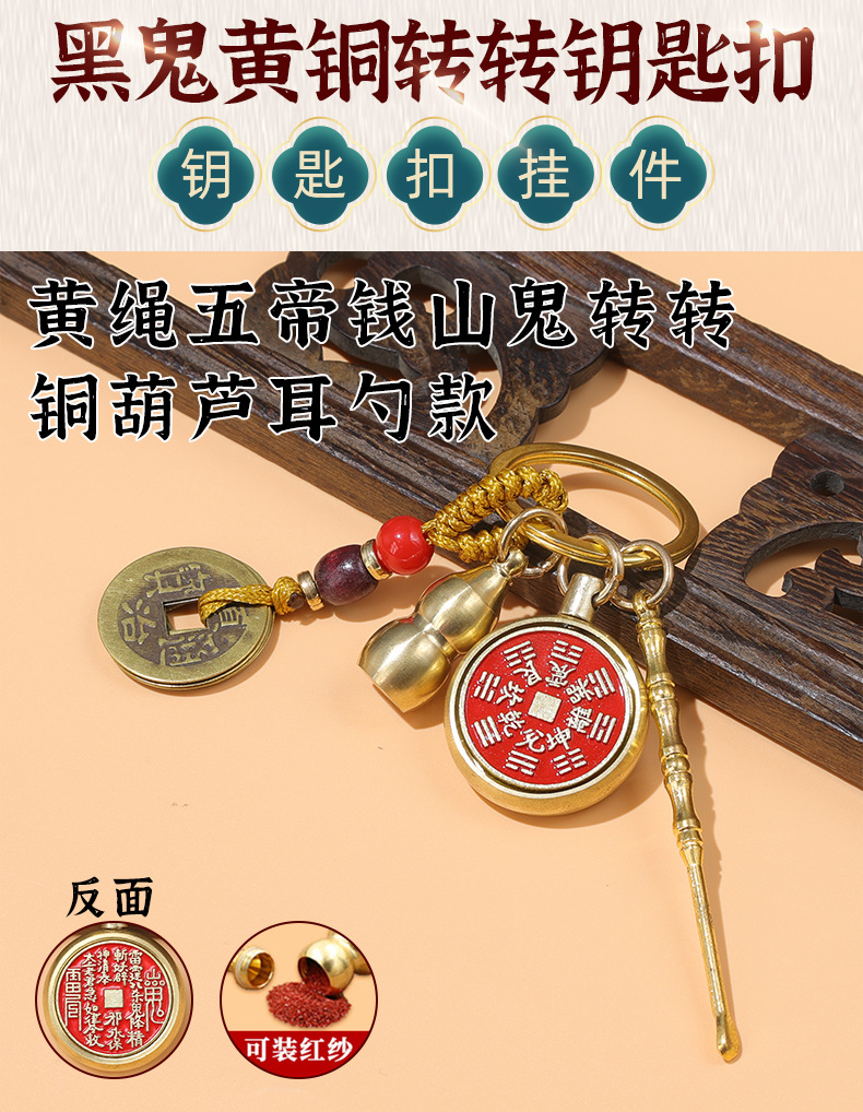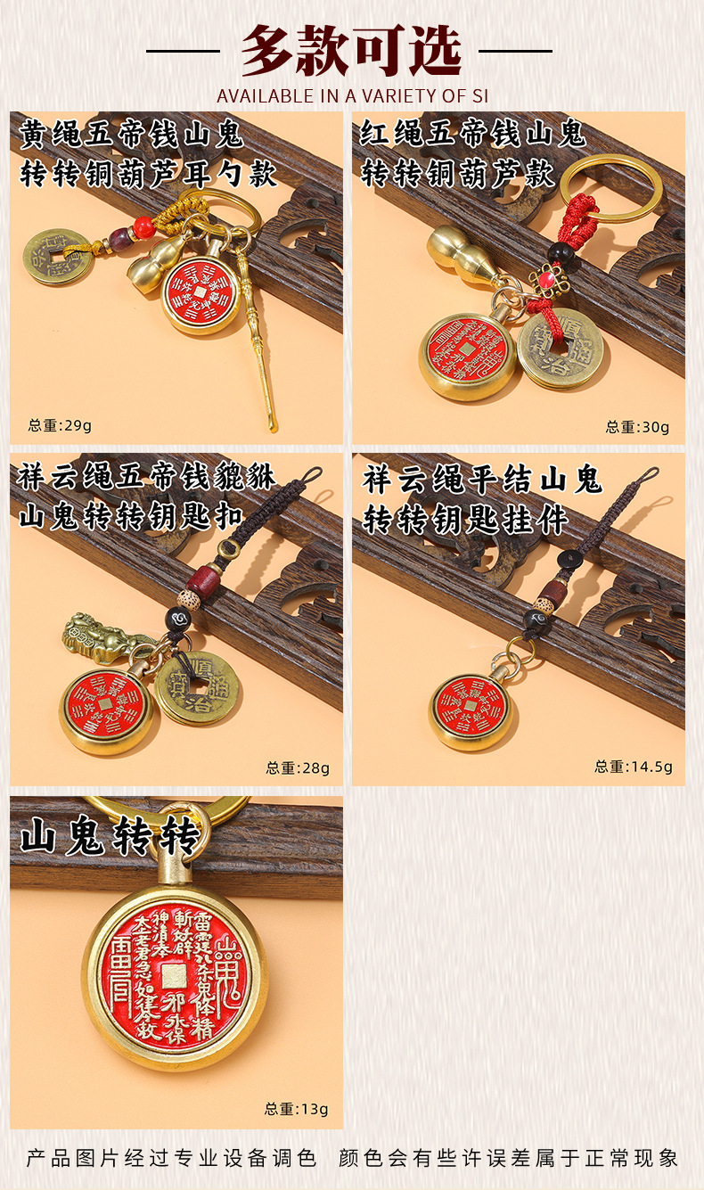 黄铜山鬼花钱钥匙扣五帝钱山鬼转转朱砂钥匙挂件祥云五帝铜钱挂件