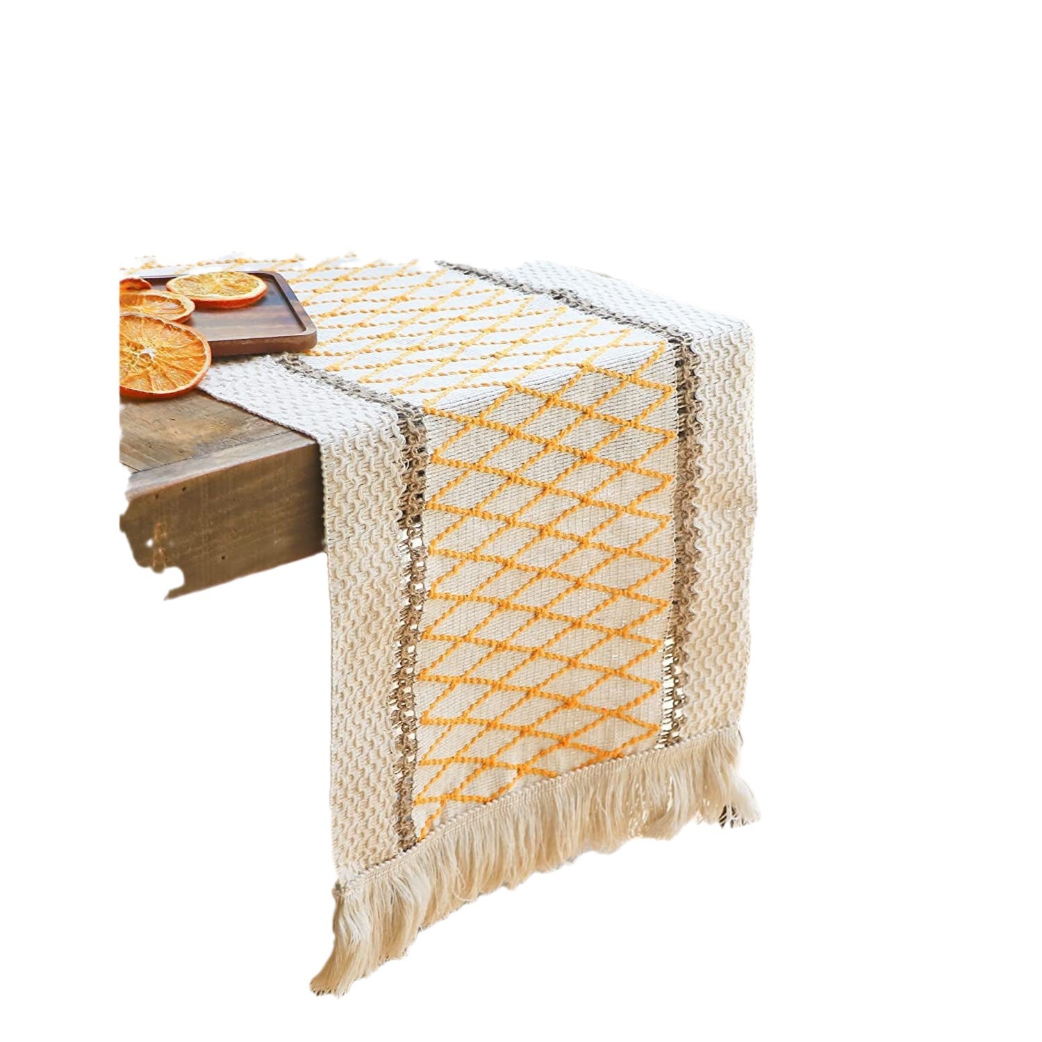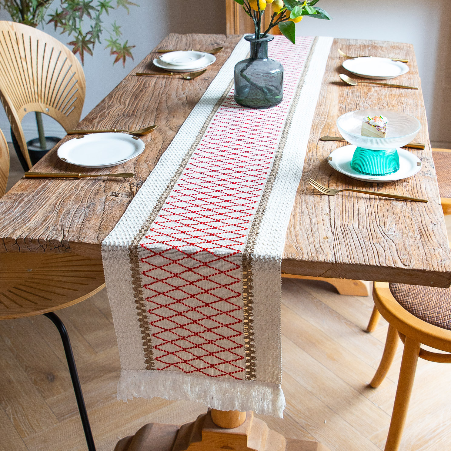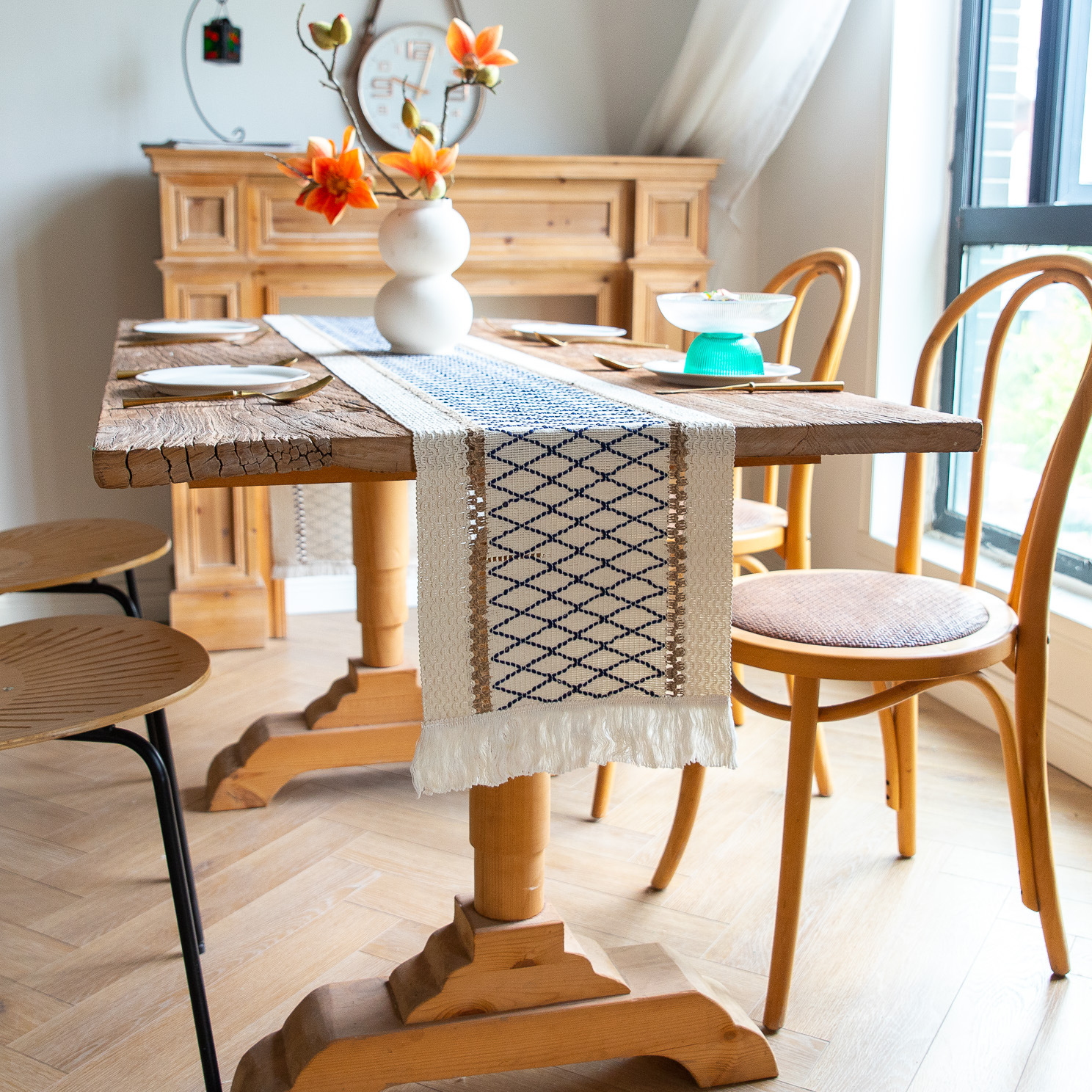 亚马逊跨境桌旗棉麻拼接带流苏节日婚宴装饰长条布双色棉线桌旗