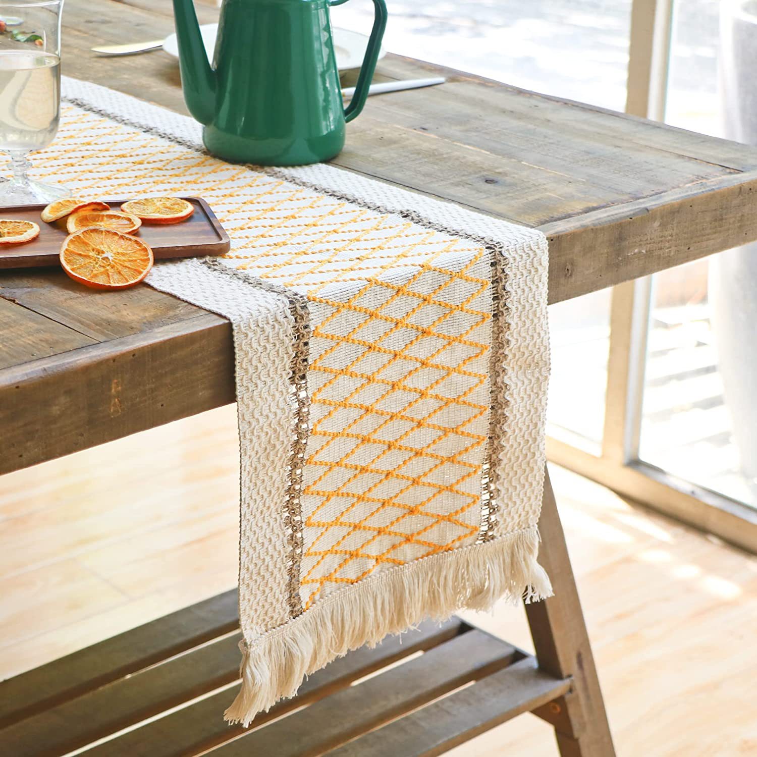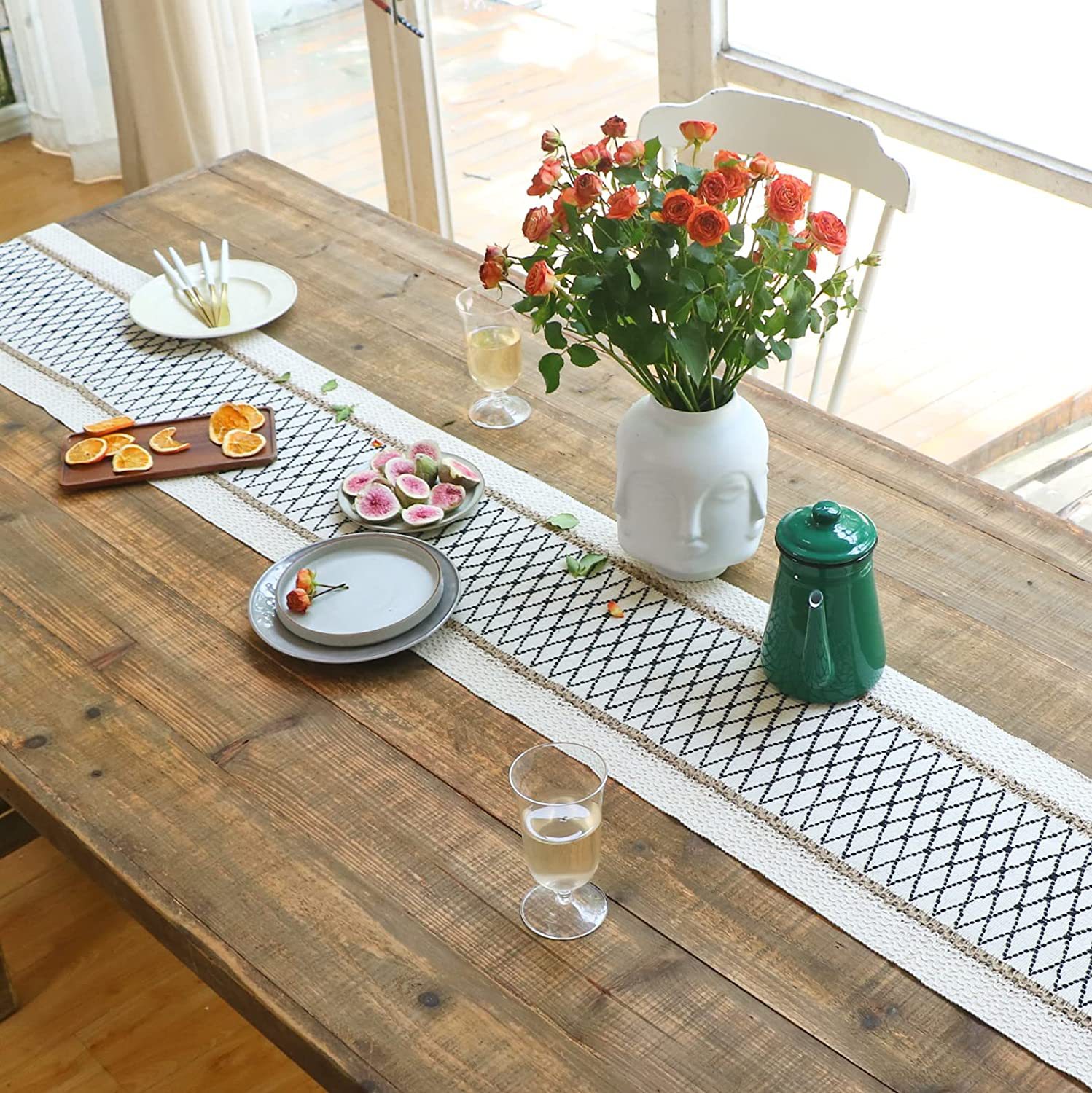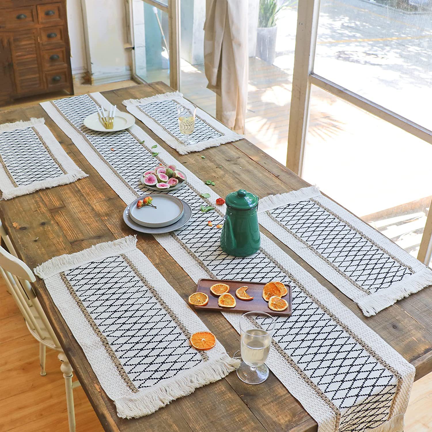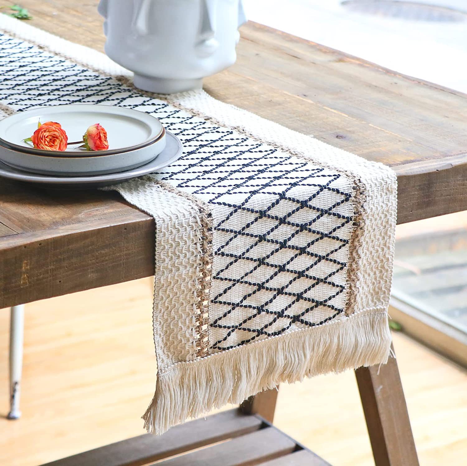 亚马逊跨境桌旗棉麻拼接带流苏节日婚宴装饰长条布双色棉线桌旗