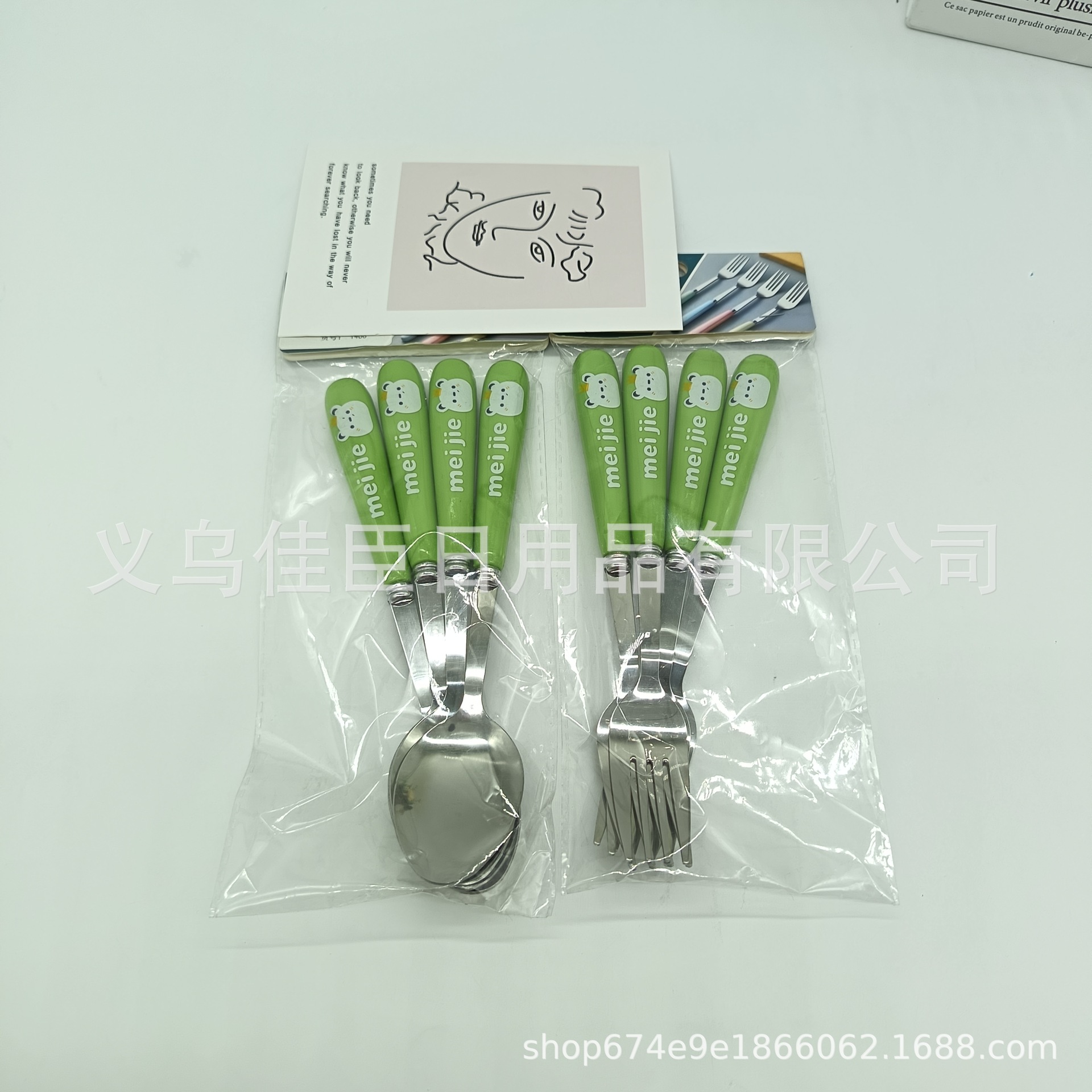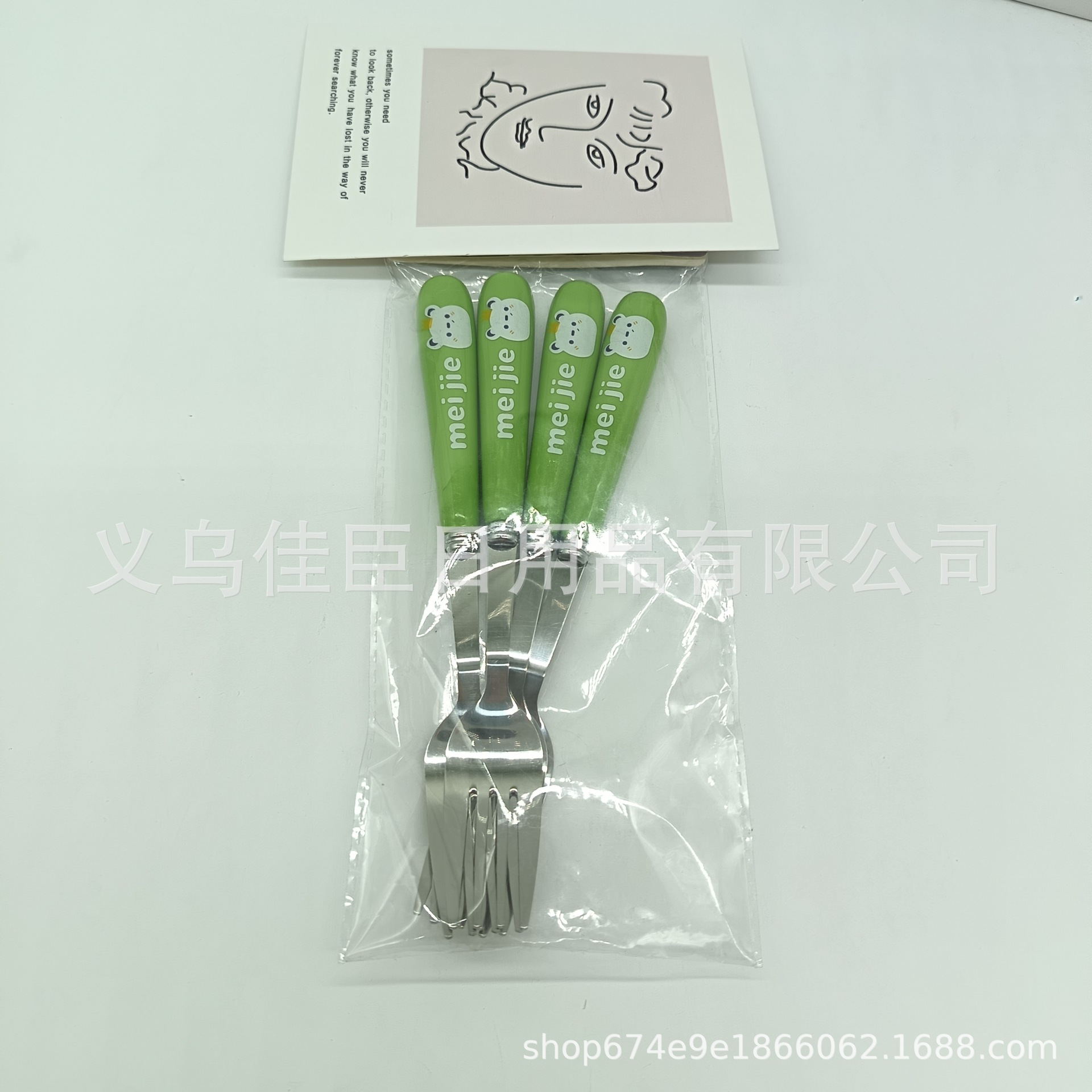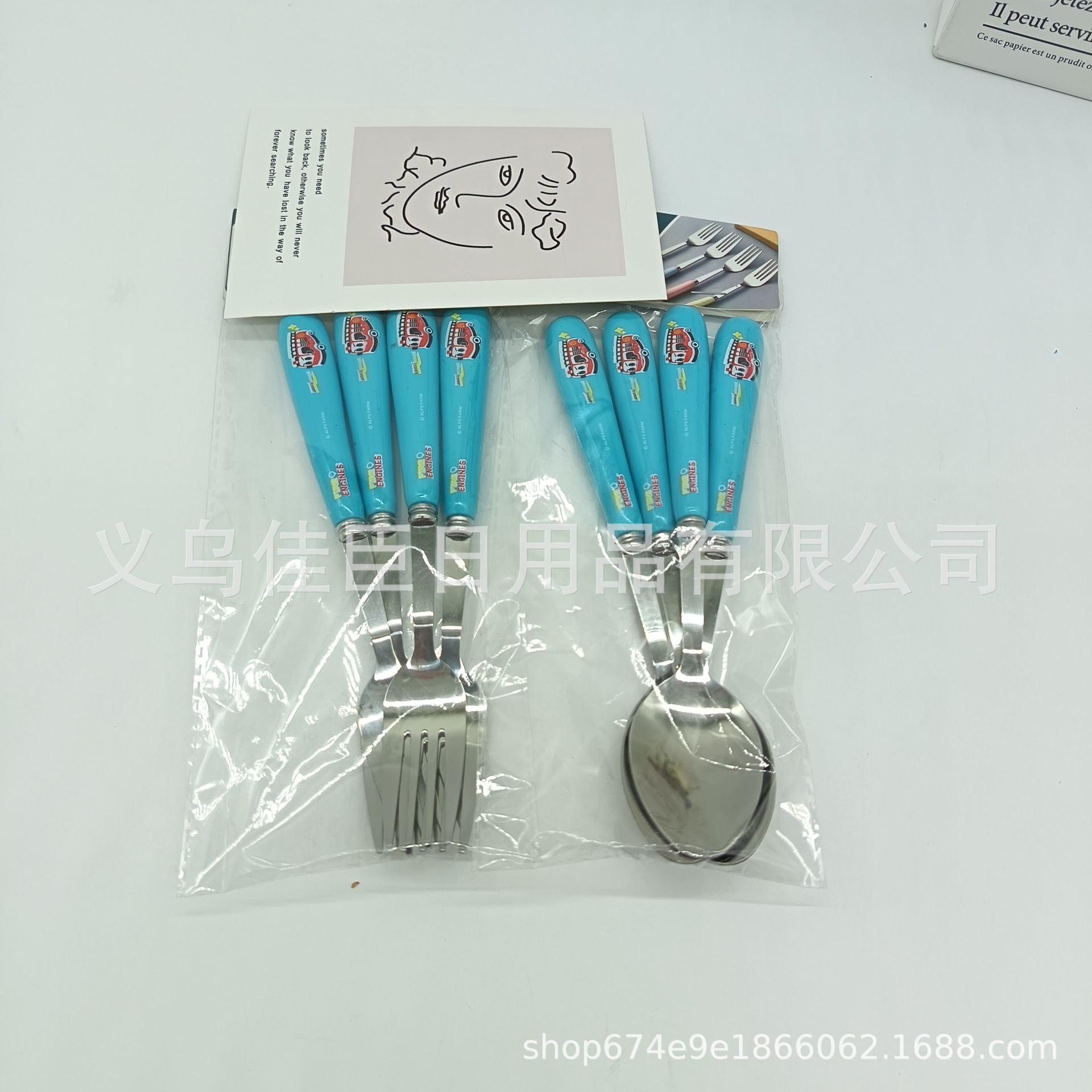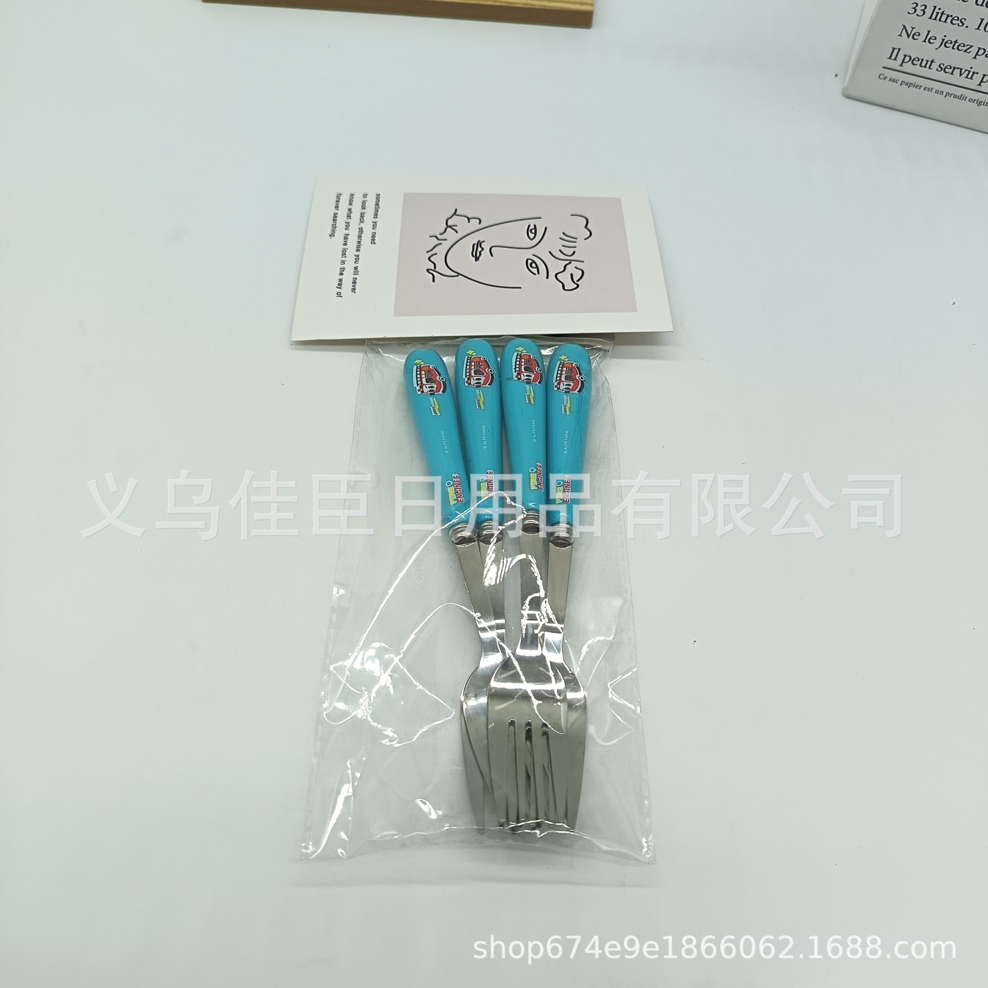 跨境批发热销餐具可爱图案叉子勺子不锈钢便携家用4pcs圆柄手柄