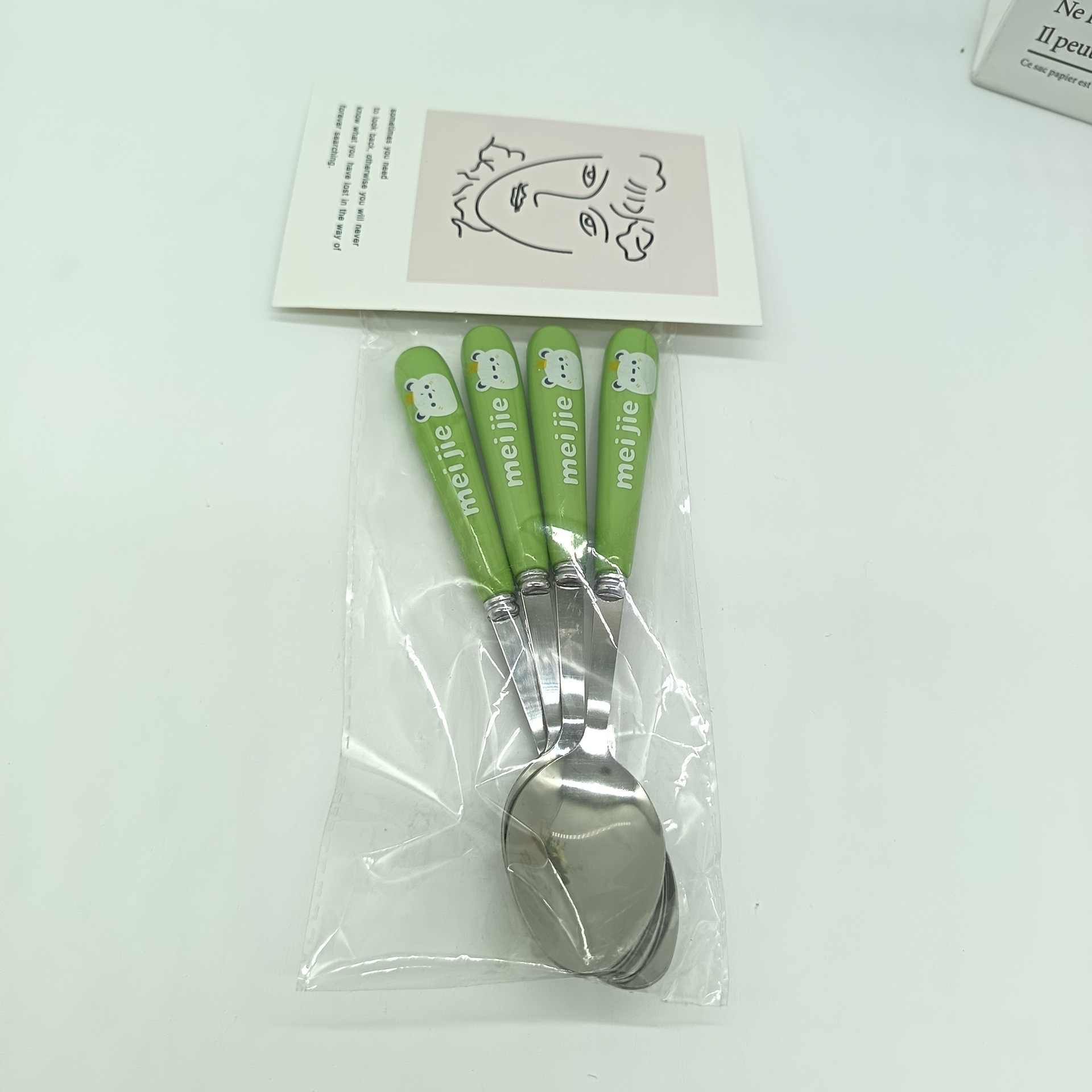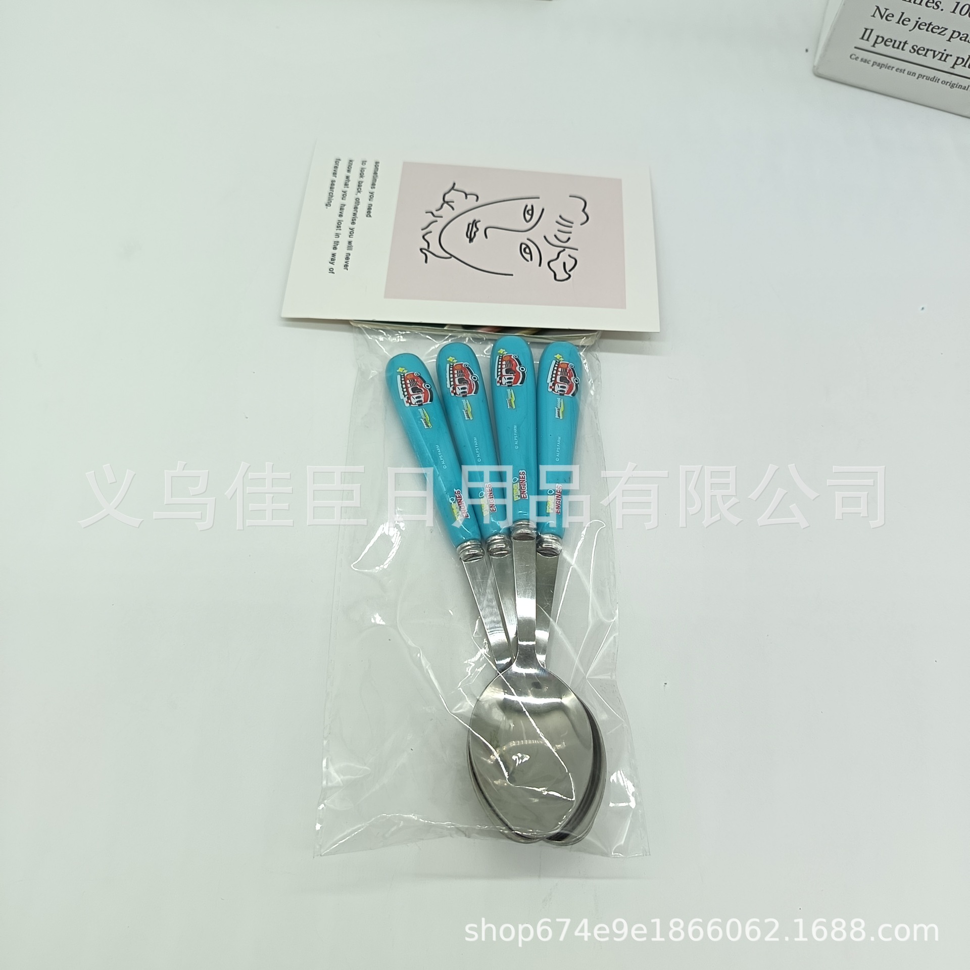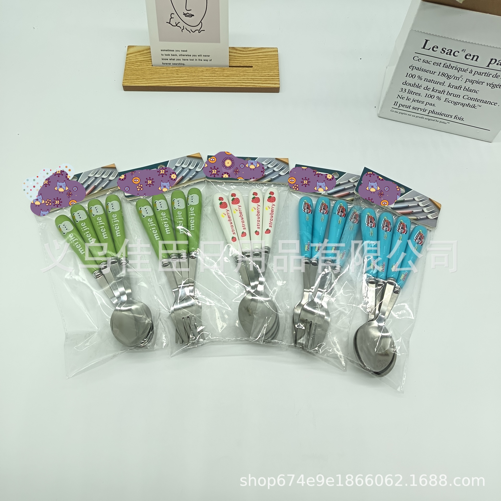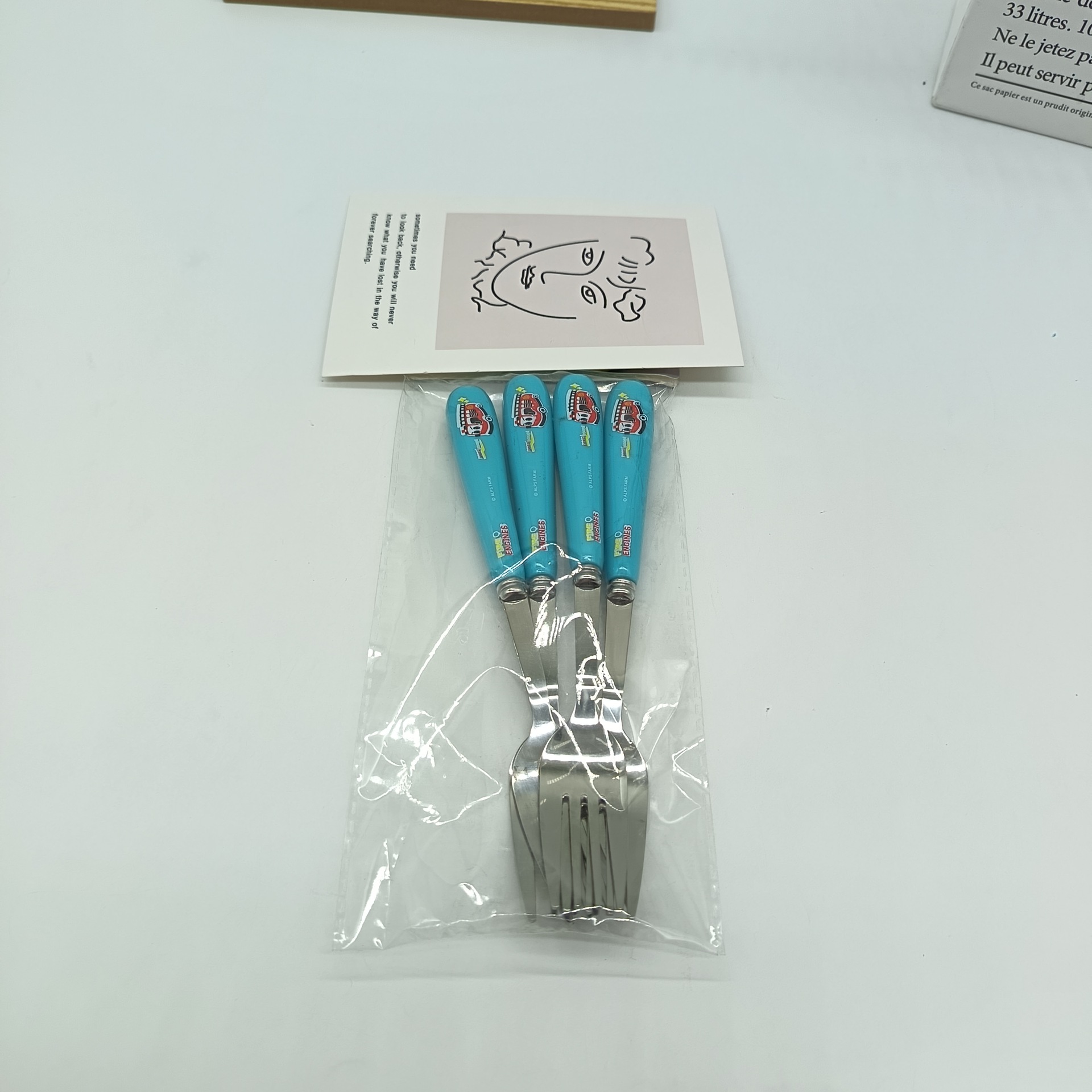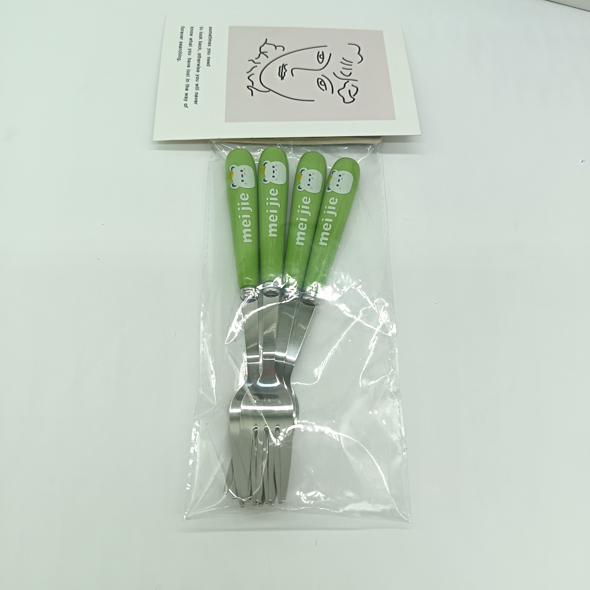 跨境批发热销餐具可爱图案叉子勺子不锈钢便携家用4pcs圆柄手柄