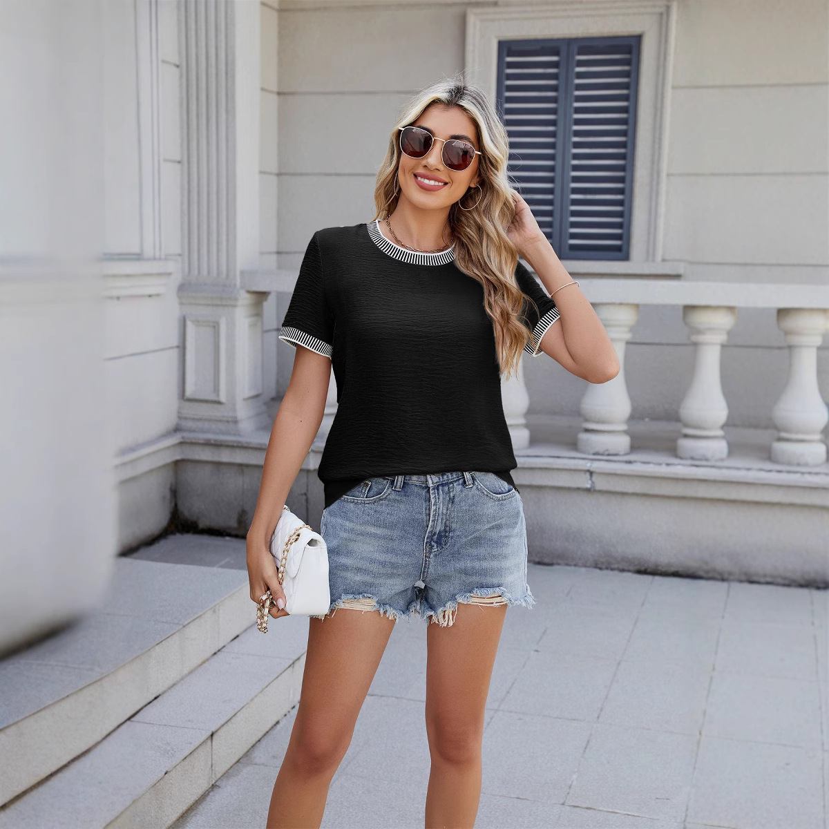 亚马逊跨境欧美外贸2025春夏新款黑白螺纹套头圆领短袖纯色女装