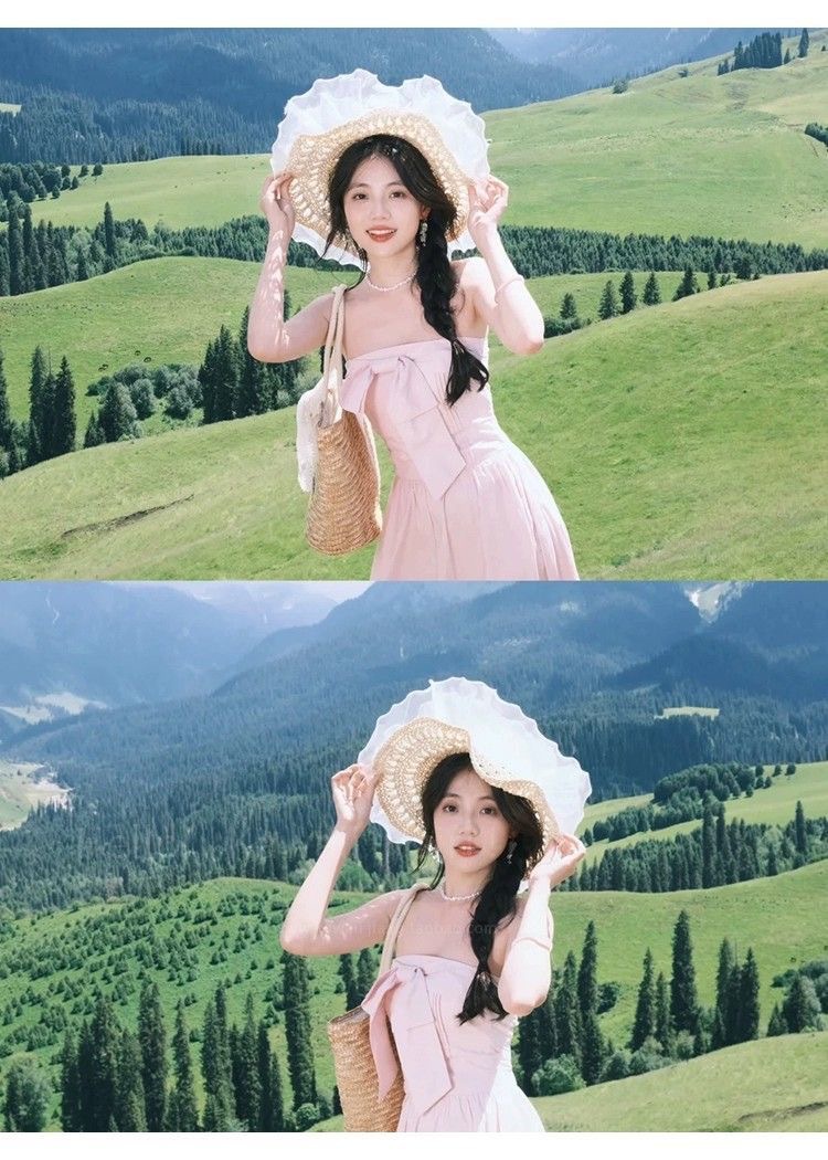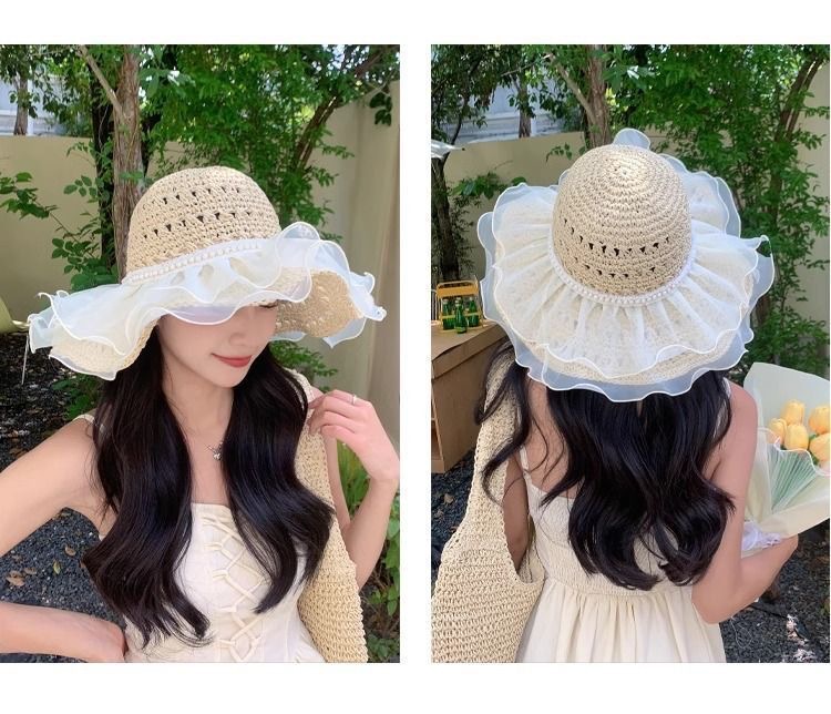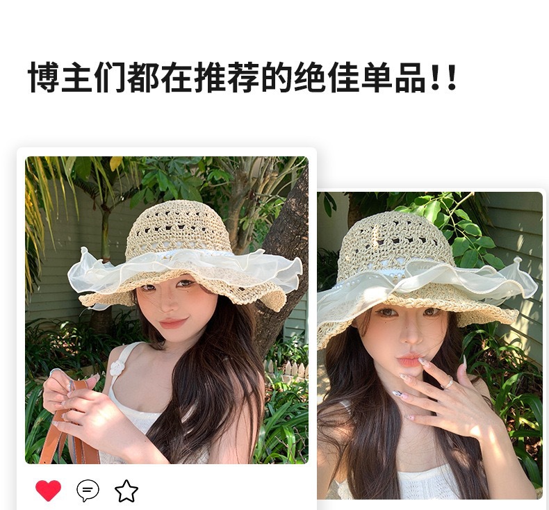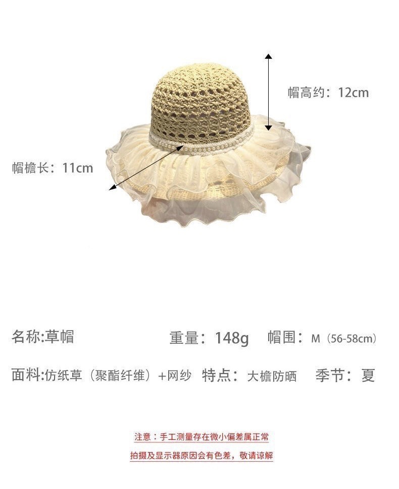 夏季女款大帽檐双层蕾丝草编太阳帽子透气草帽海边遮全脸遮阳防晒