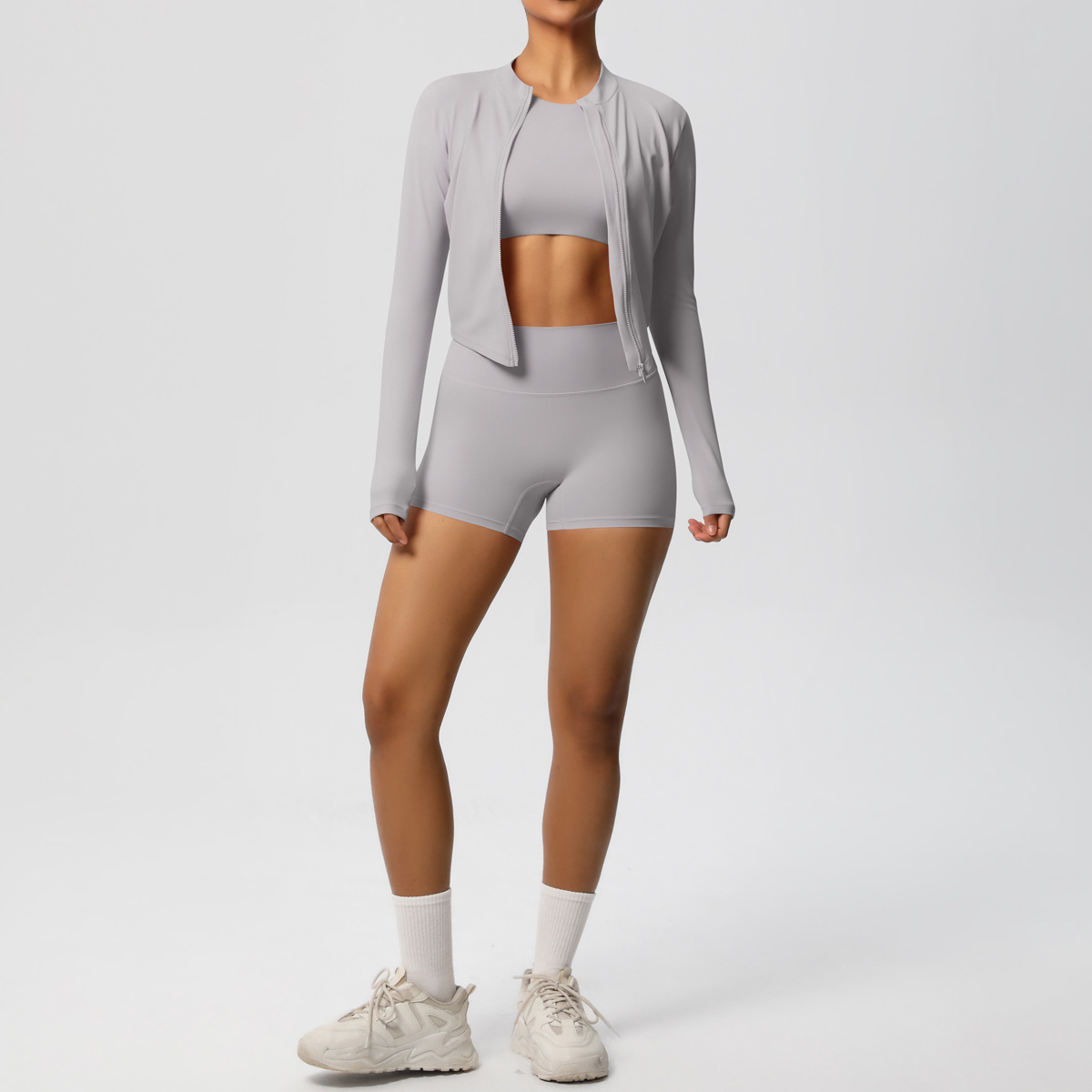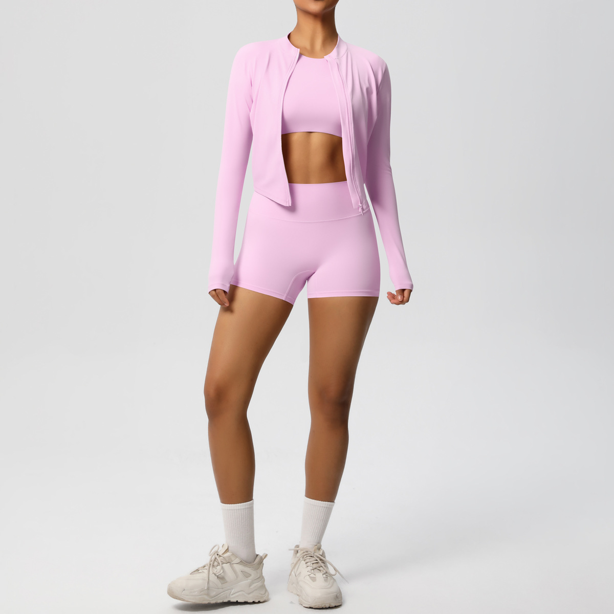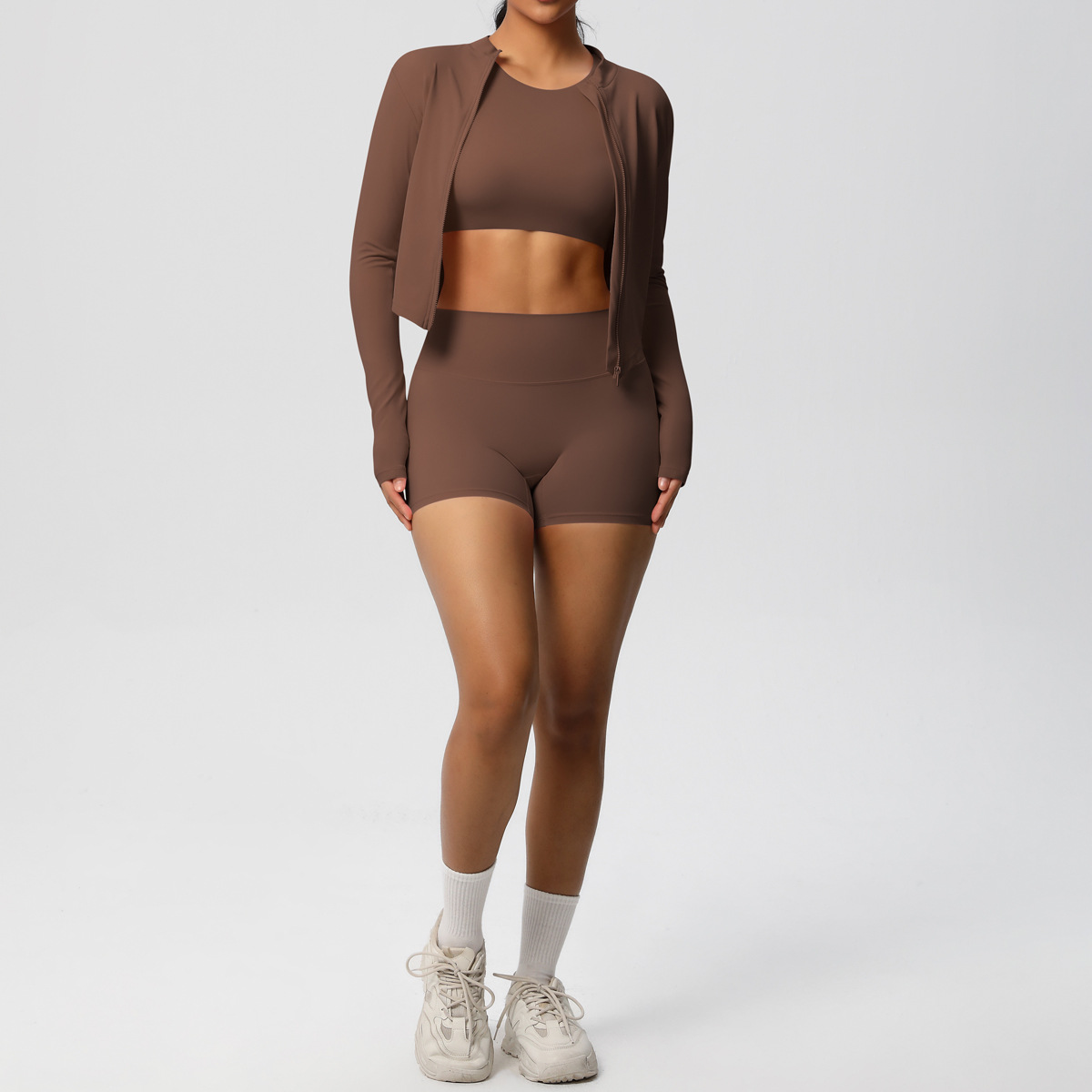 新款跨境纯色裸感磨毛长袖外套紧身三件套运动跑步健身瑜伽服套装