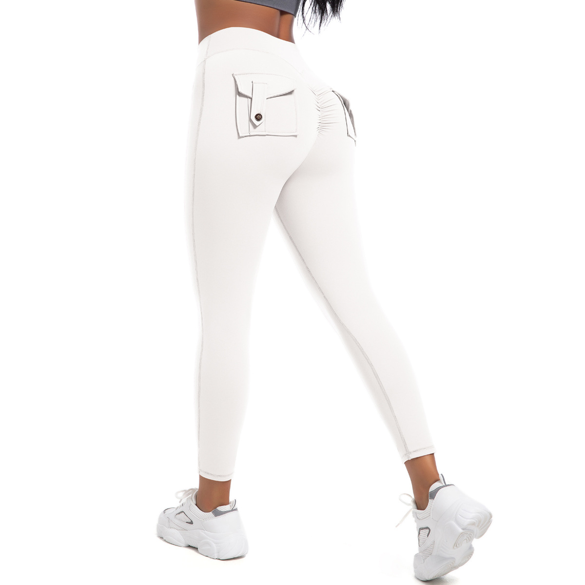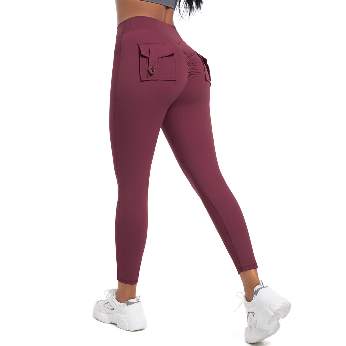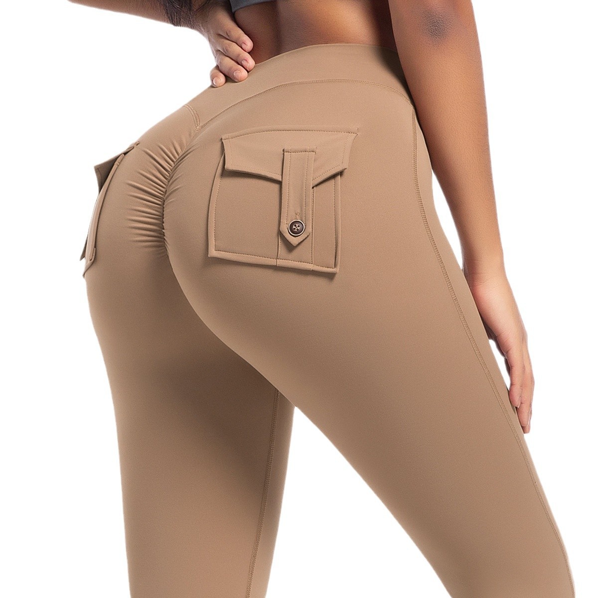 新款蜜桃工装紧身纽扣口袋健身裤高腰弹力提臀速干运动跑步瑜伽裤