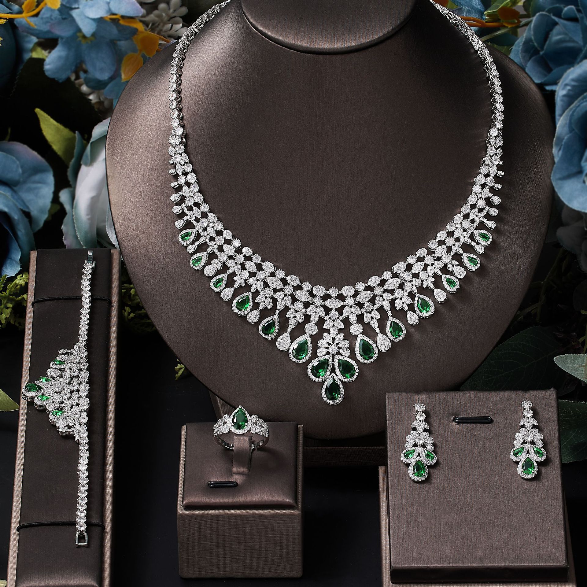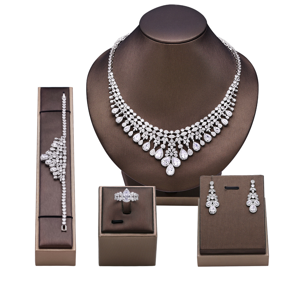 韩版时尚大方新娘婚礼礼服配饰AAA锆石项链耳环戒指手链首饰套装