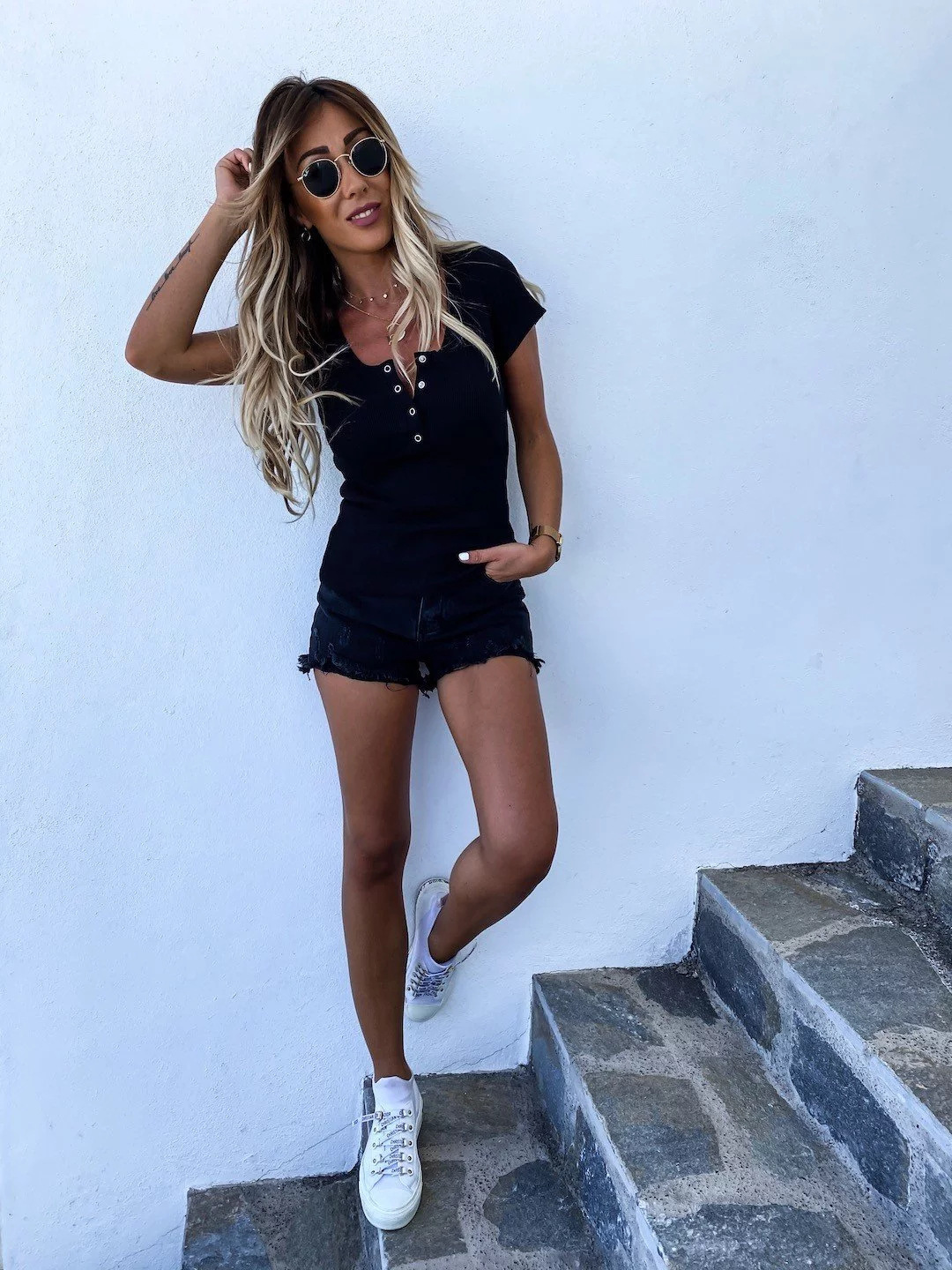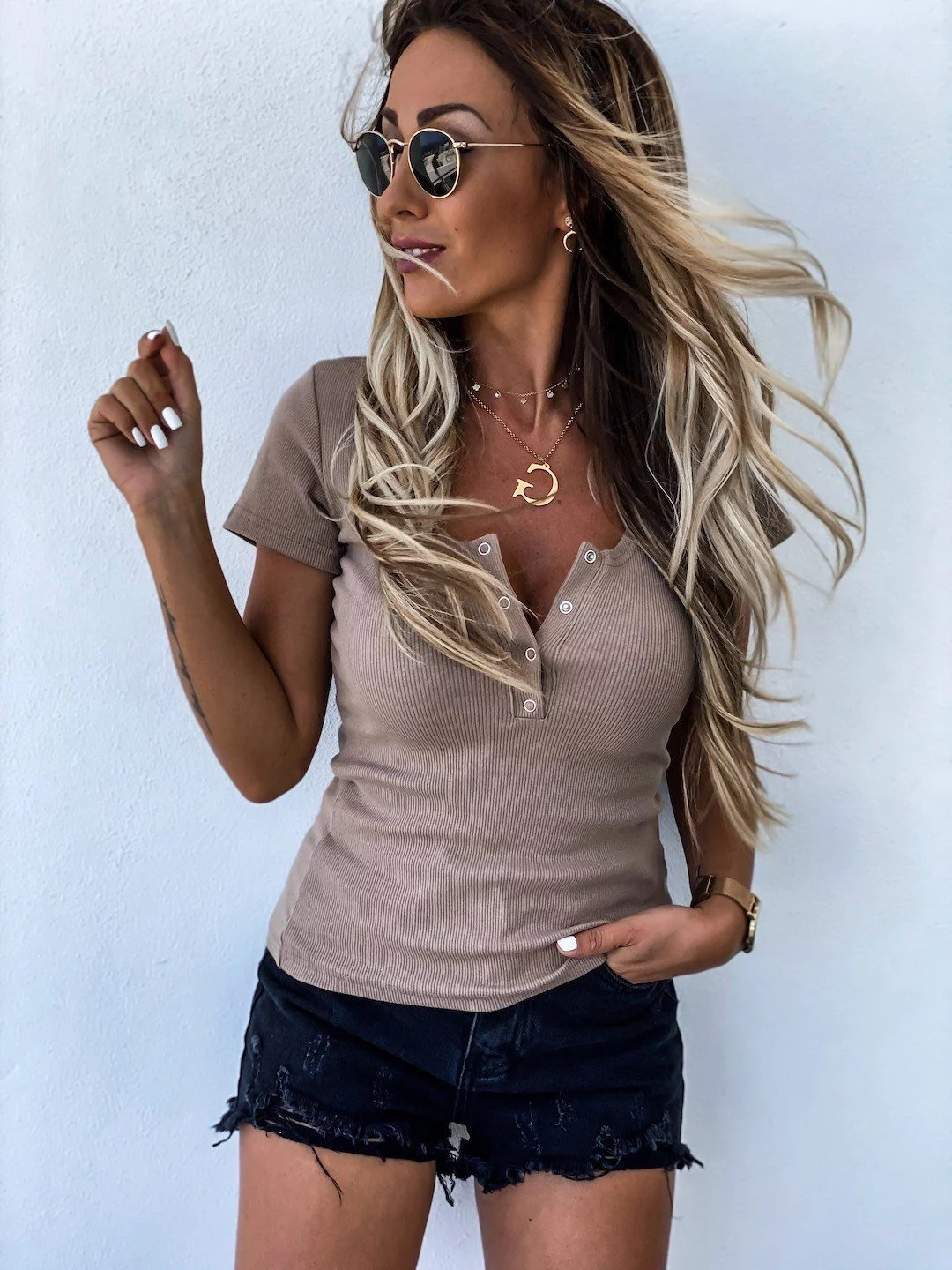亚马逊欧美春夏季休闲性感短袖女装纯色修身纽扣V领T恤时尚上衣女