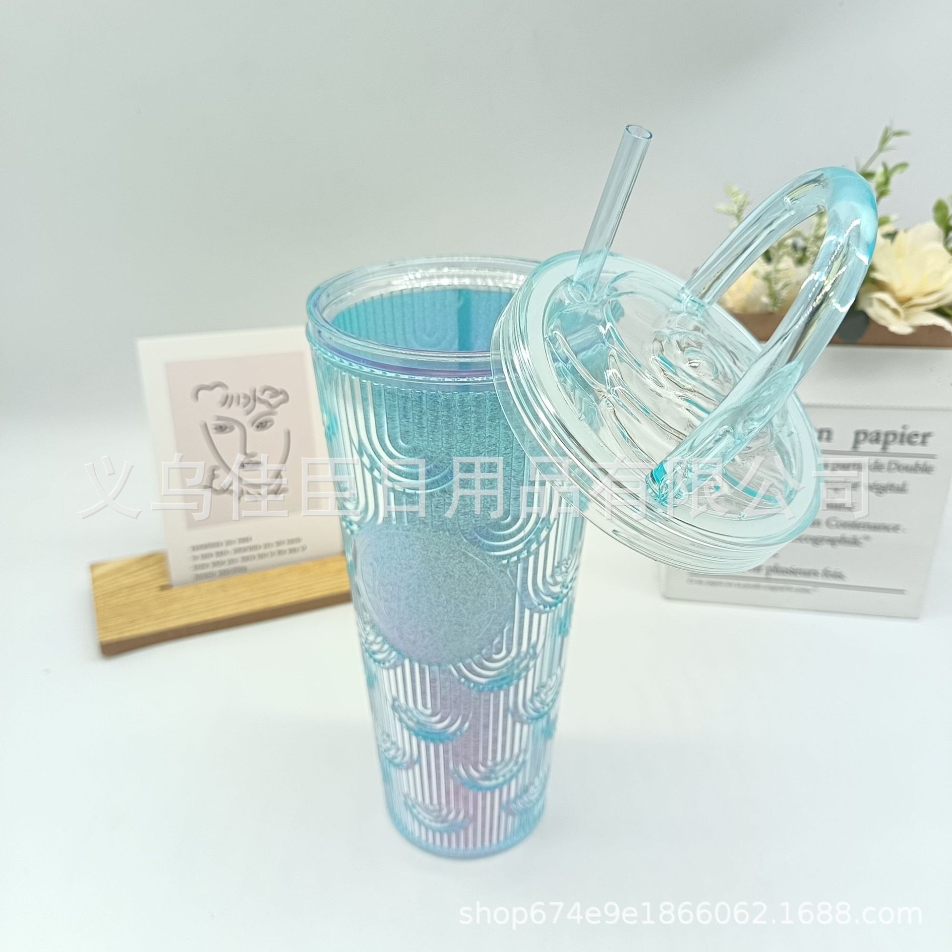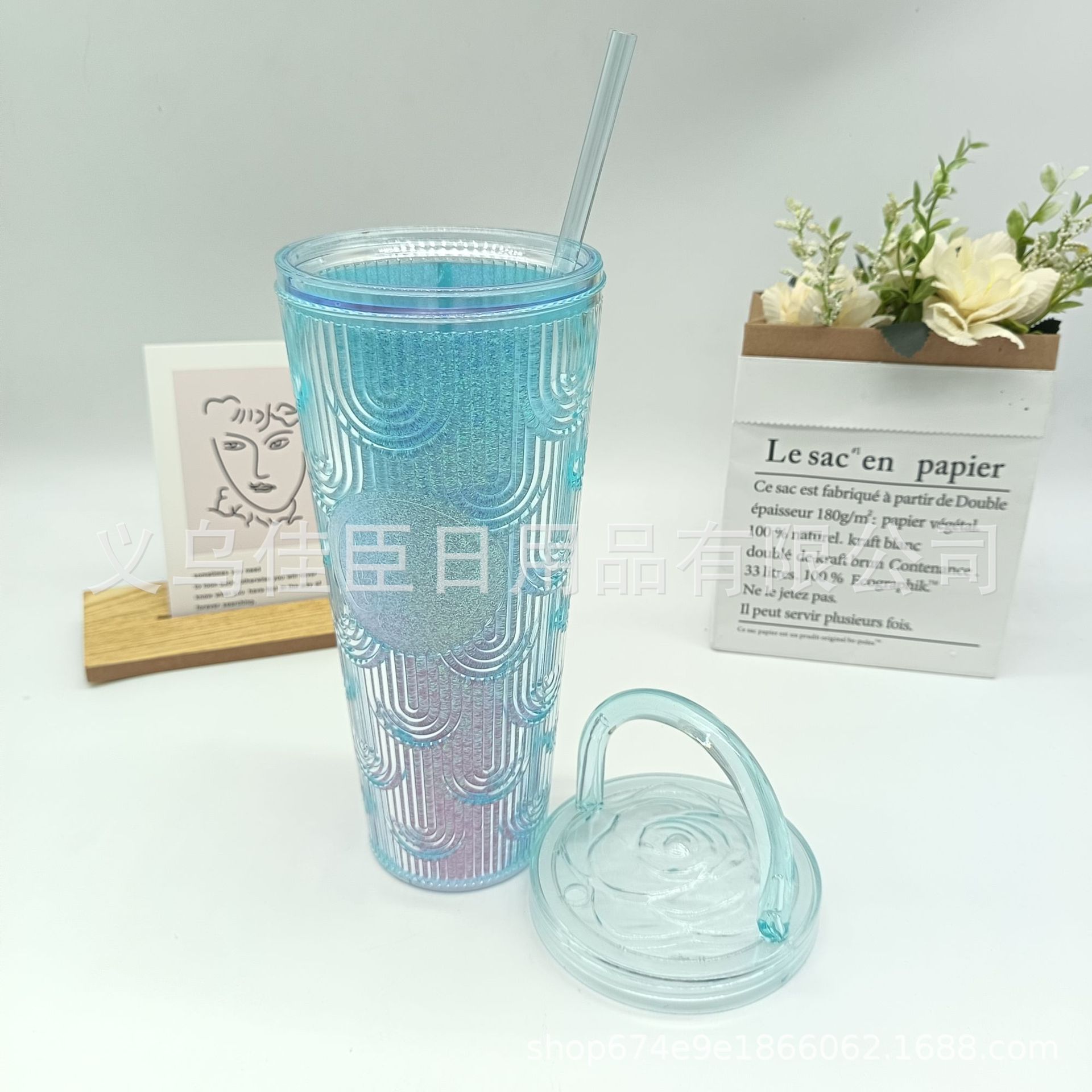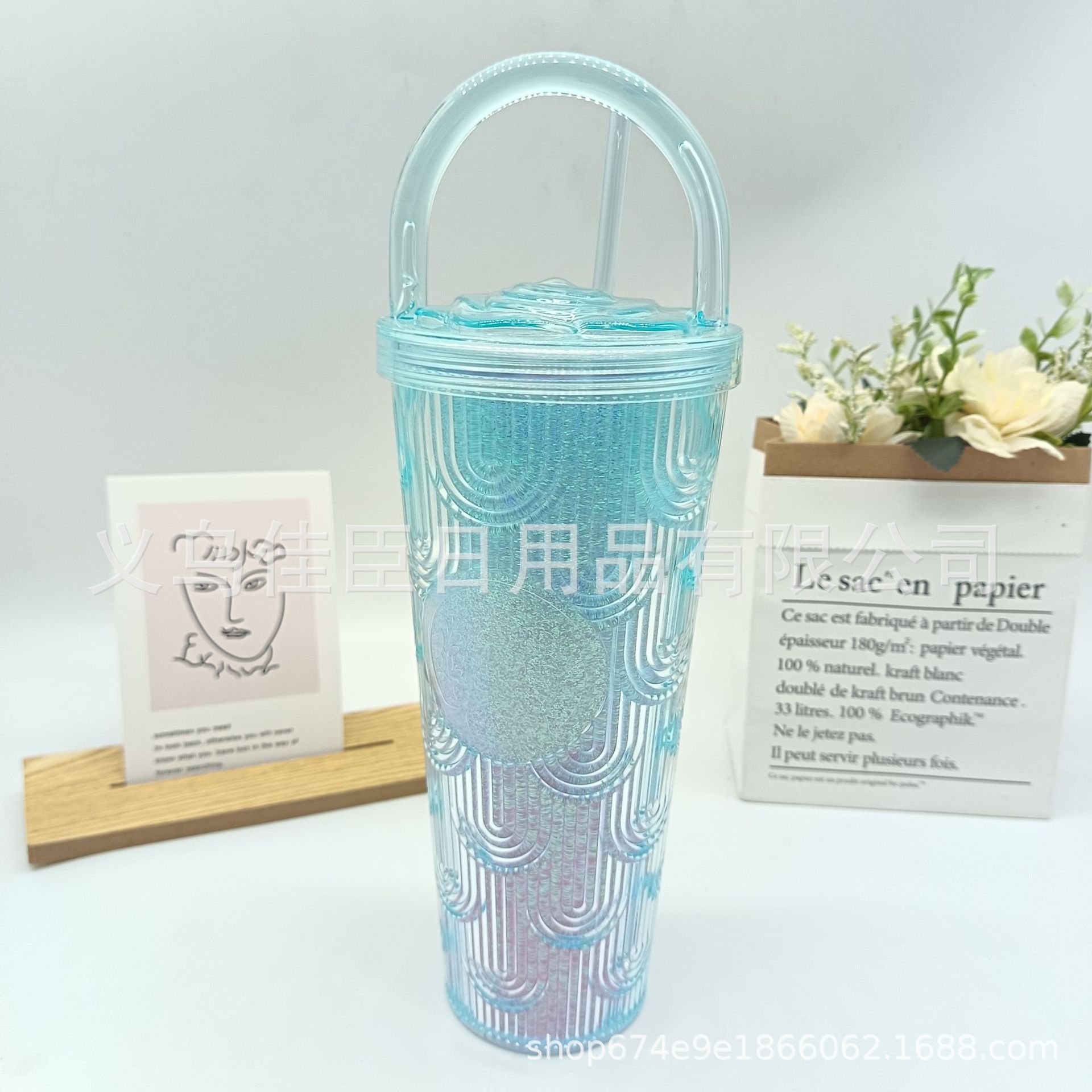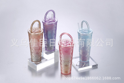 亚马逊夏季爆款双层塑料吸管杯大容量闪粉炫彩水杯饮料杯手提杯仙