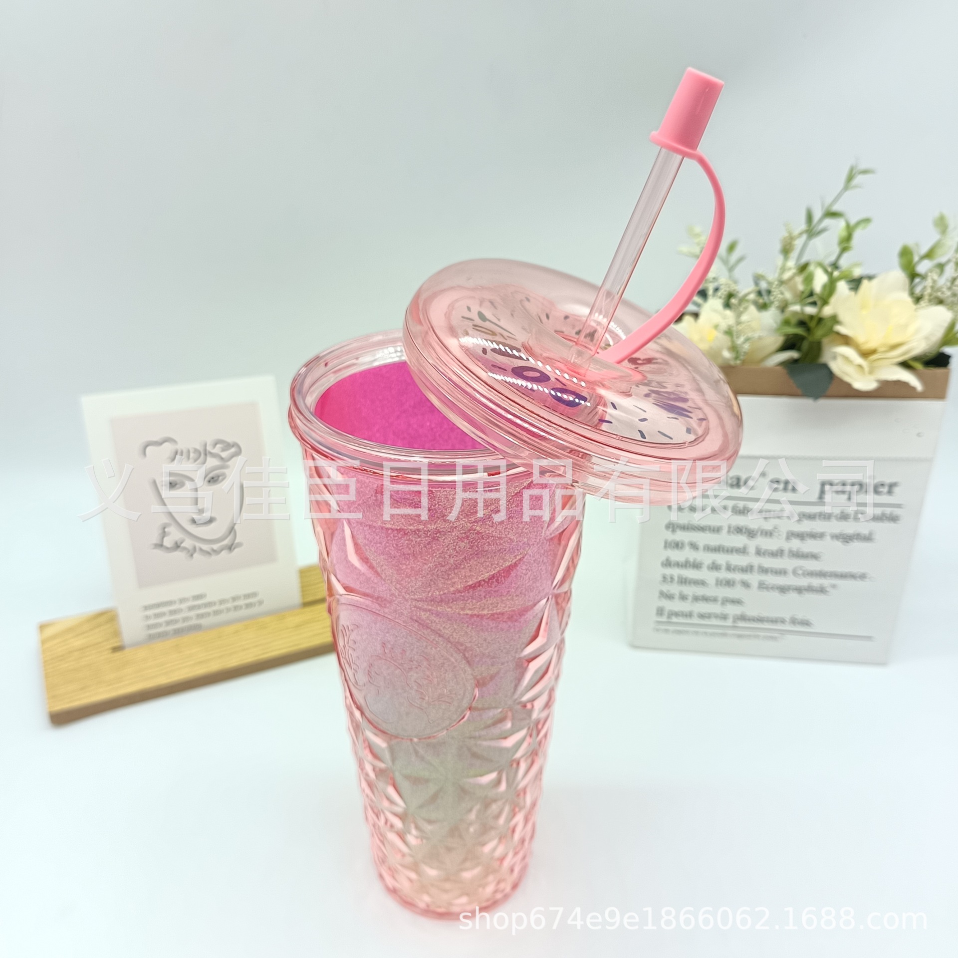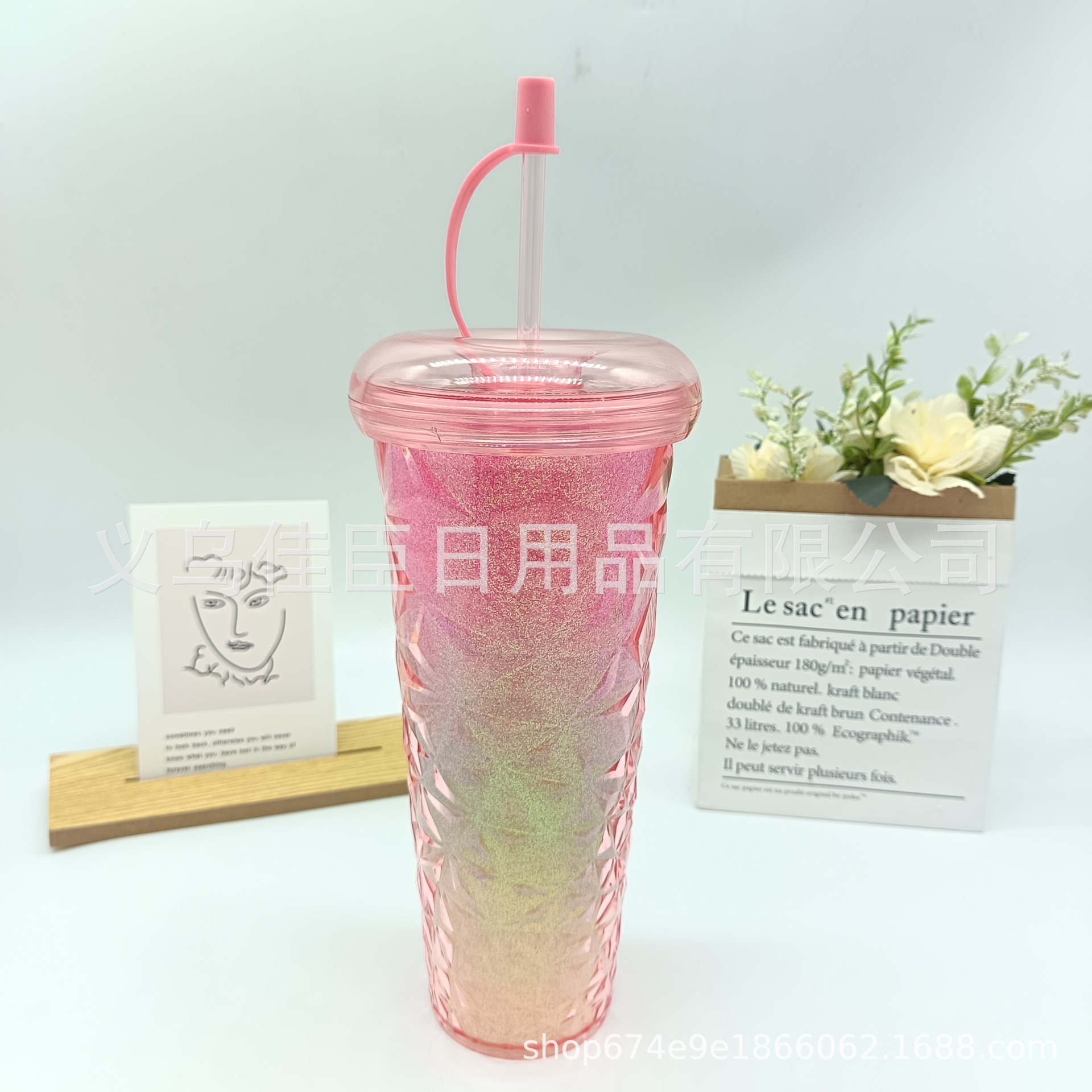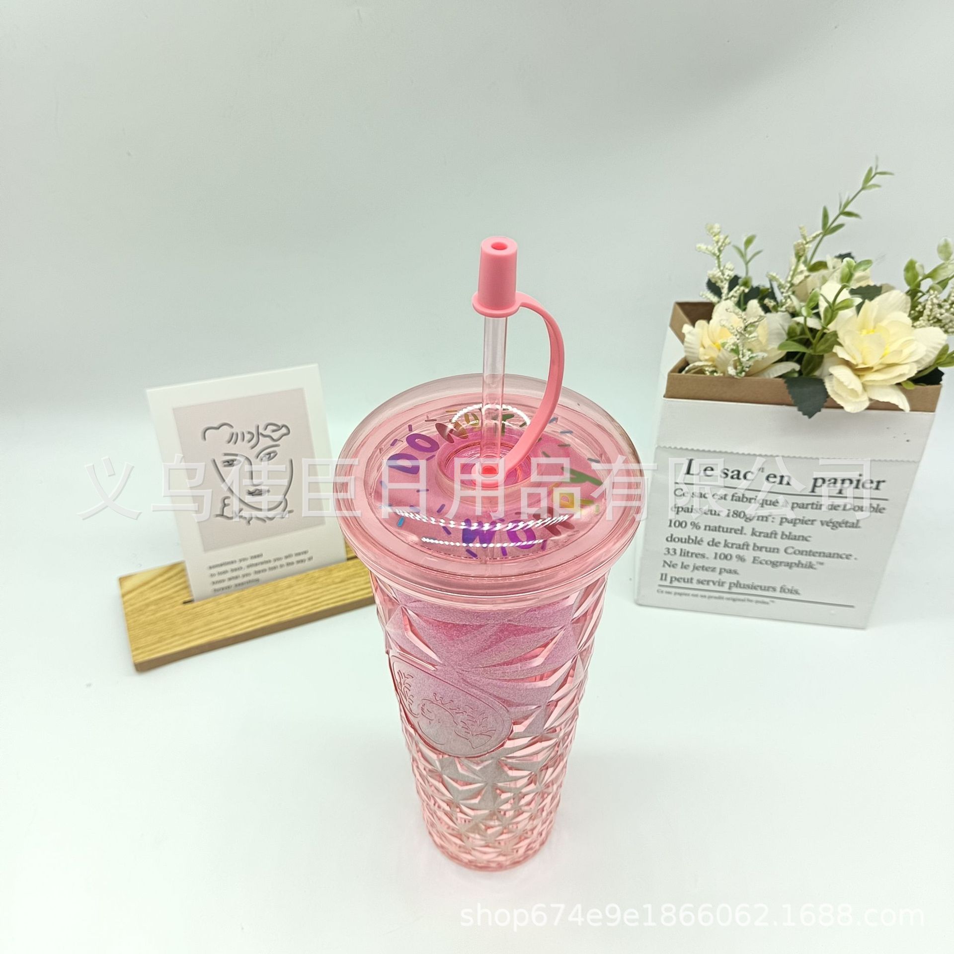 跨境新款闪粉超闪大容量吸管杯渐变彩虹水杯少女心甜甜圈造型杯盖