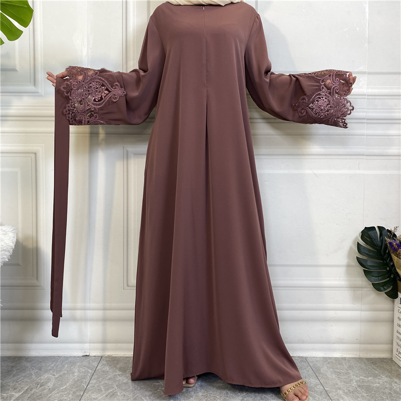 速卖通亚马逊中东迪拜新款纯色带花卉蕾丝拉链连衣裙 6659