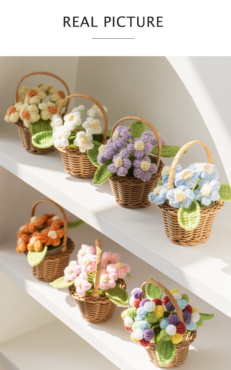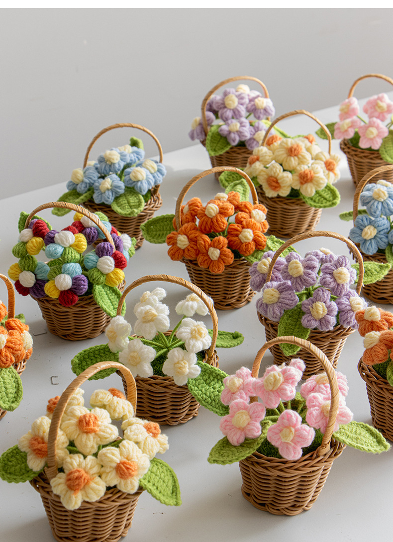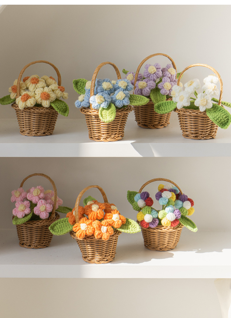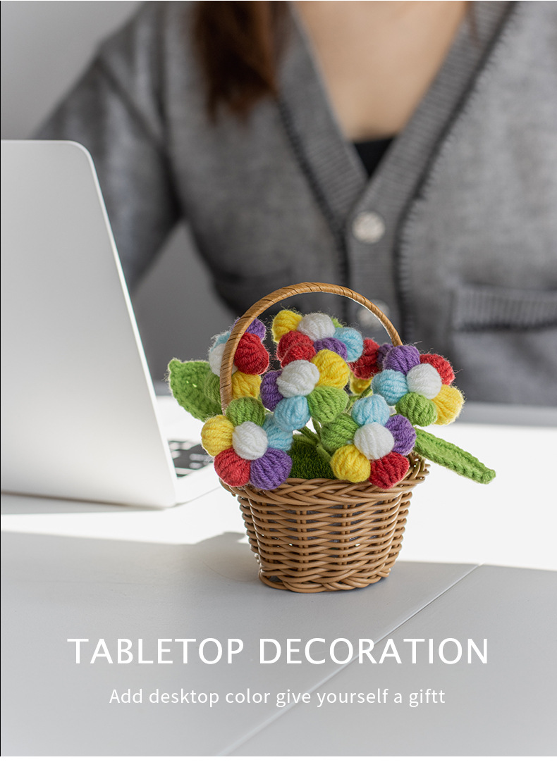 新款小花蓝盆栽手工毛线钩织泡芙小花盆栽桌面装饰摆件针织永生花