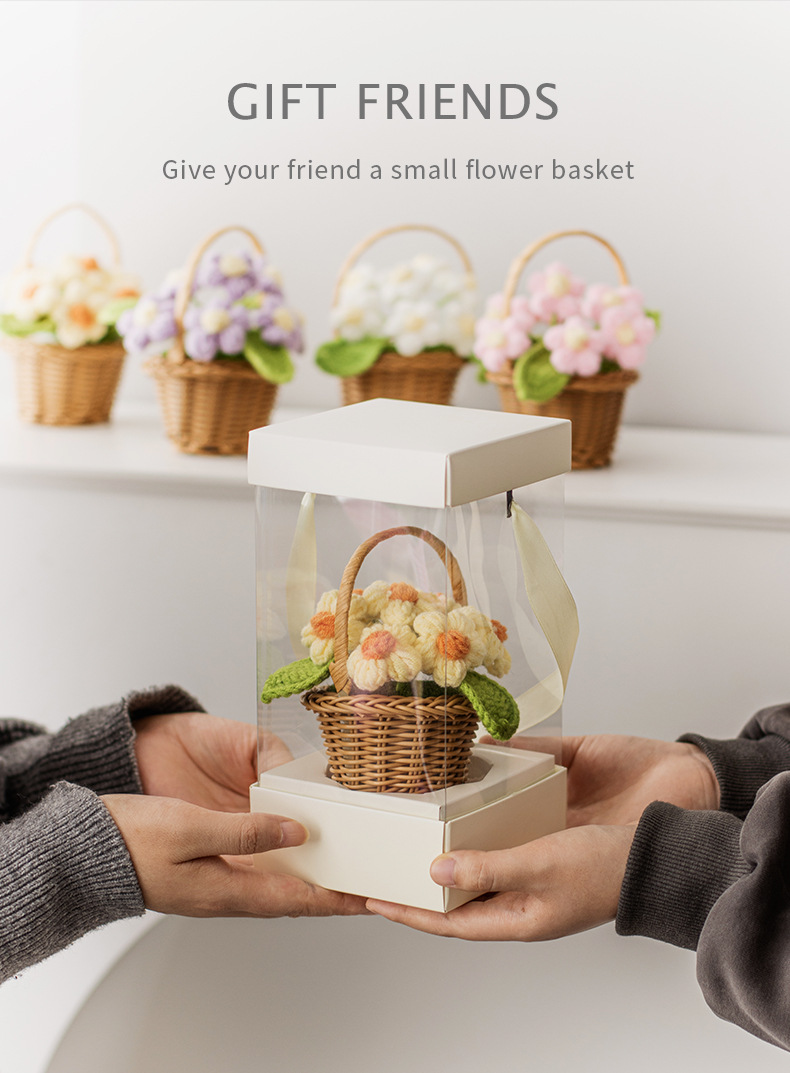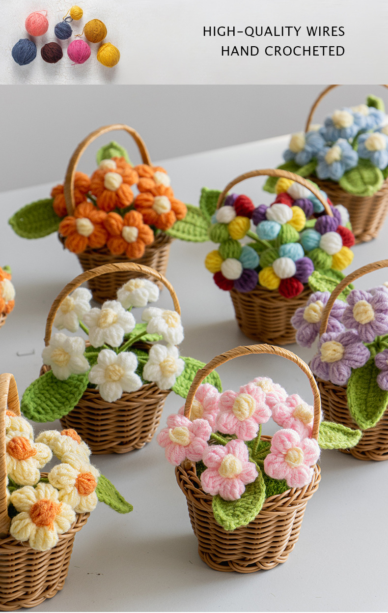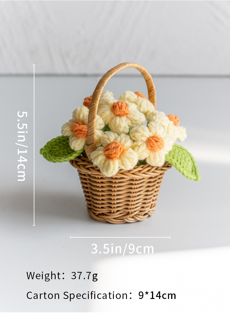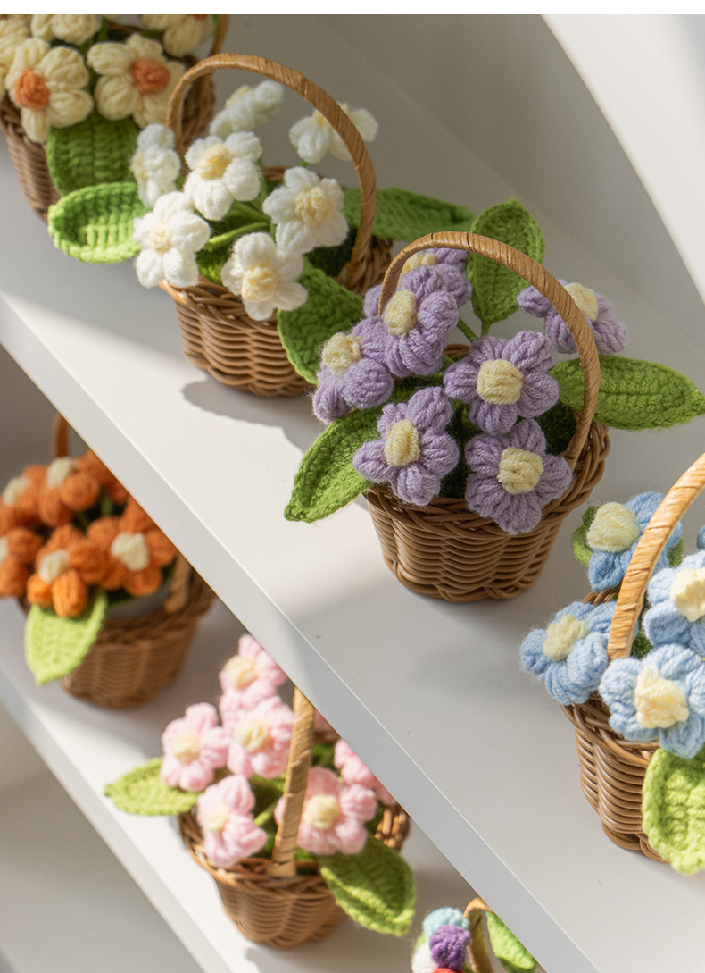 新款小花蓝盆栽手工毛线钩织泡芙小花盆栽桌面装饰摆件针织永生花