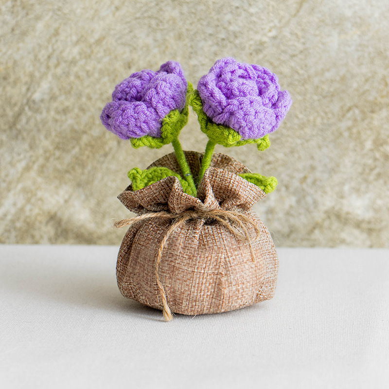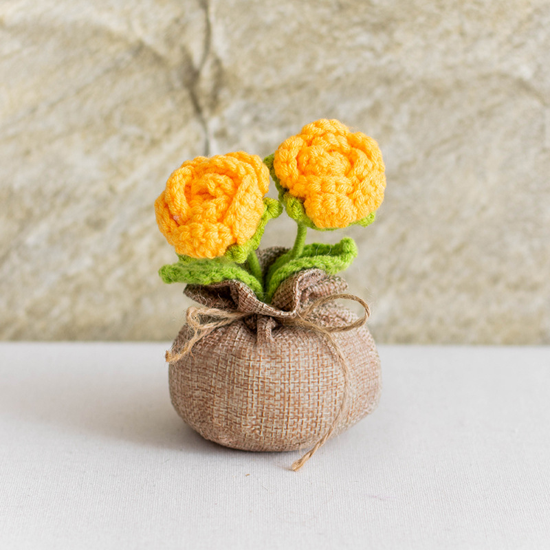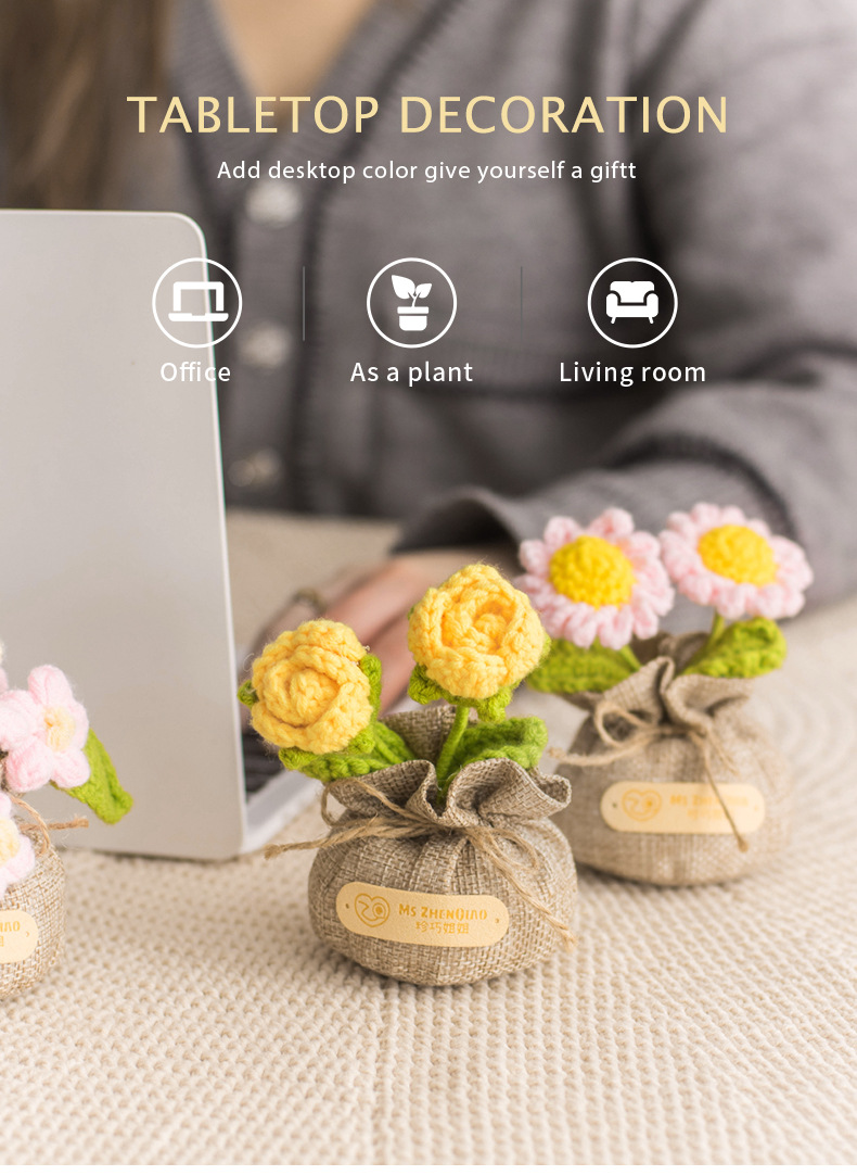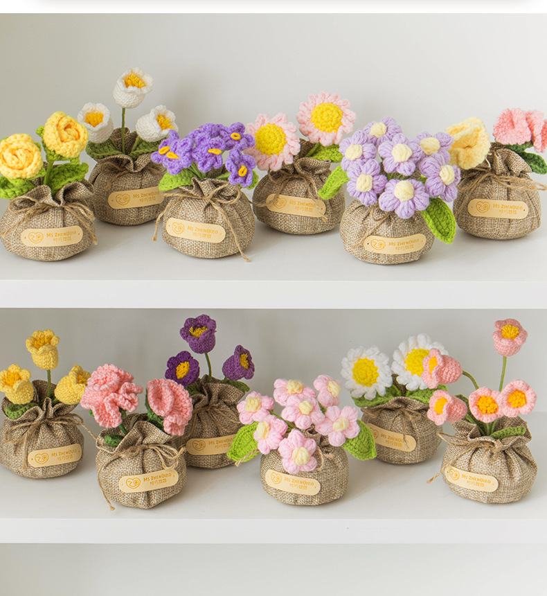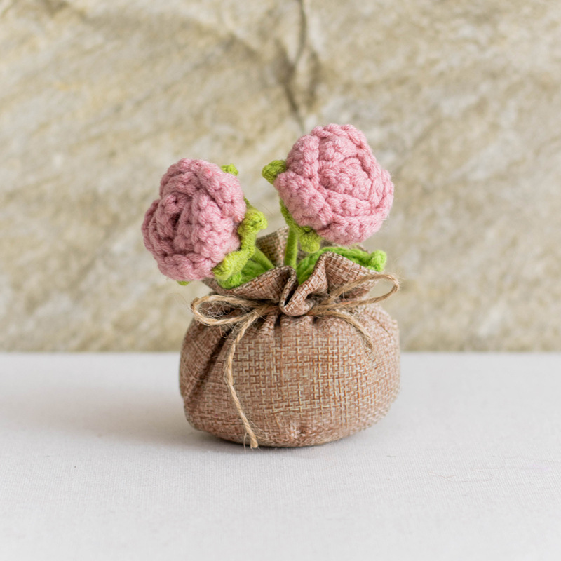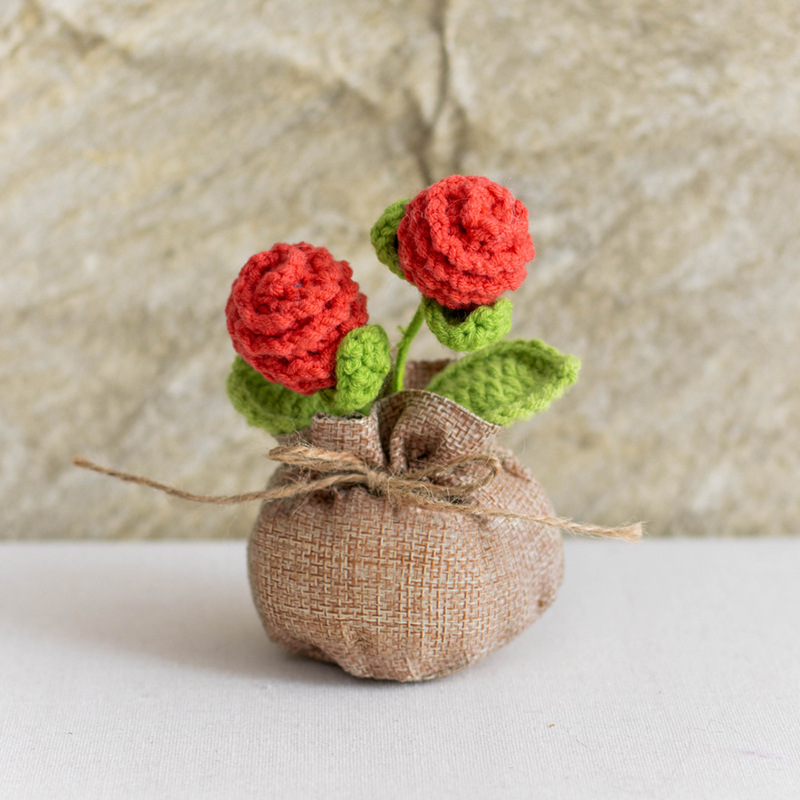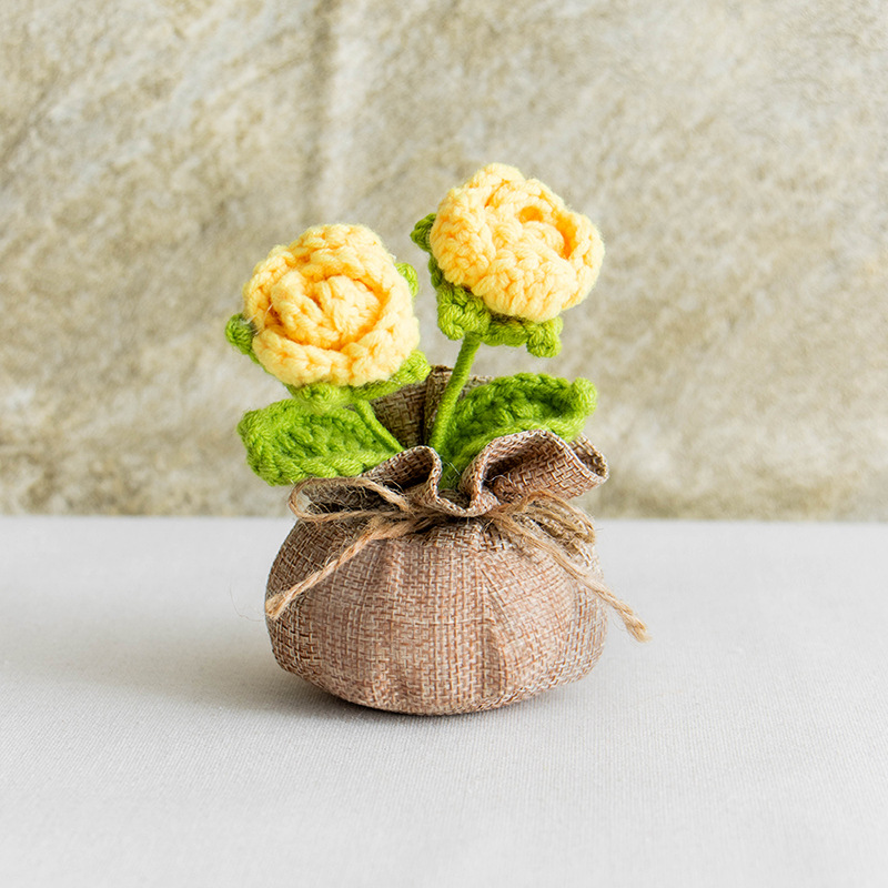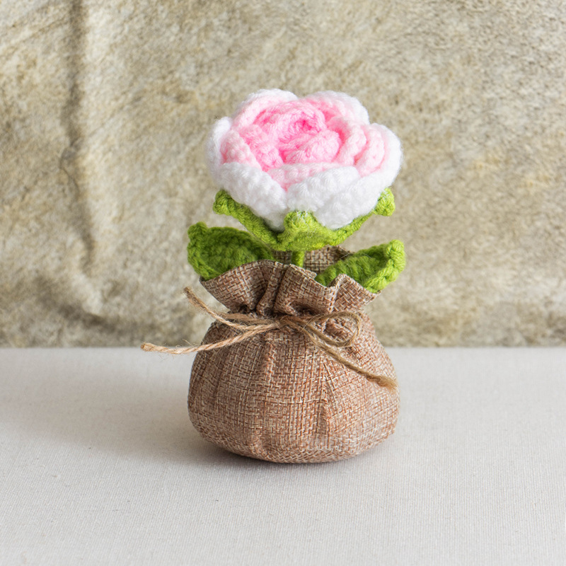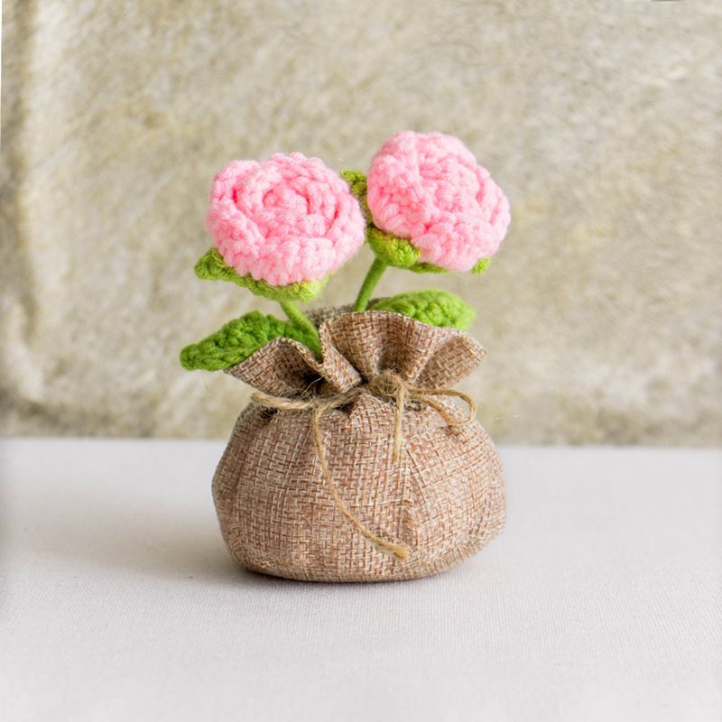 跨境手工钩织福袋小盆栽家居摆件毛线编织成品玫瑰装饰仿真花盆栽