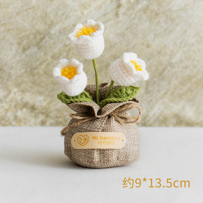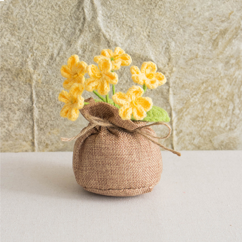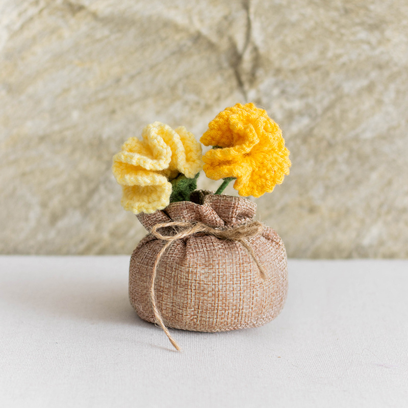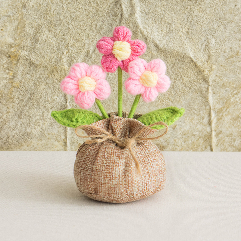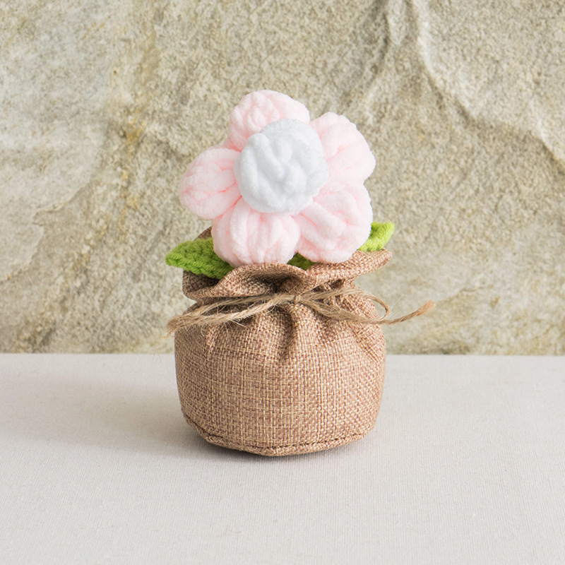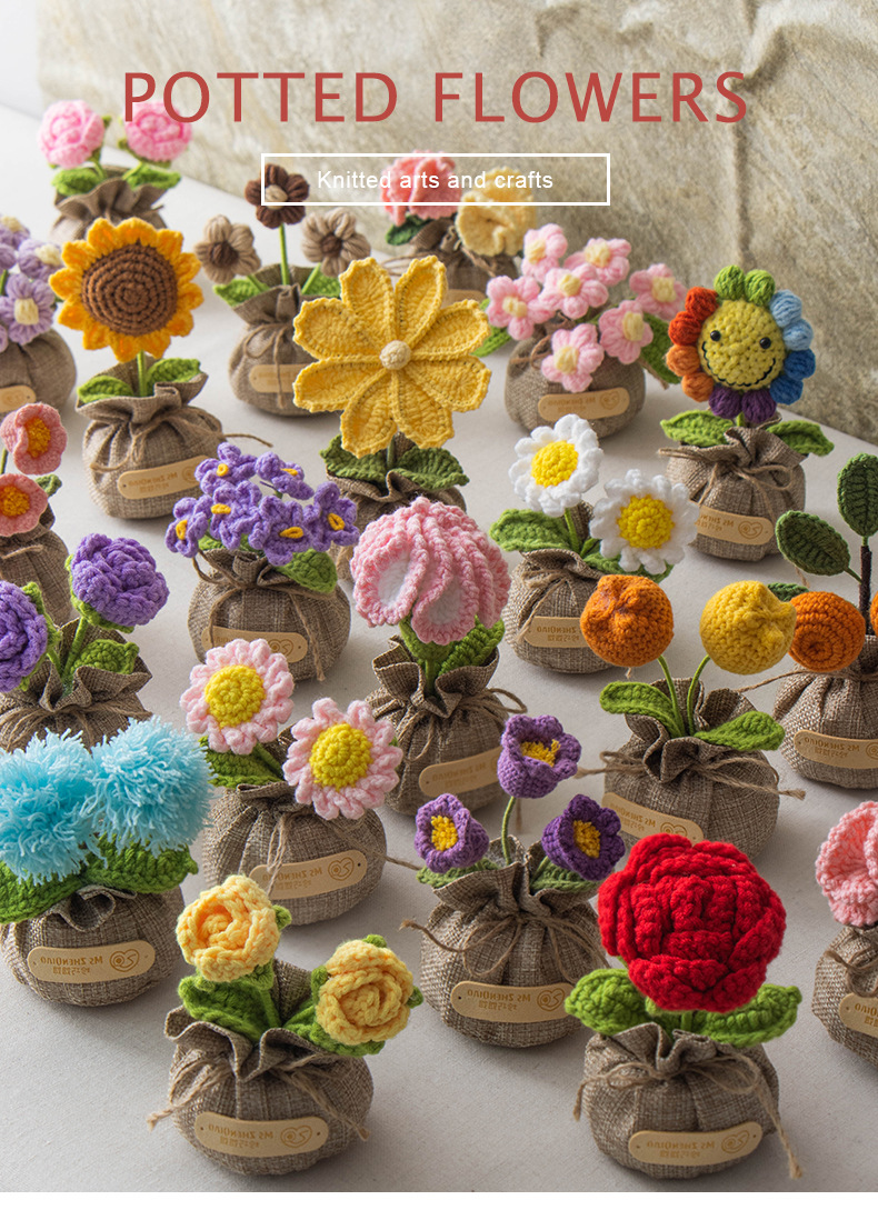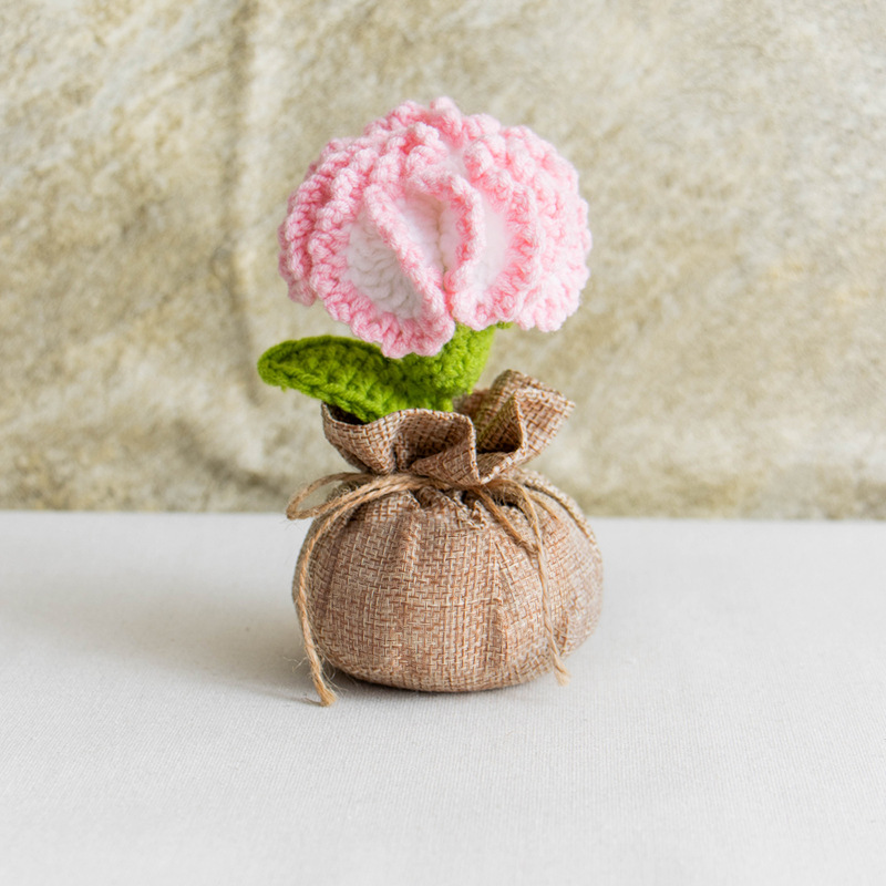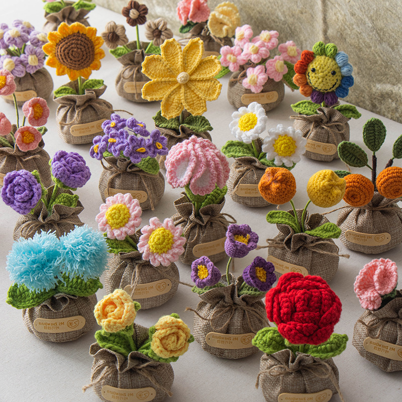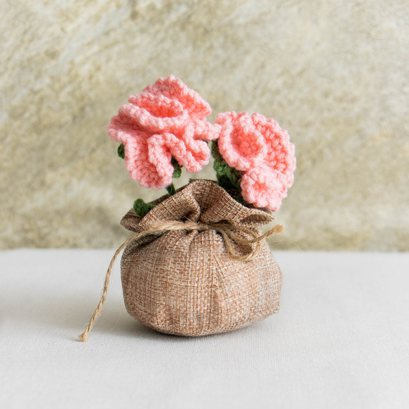 跨境手工钩织福袋小盆栽家居摆件毛线编织成品玫瑰装饰仿真花盆栽