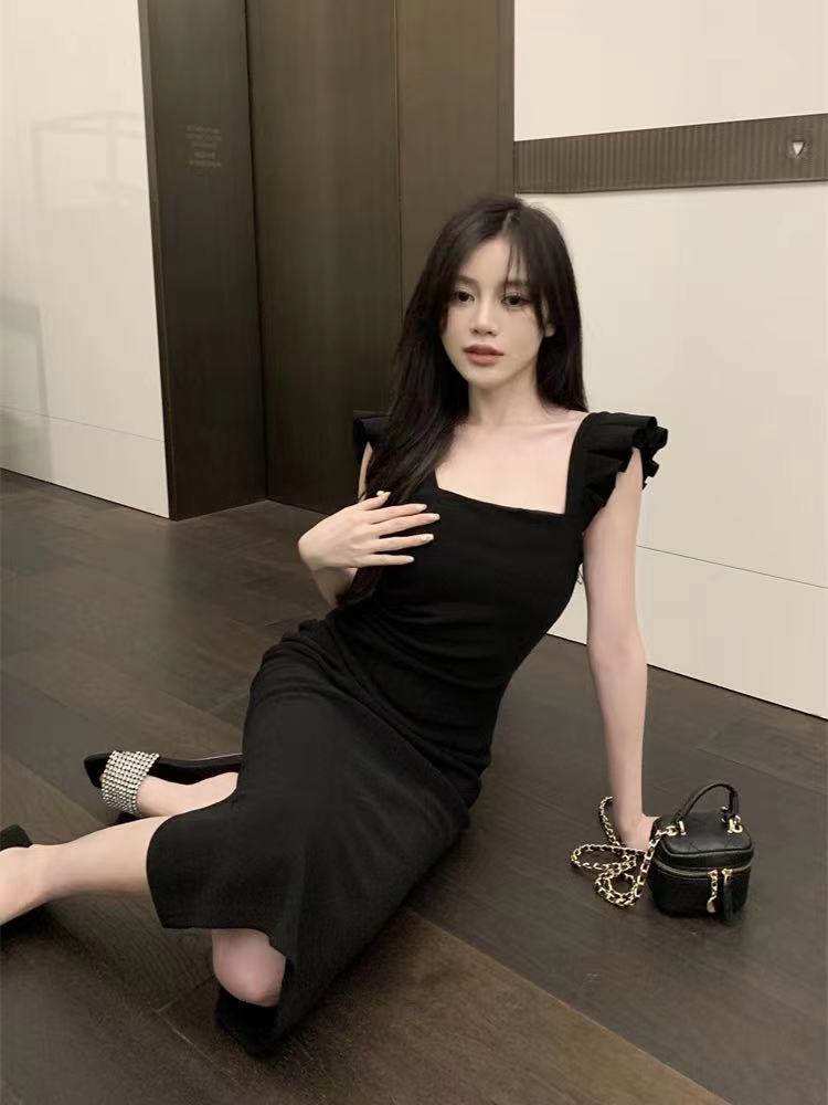 法式小个子飞飞袖开叉裙子夏季新款纯欲风显瘦包臀长裙连衣裙女装