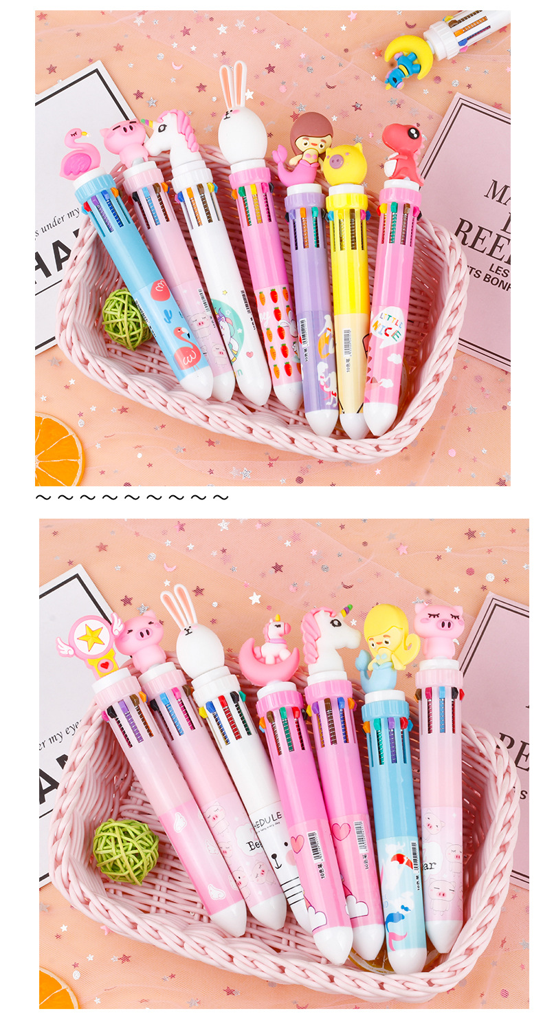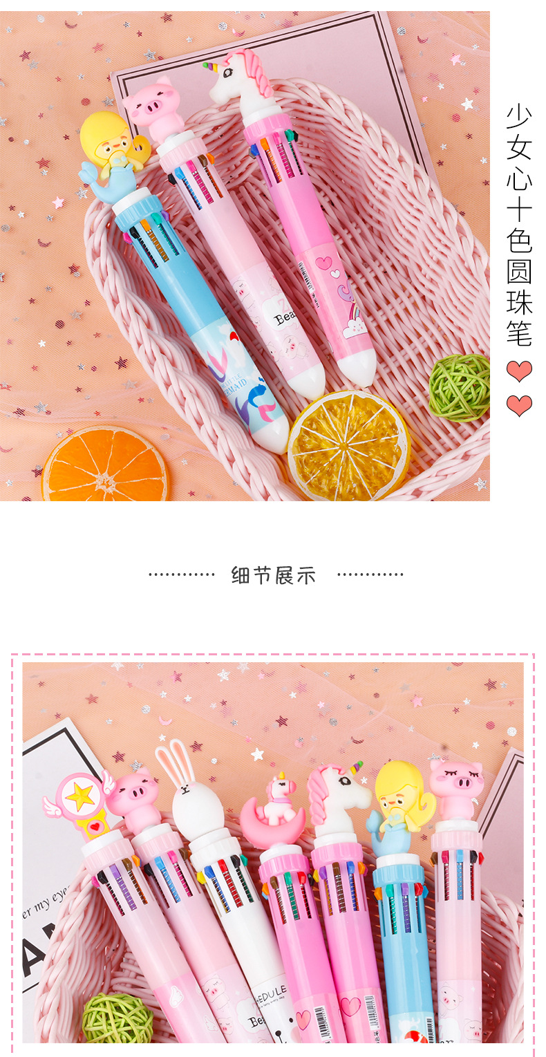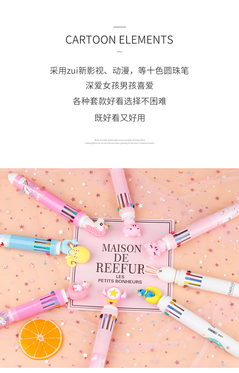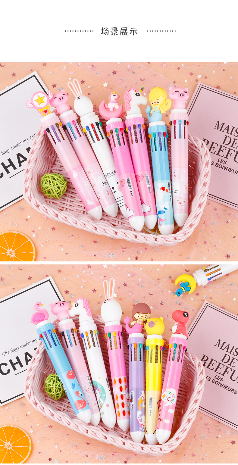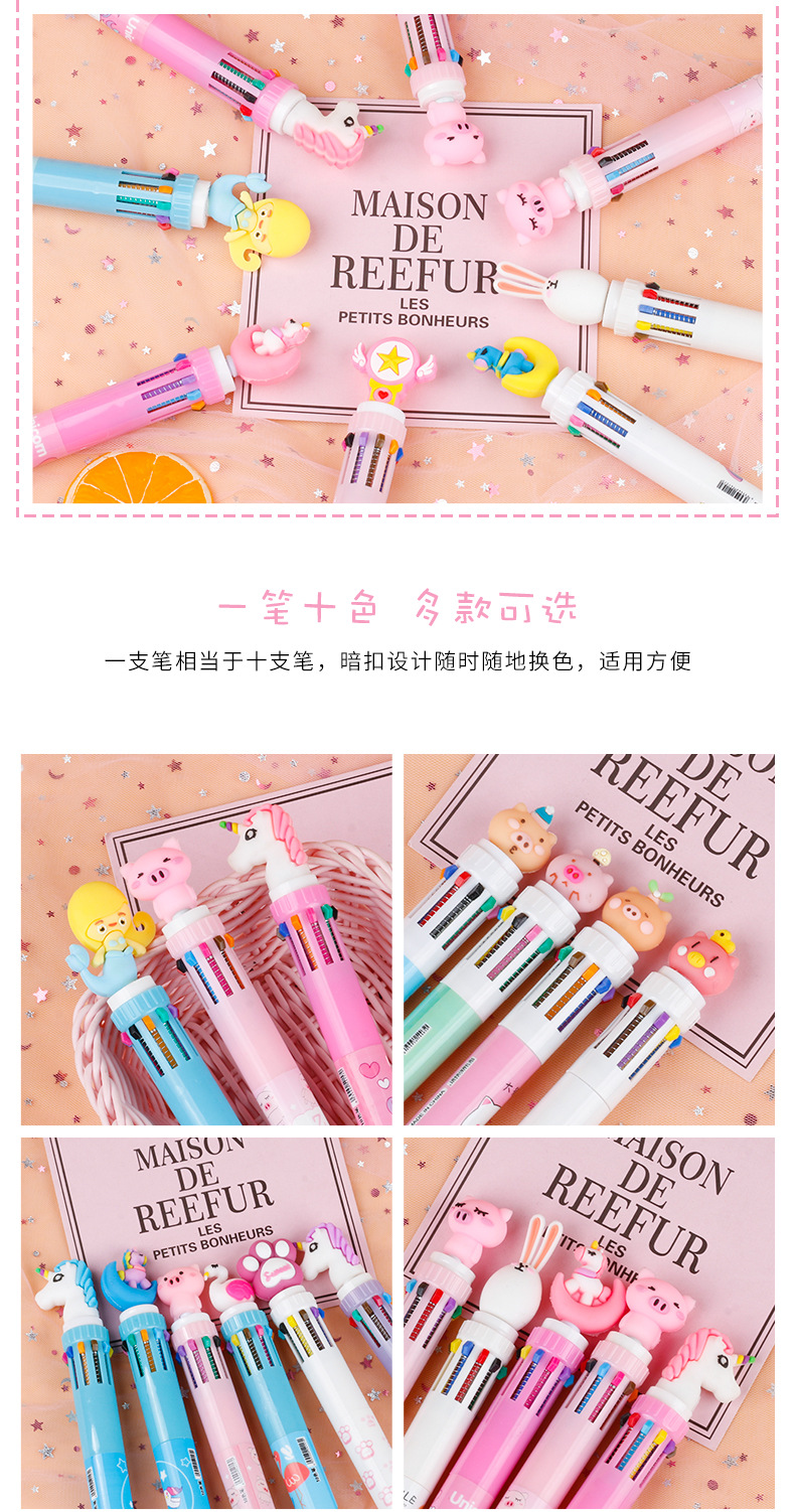 新款少女心创意卡通硅胶10色圆珠笔可爱按动十色圆珠笔学生多色笔