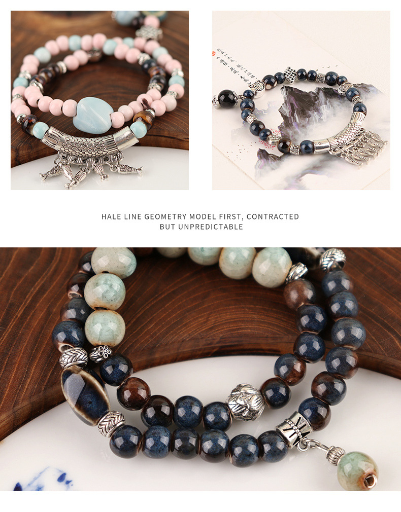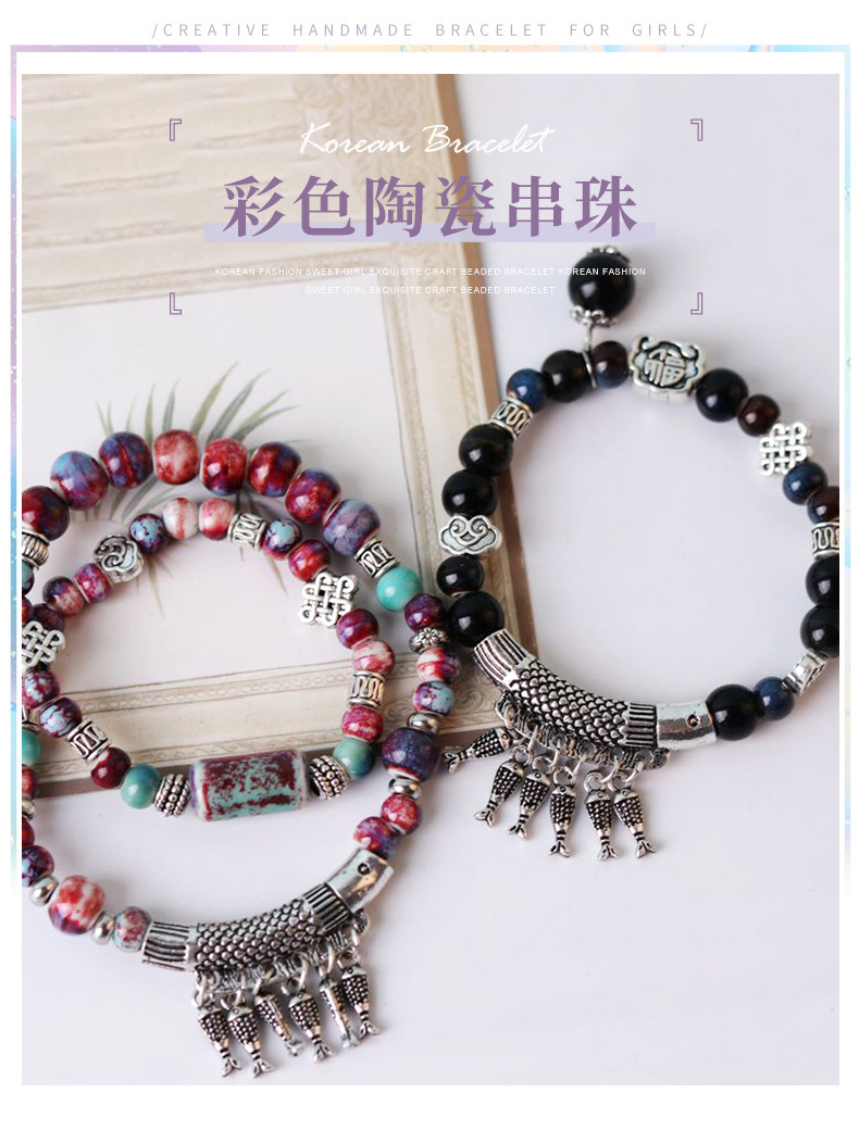厂家货源手作款彩色陶瓷串珠年年有鱼手链女夏2023年新款手串藏银
