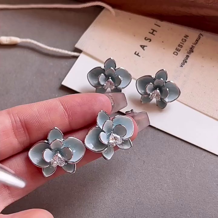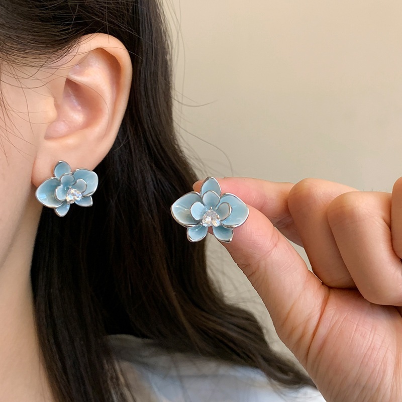 耳环小众高级感5A级锆石耳钉耳饰S925纯银针海蓝宝色滴釉花朵耳环