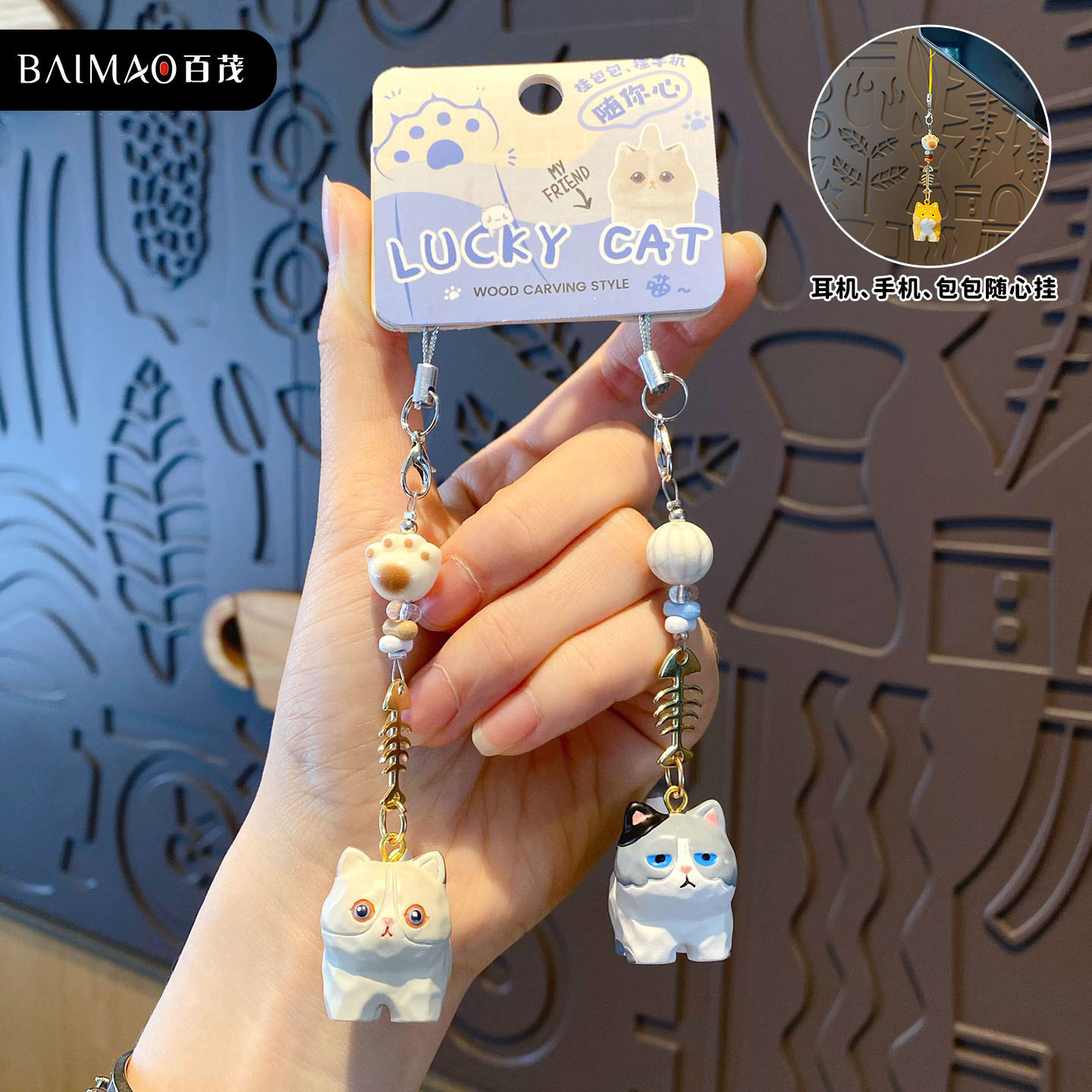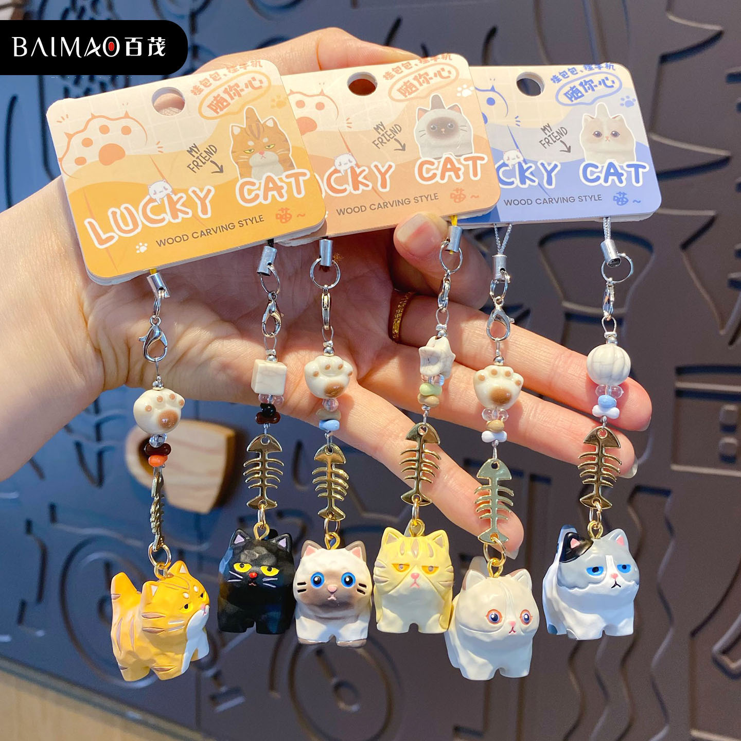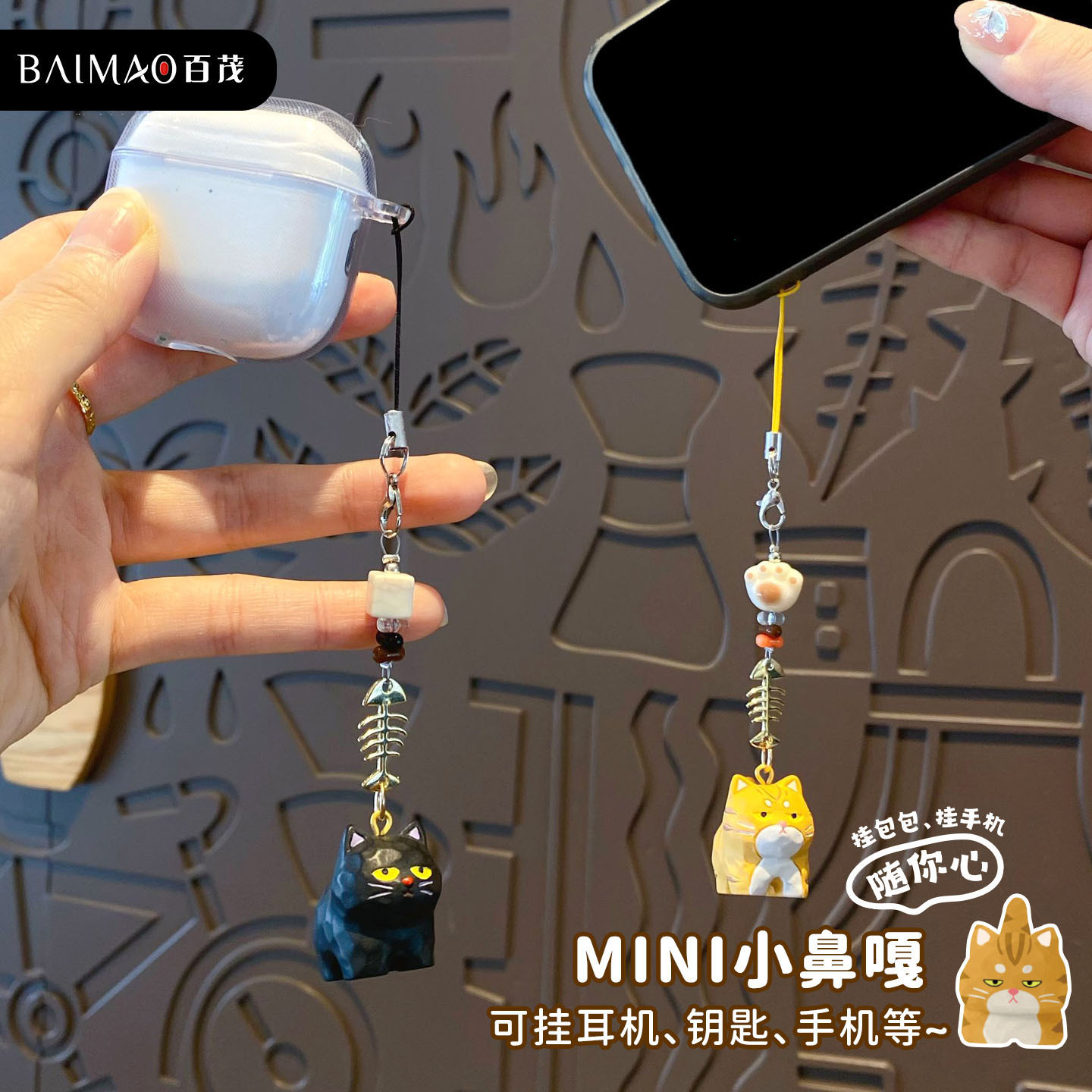 百茂原创迷你木雕风喵喵钥匙链可爱树脂小鼻噶情侣手机链书包挂饰