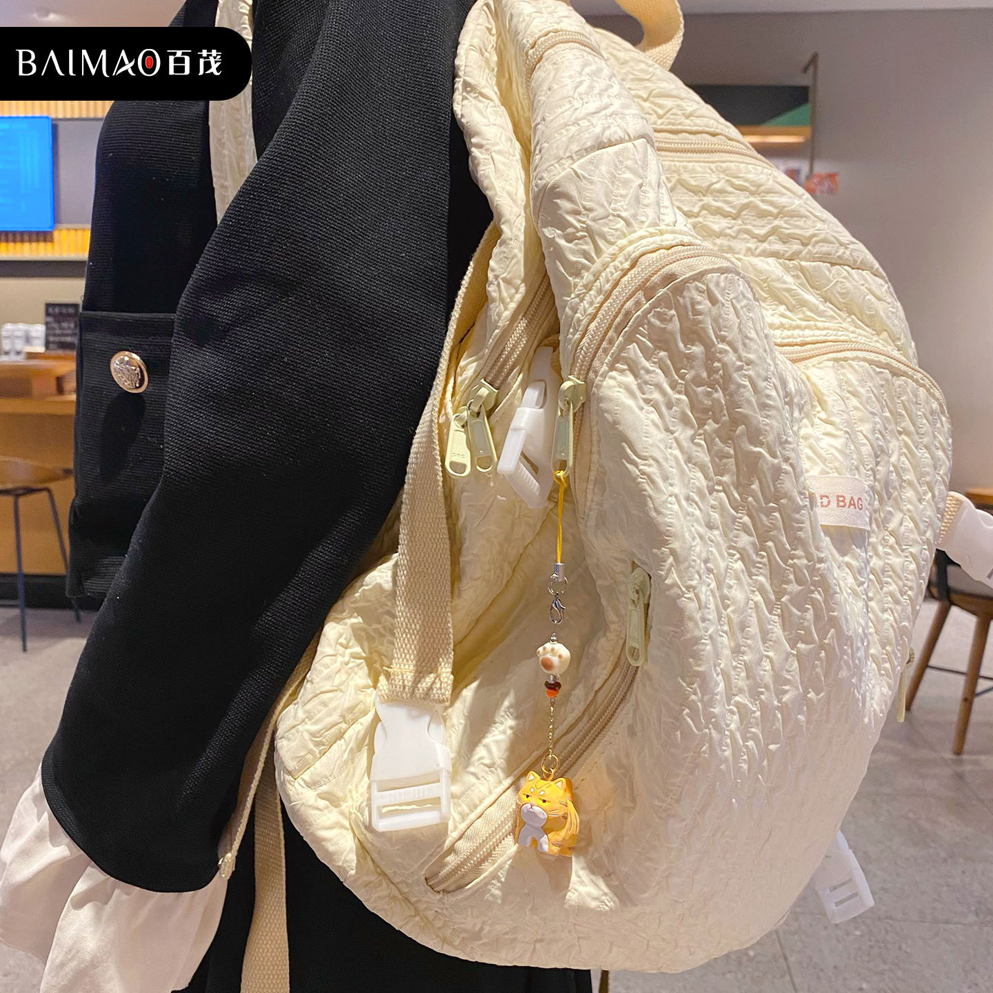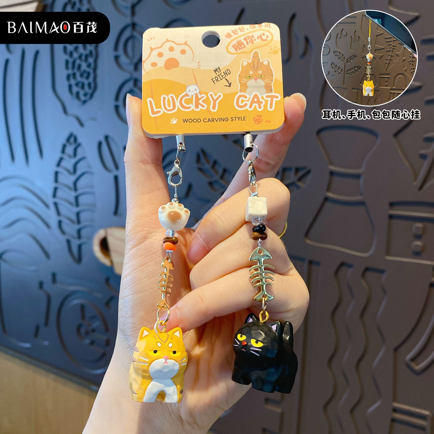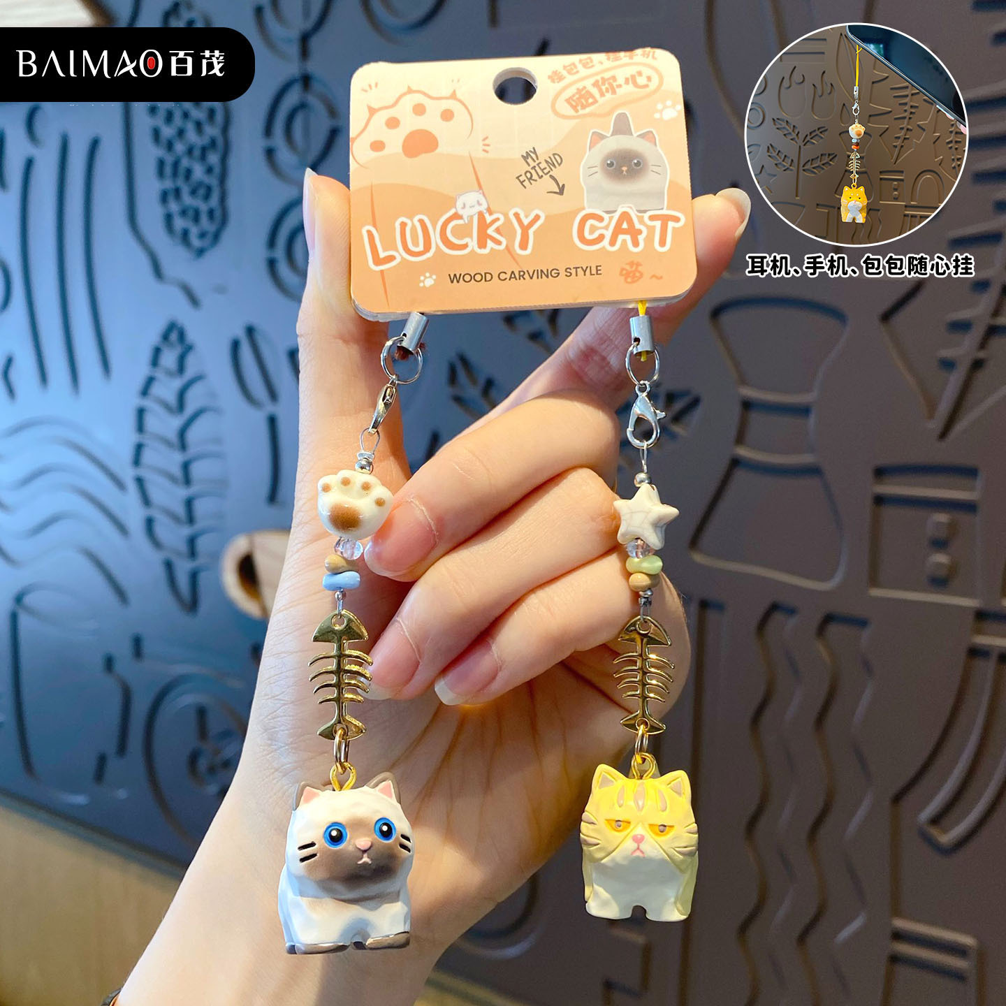 百茂原创迷你木雕风喵喵钥匙链可爱树脂小鼻噶情侣手机链书包挂饰