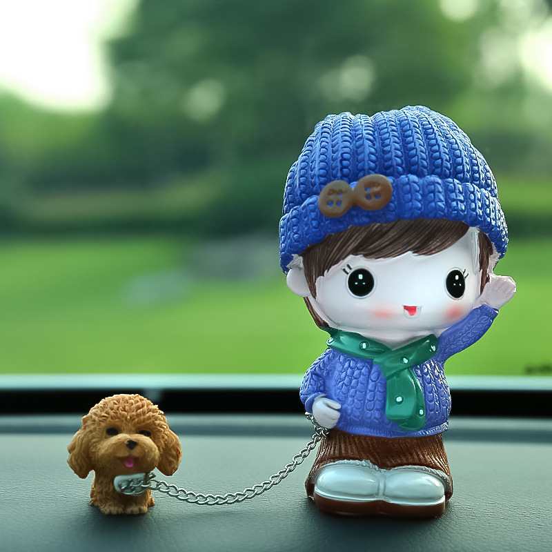 新款汽车摆件车载可爱卡通情侣娃娃遛狗组合创意车内办公饰品摆件