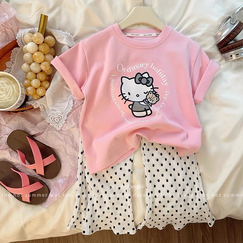 女童韩版洋气短袖T防蚊裤套装2025夏新款女童卡通猫T恤衫休闲长裤