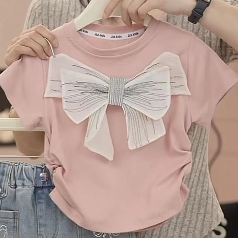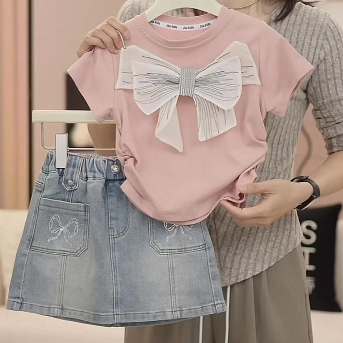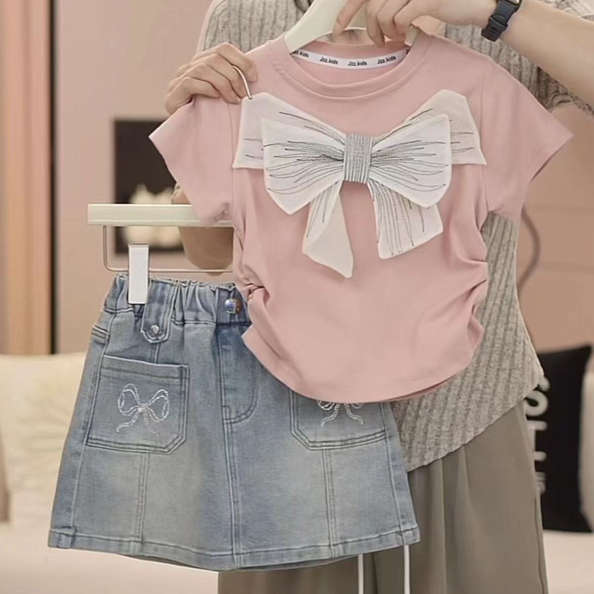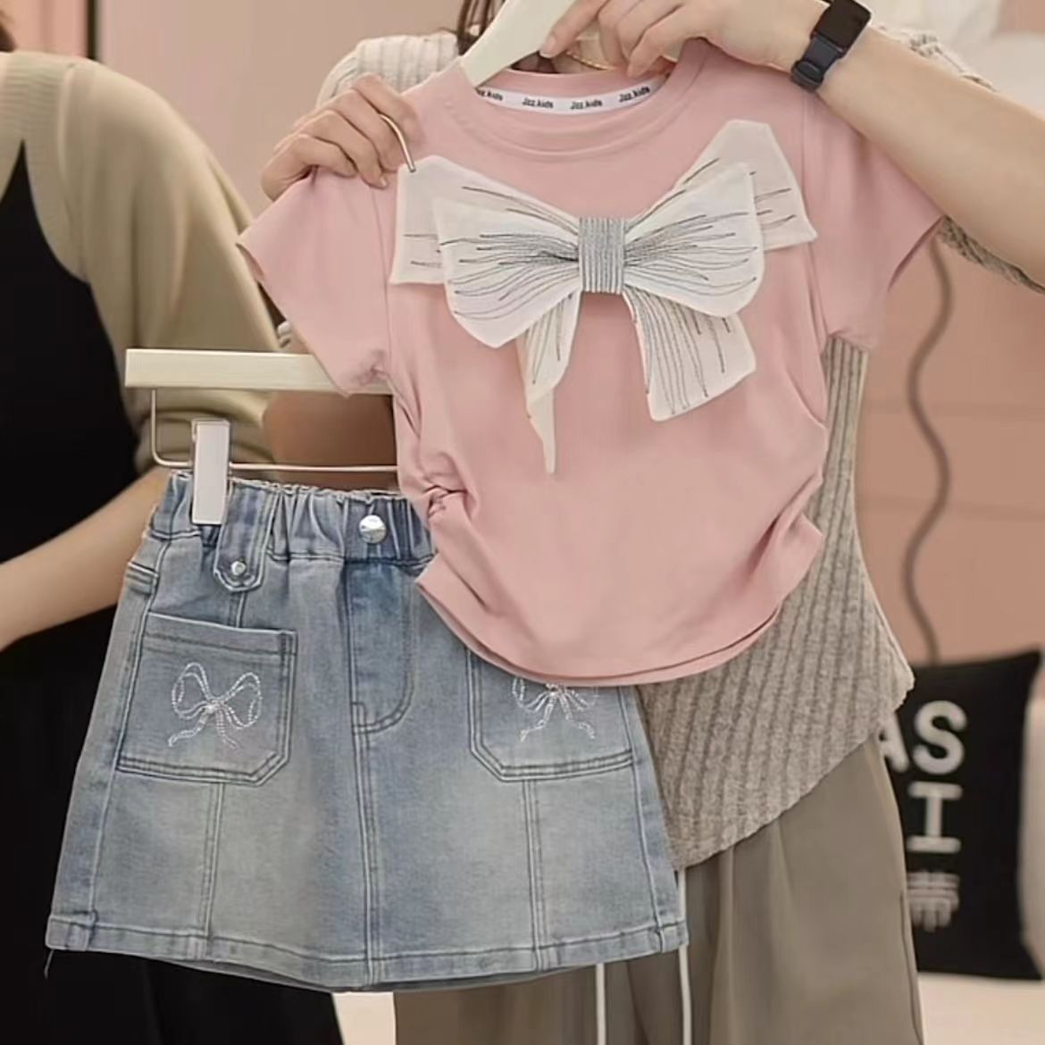 女童夏季新款2024女孩时髦洋气蝴蝶结短袖牛仔套装公主风超萌甜美