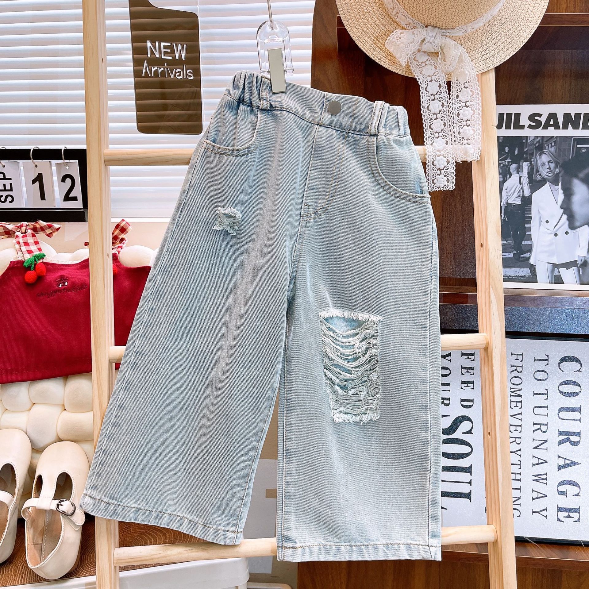 2024春夏季新款女童套装可爱樱桃刺绣背心加破洞牛仔裤两件套