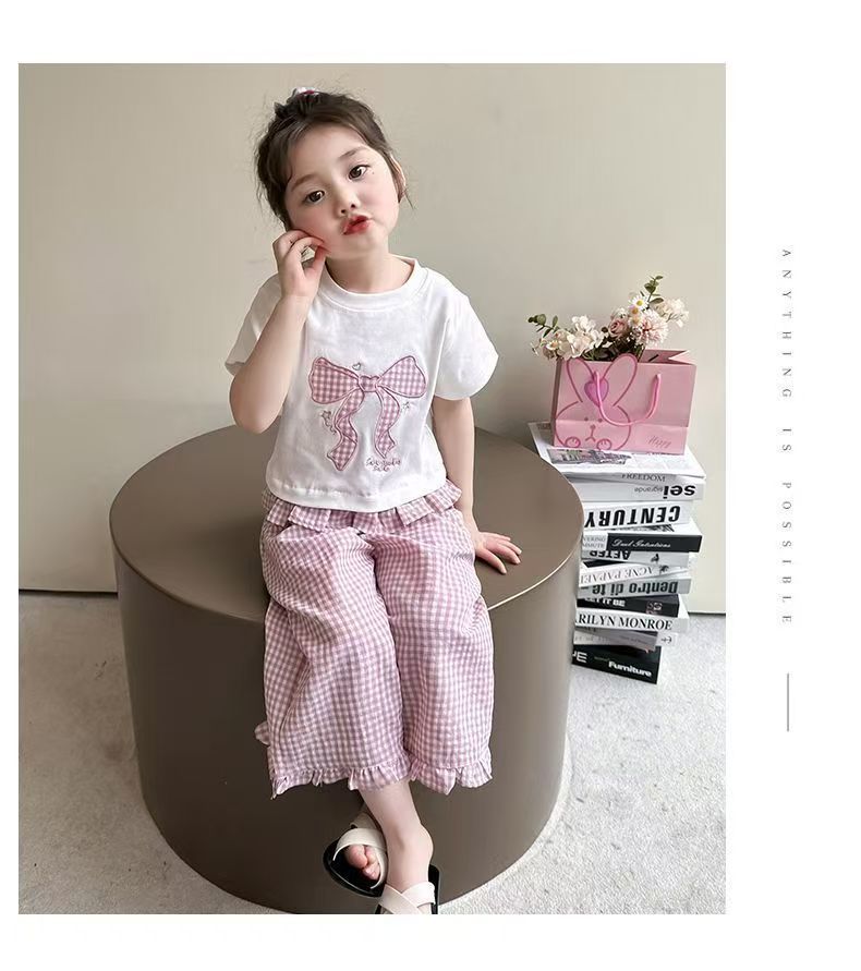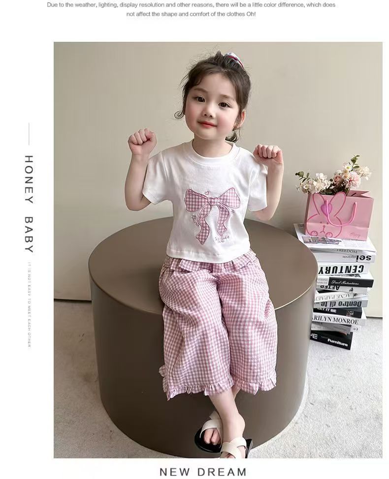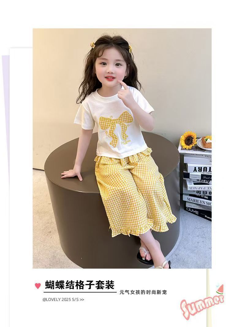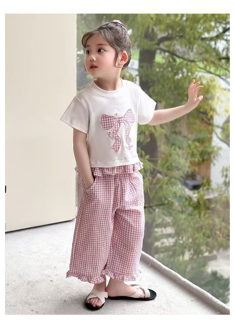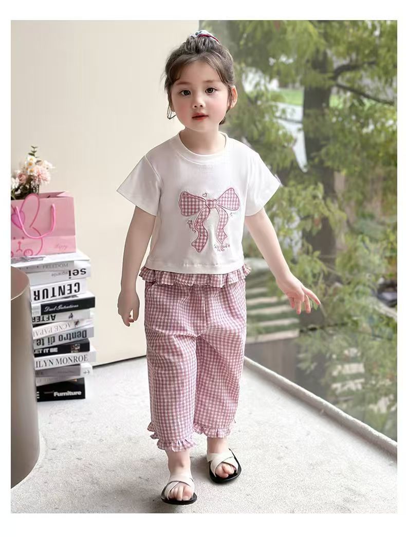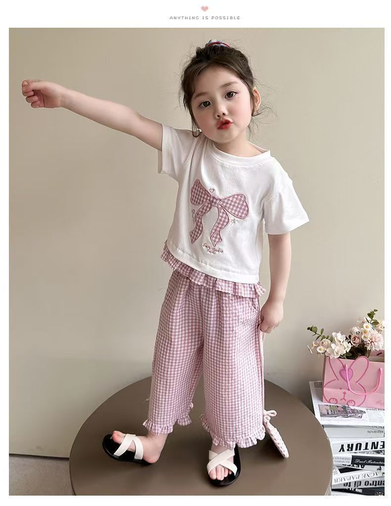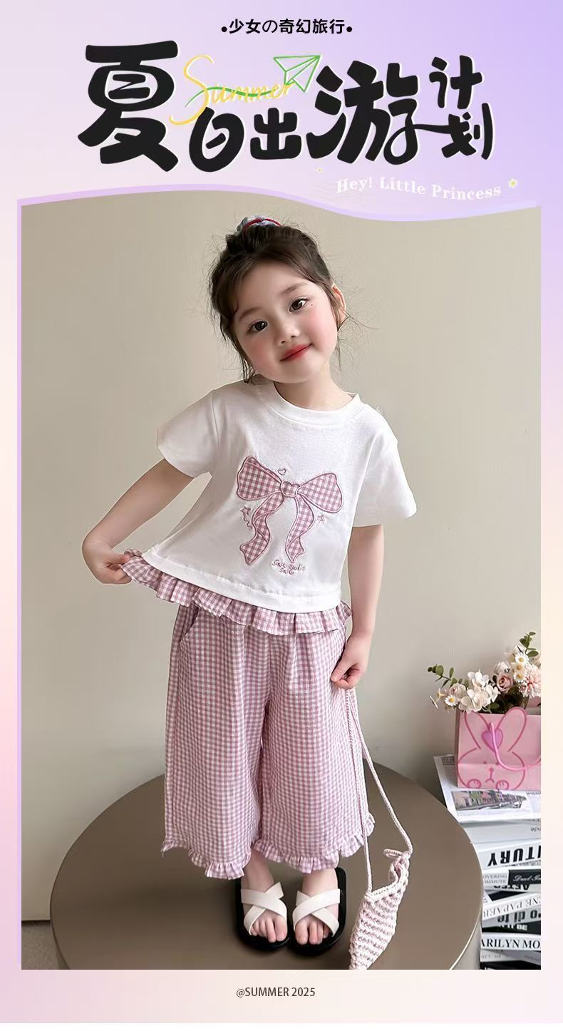 女宝宝夏装蝴蝶结短袖套装2025新款薄款洋气印花宽松格子裤两件套