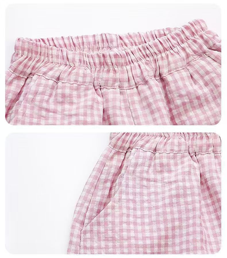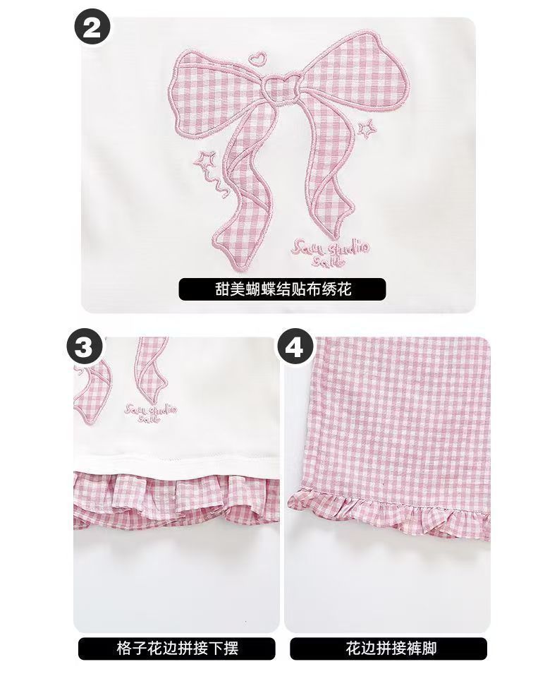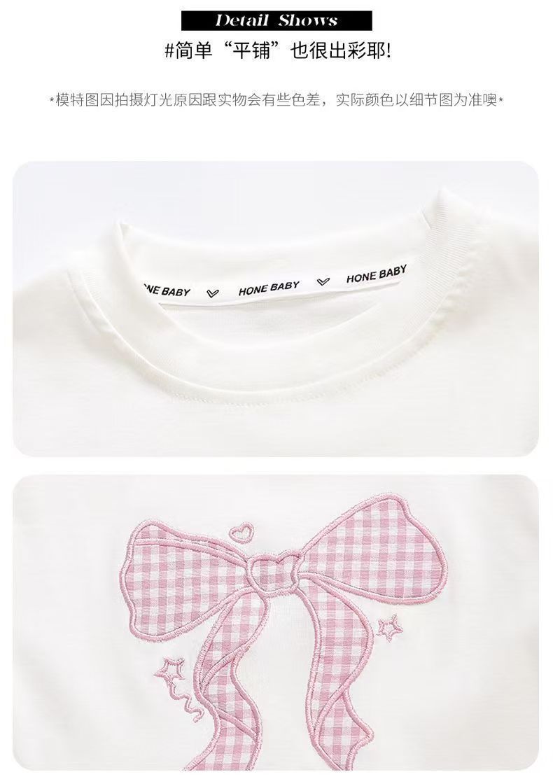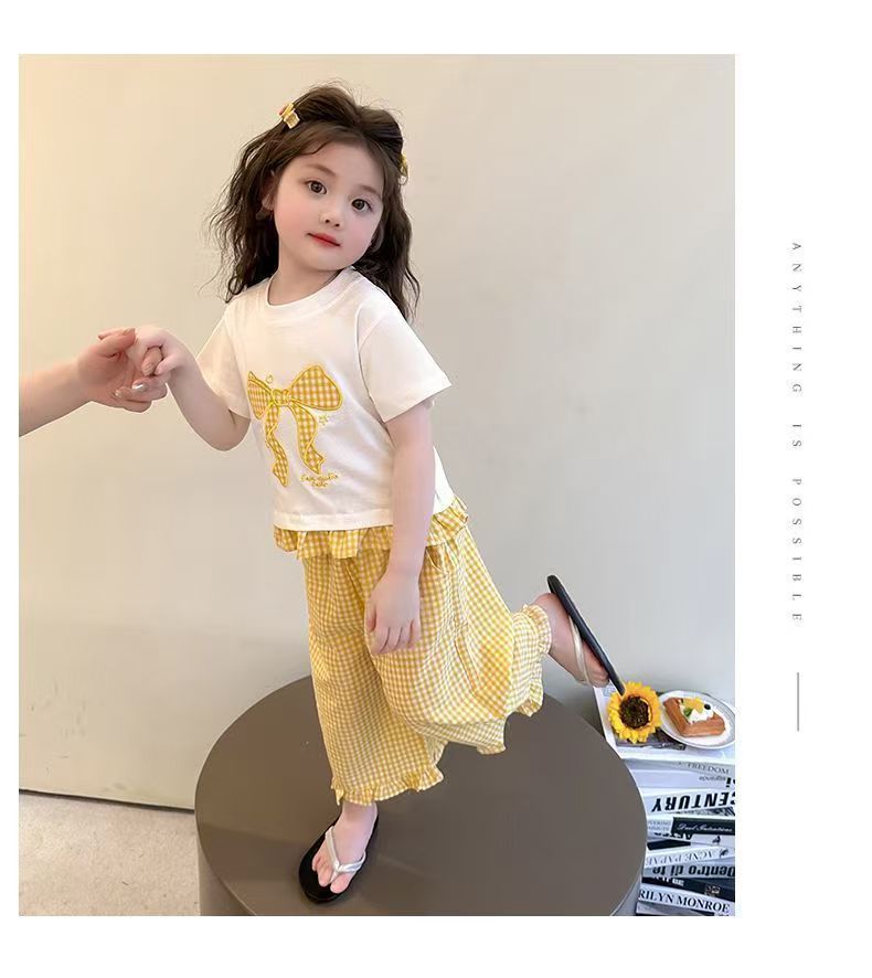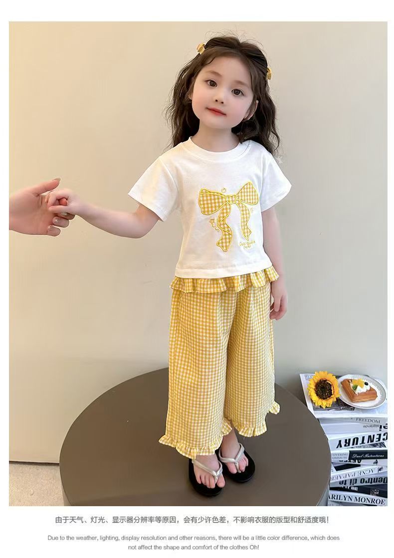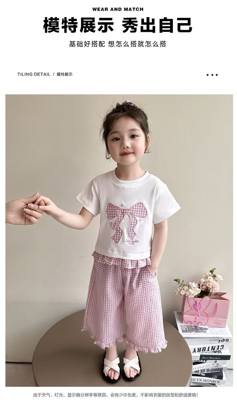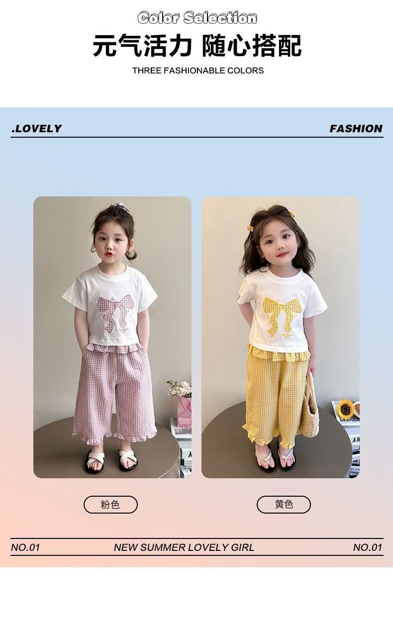 女宝宝夏装蝴蝶结短袖套装2025新款薄款洋气印花宽松格子裤两件套