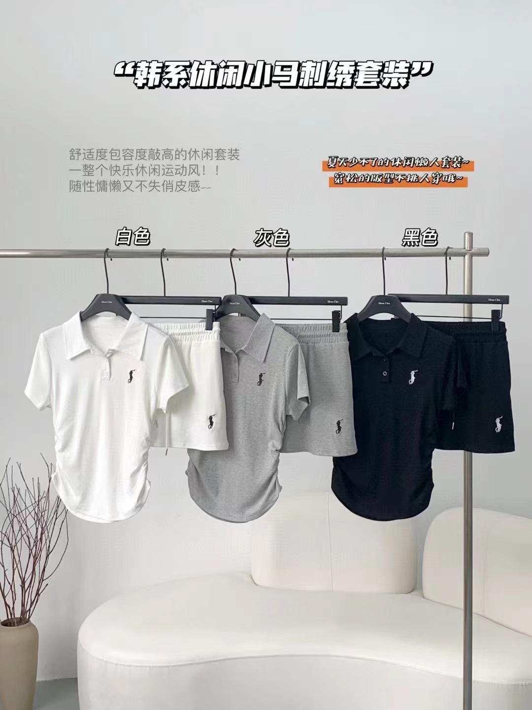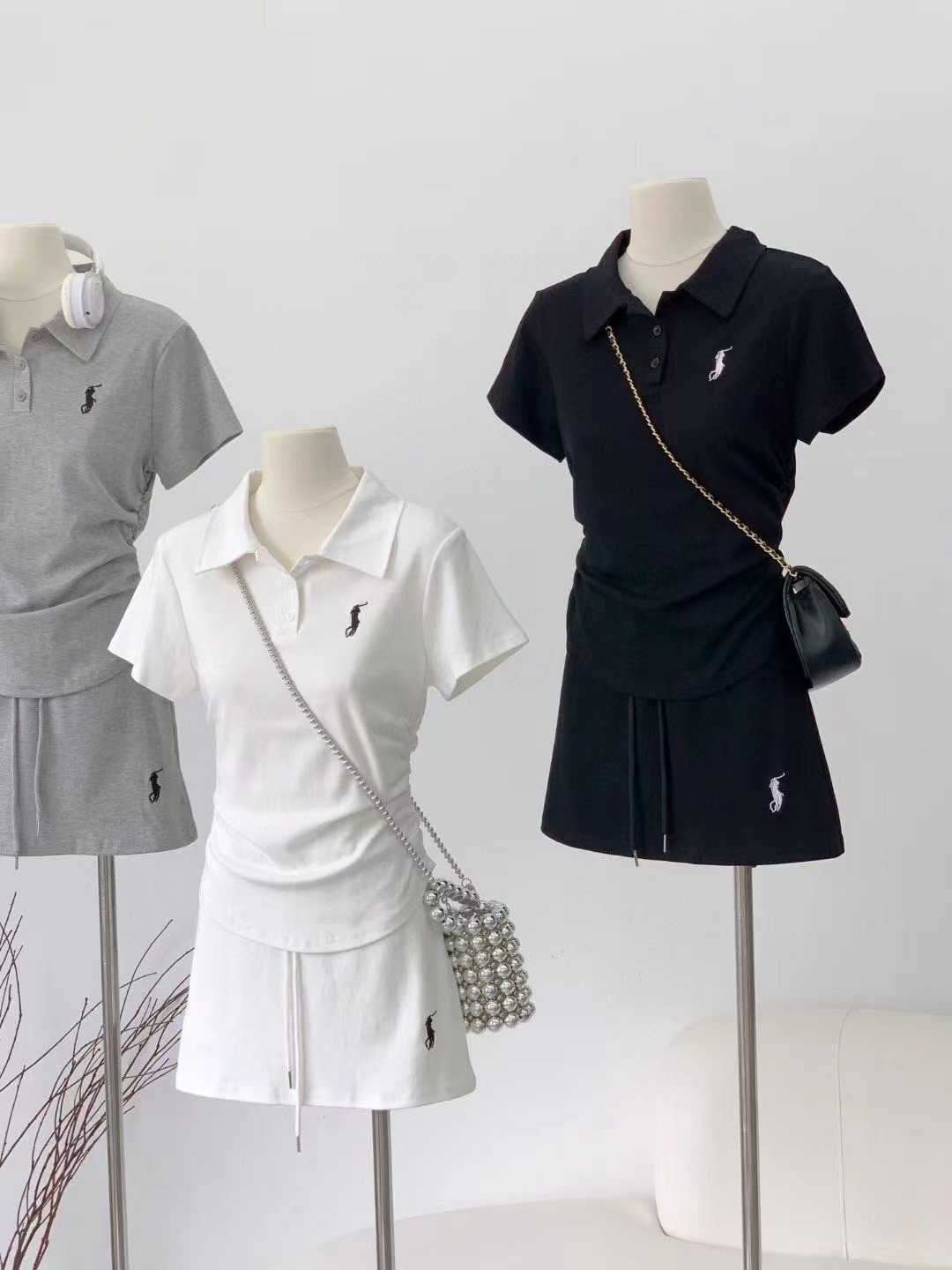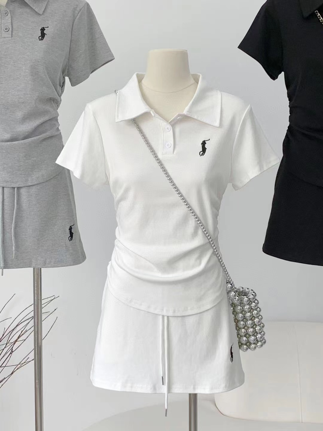 黑白灰三色可选刺绣小马运动休闲套装polo衫上衣T女+半身裙
