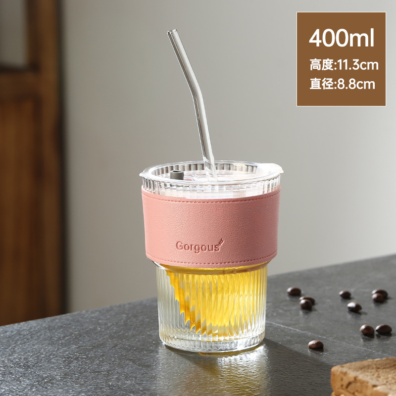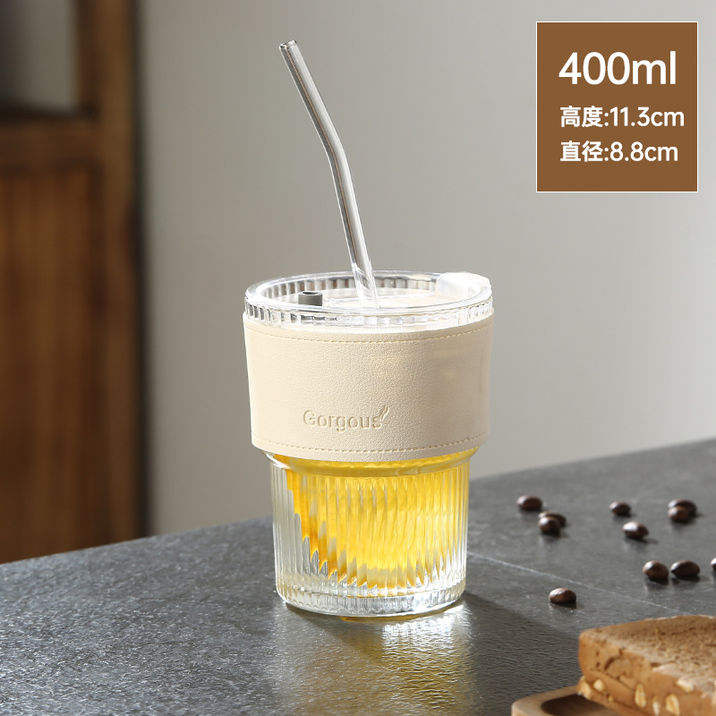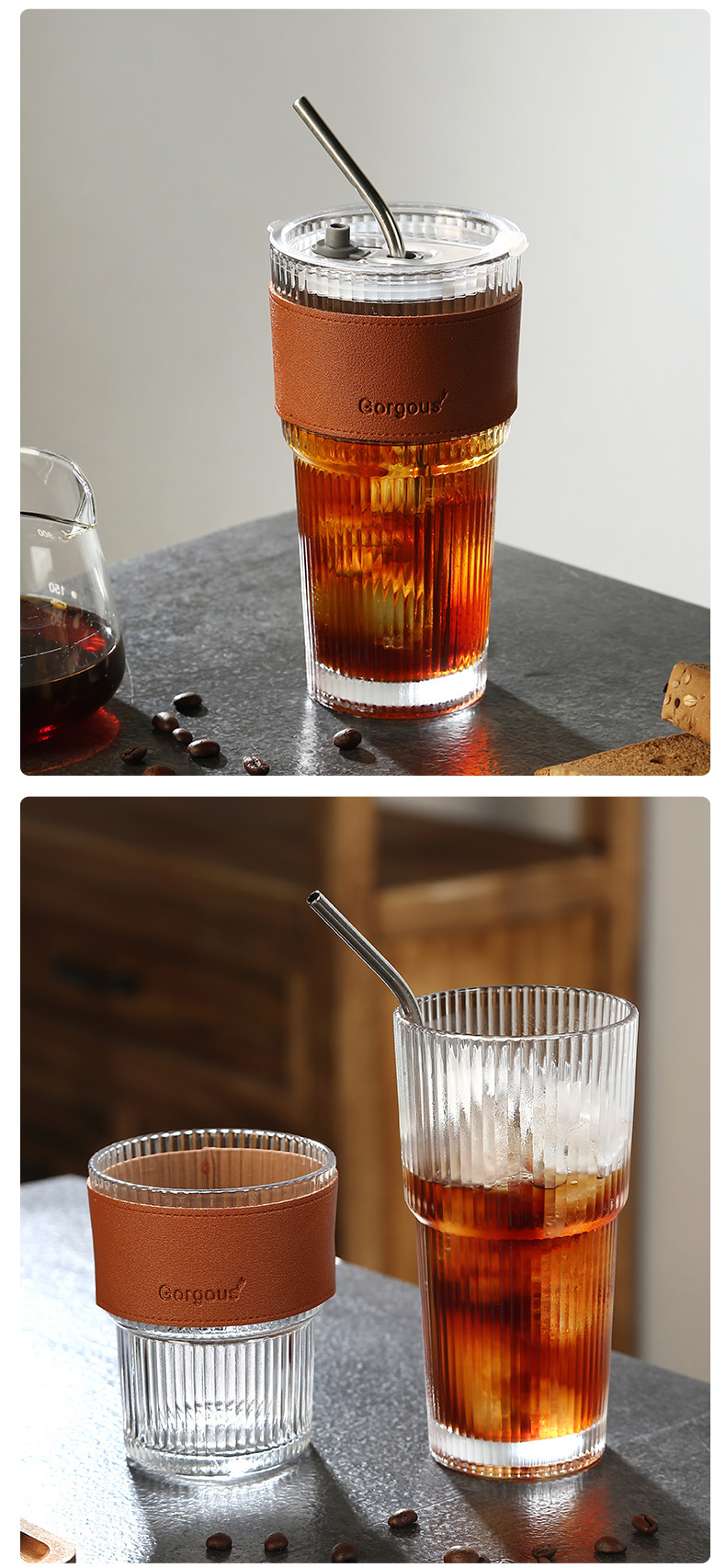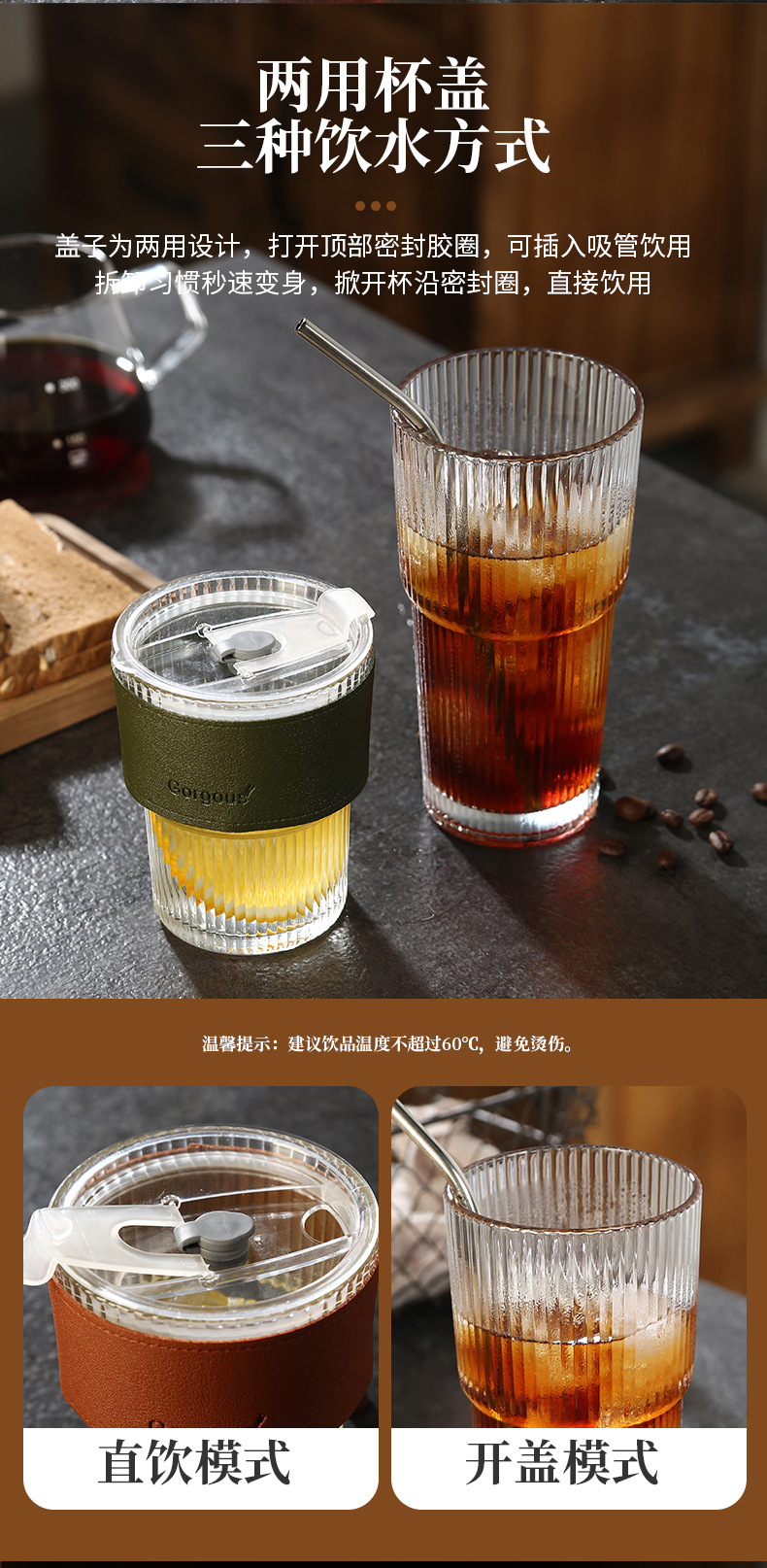 网红ins风吸管杯竖条纹玻璃杯高颜值带盖水杯冰美式咖啡拿铁杯子