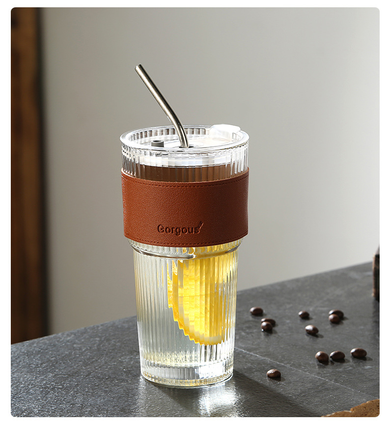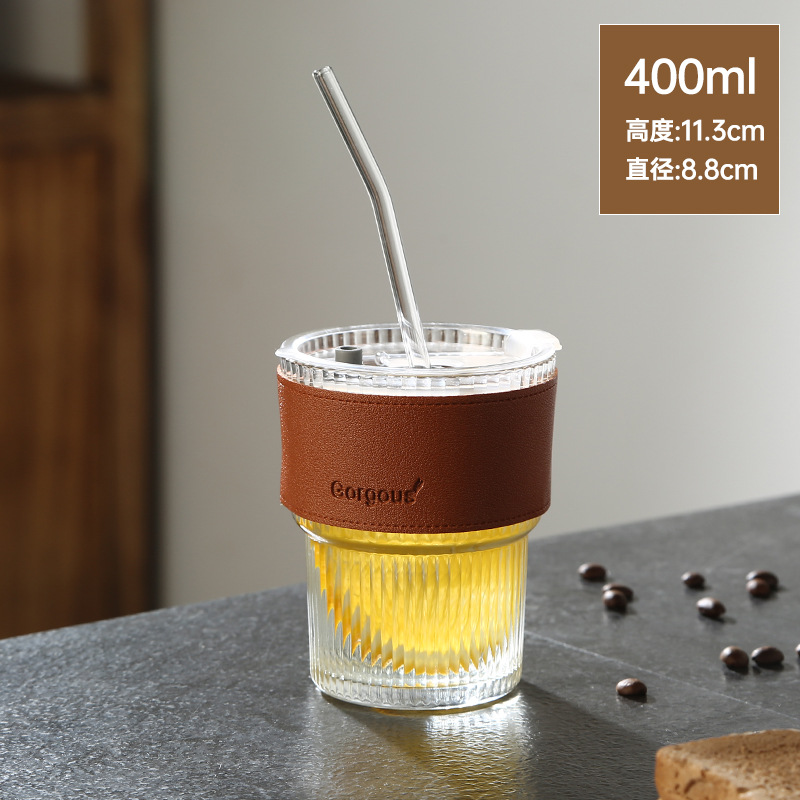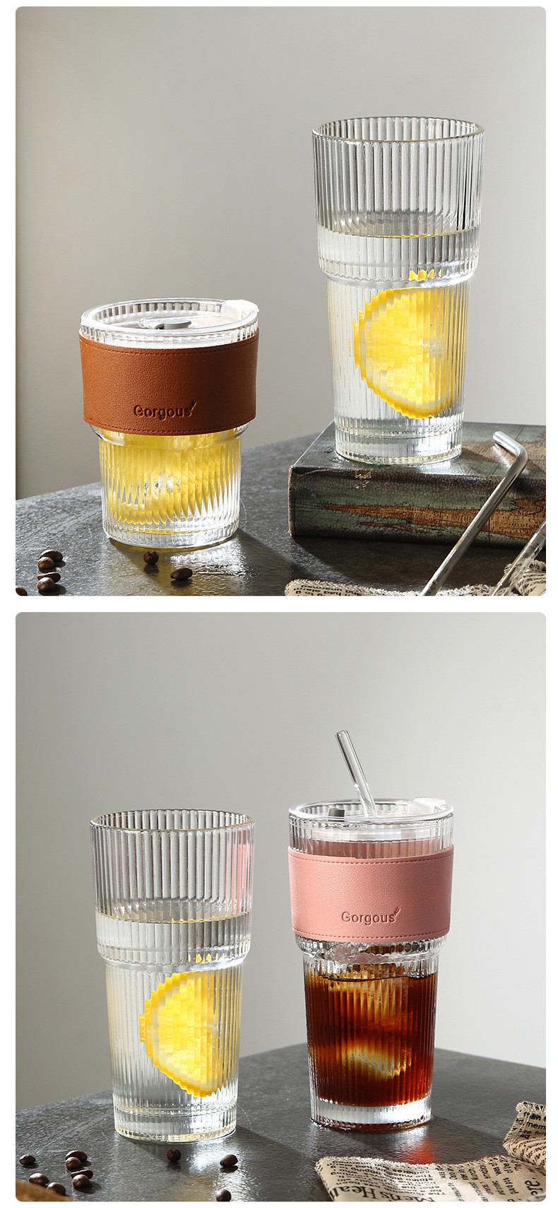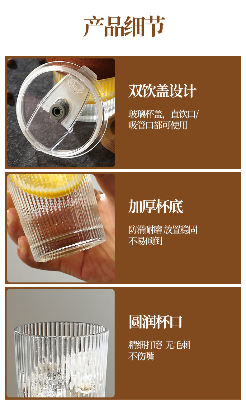 网红ins风吸管杯竖条纹玻璃杯高颜值带盖水杯冰美式咖啡拿铁杯子