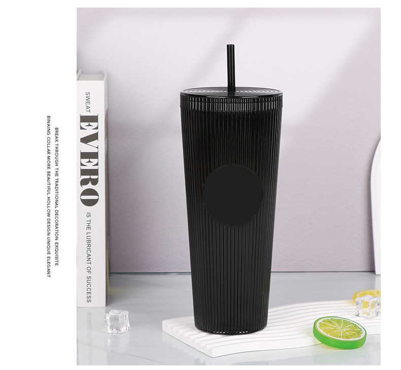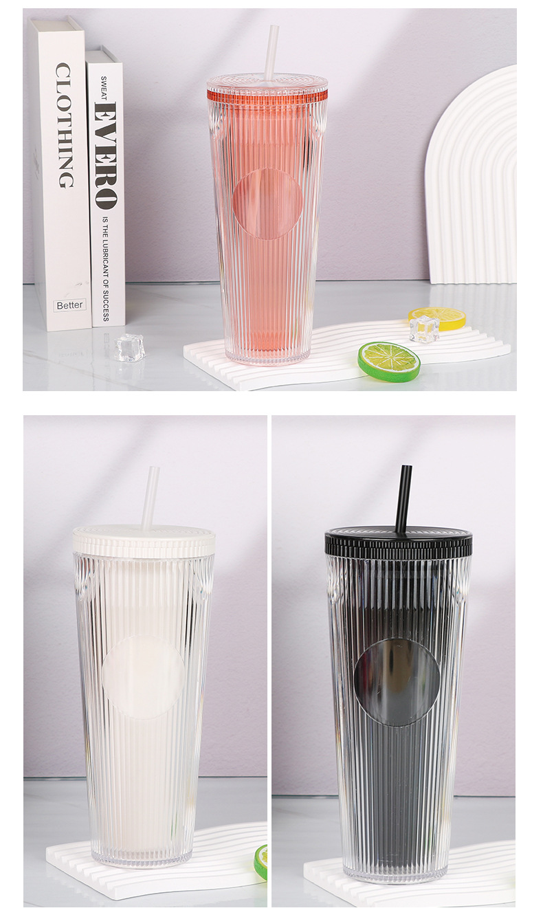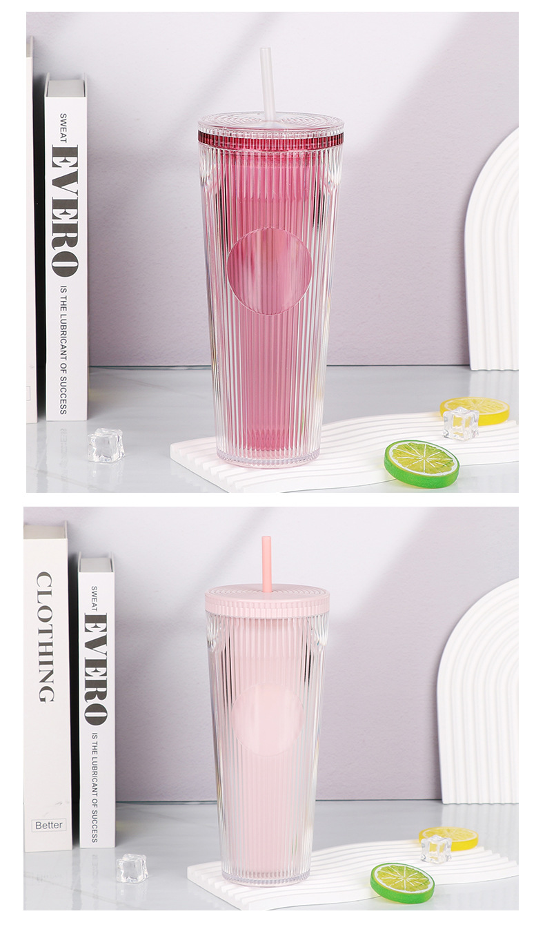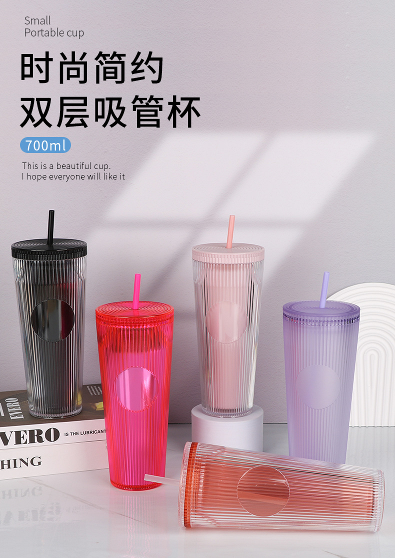 外贸热销时尚吸管杯竖条纹简约通勤水杯大容量双层隔热饮水杯批发
