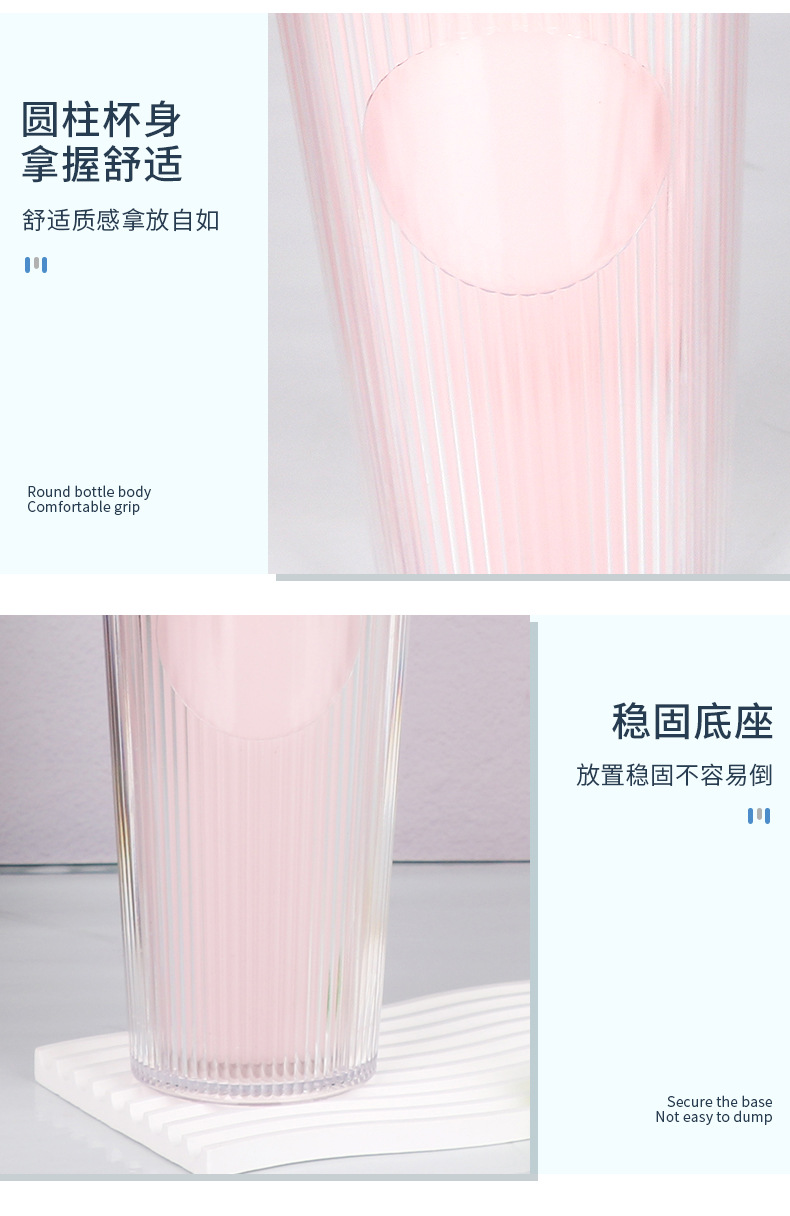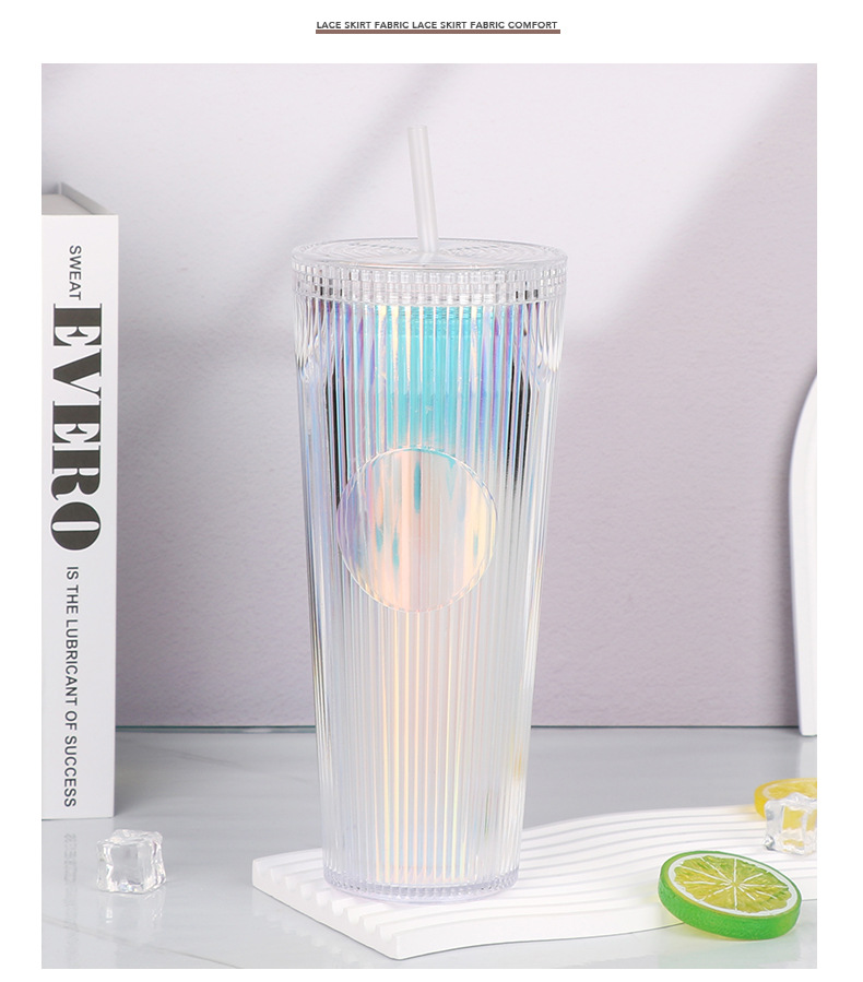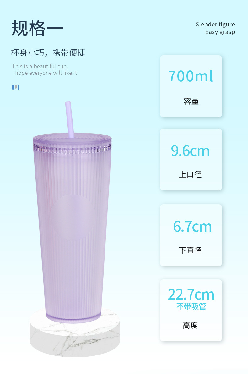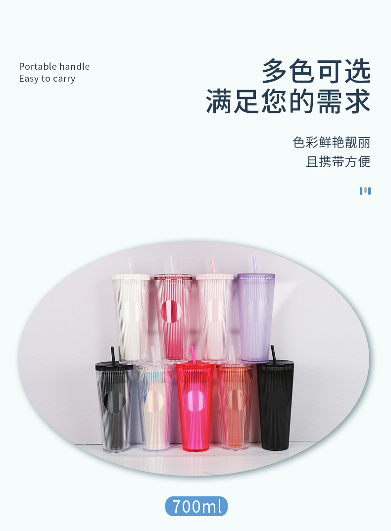 外贸热销时尚吸管杯竖条纹简约通勤水杯大容量双层隔热饮水杯批发