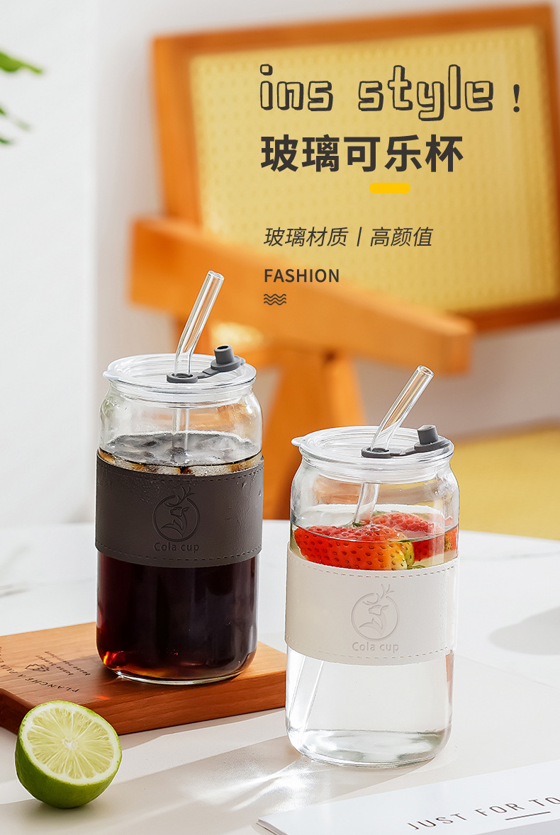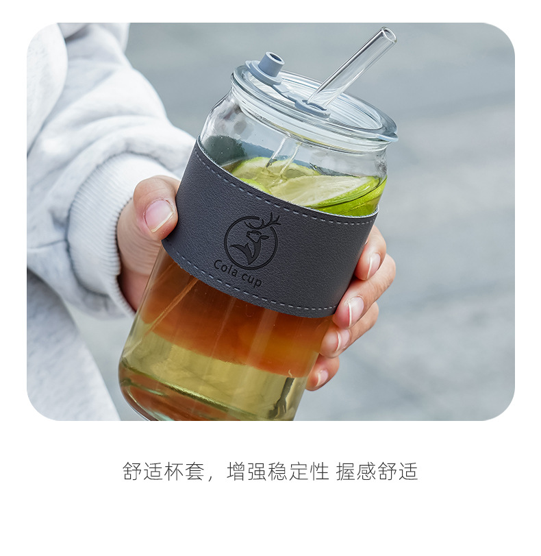 单层玻璃水杯竹木盖子带吸管可乐杯吸管杯带皮套隔热玻璃杯子批发