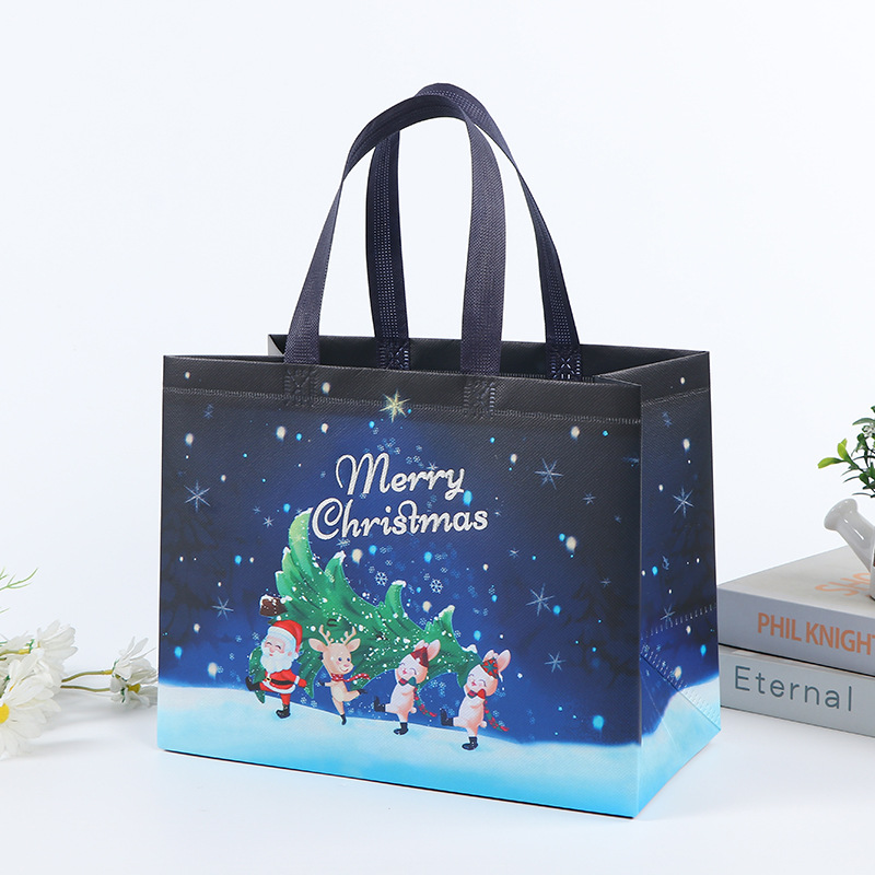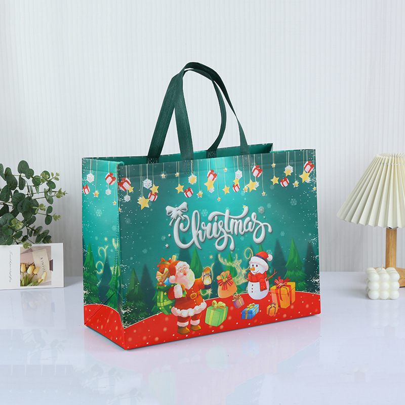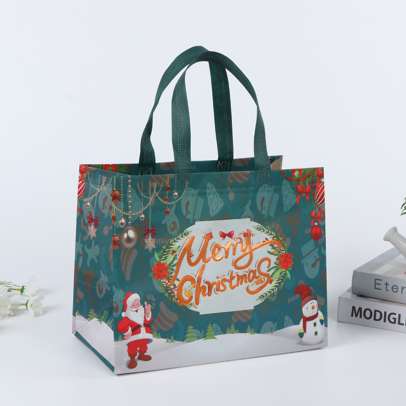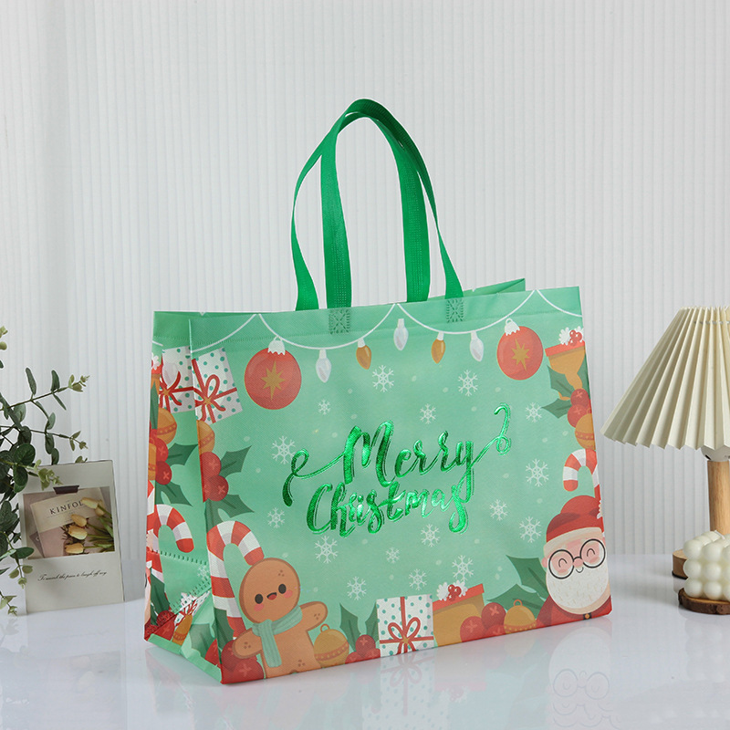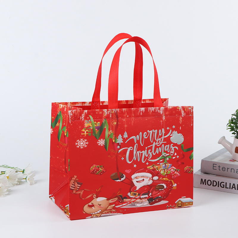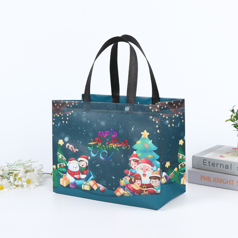 现货跨境圣诞节手提袋礼品包装袋便携折叠烫金覆膜无纺布袋定制