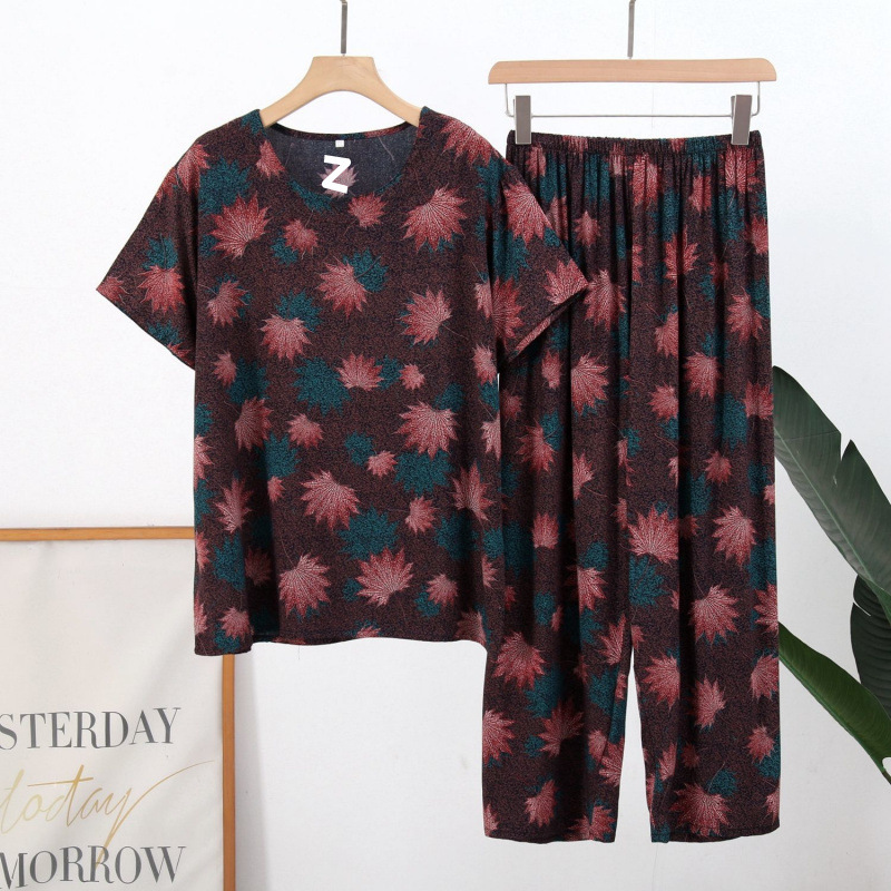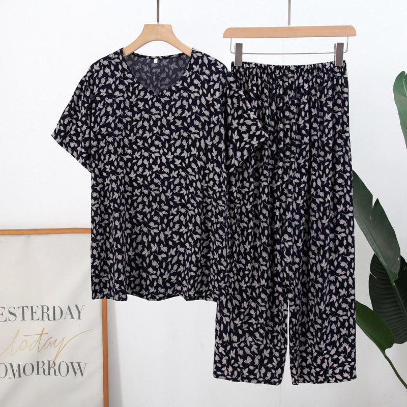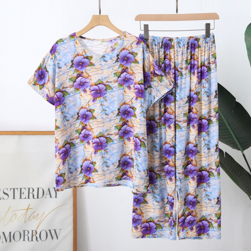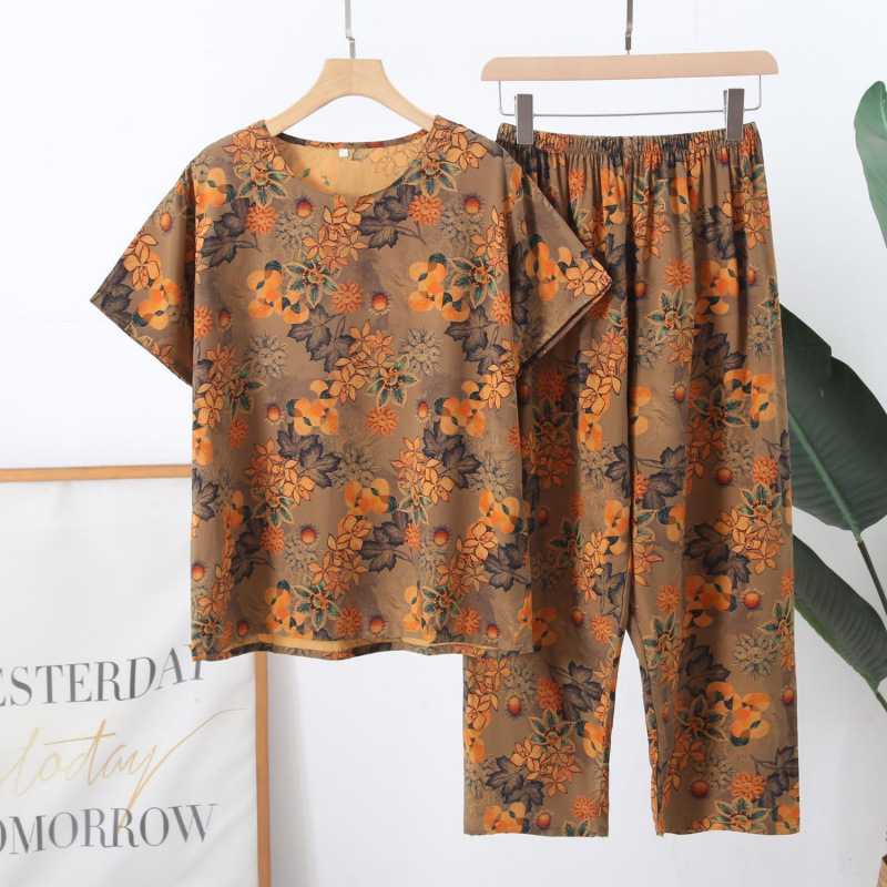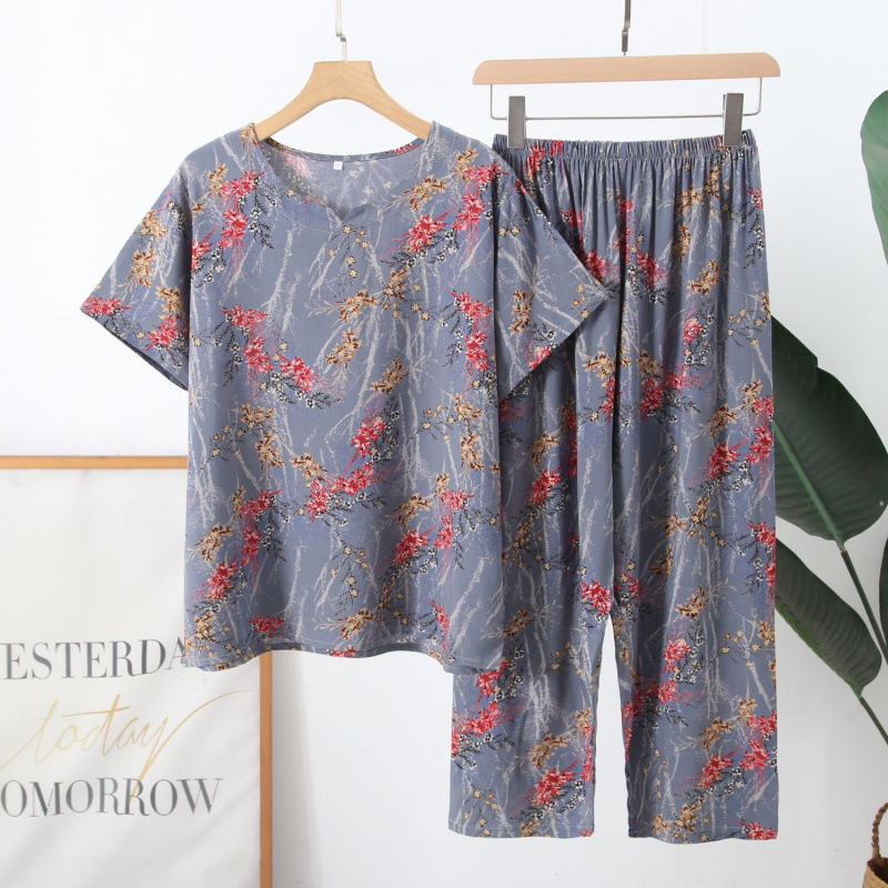 夏季碎花短袖中老年棉绸睡衣女士妈妈薄款长裤夏装宽松家居服套装