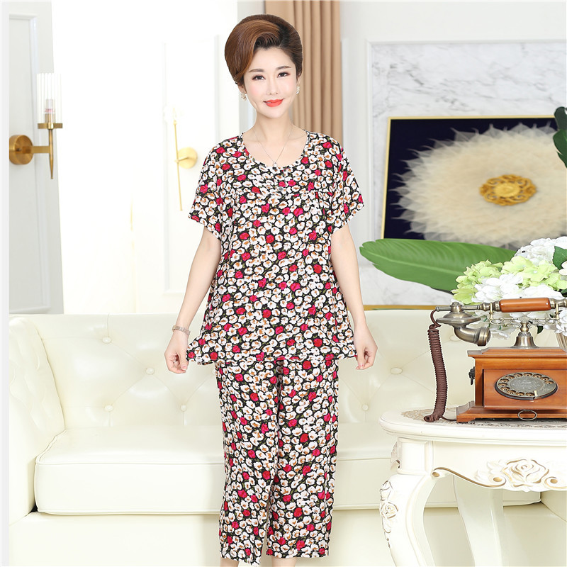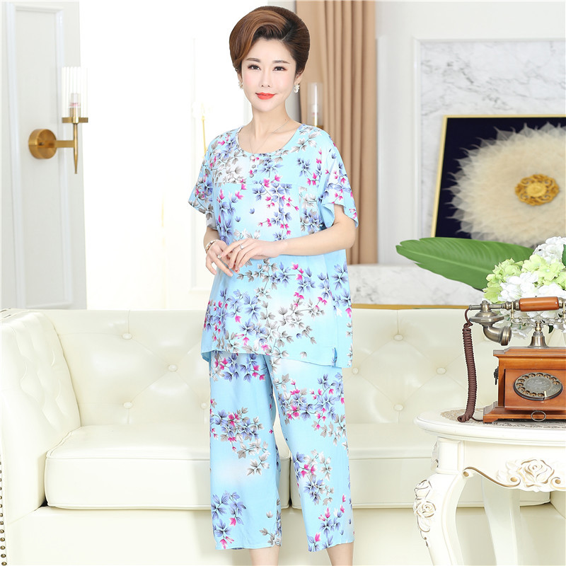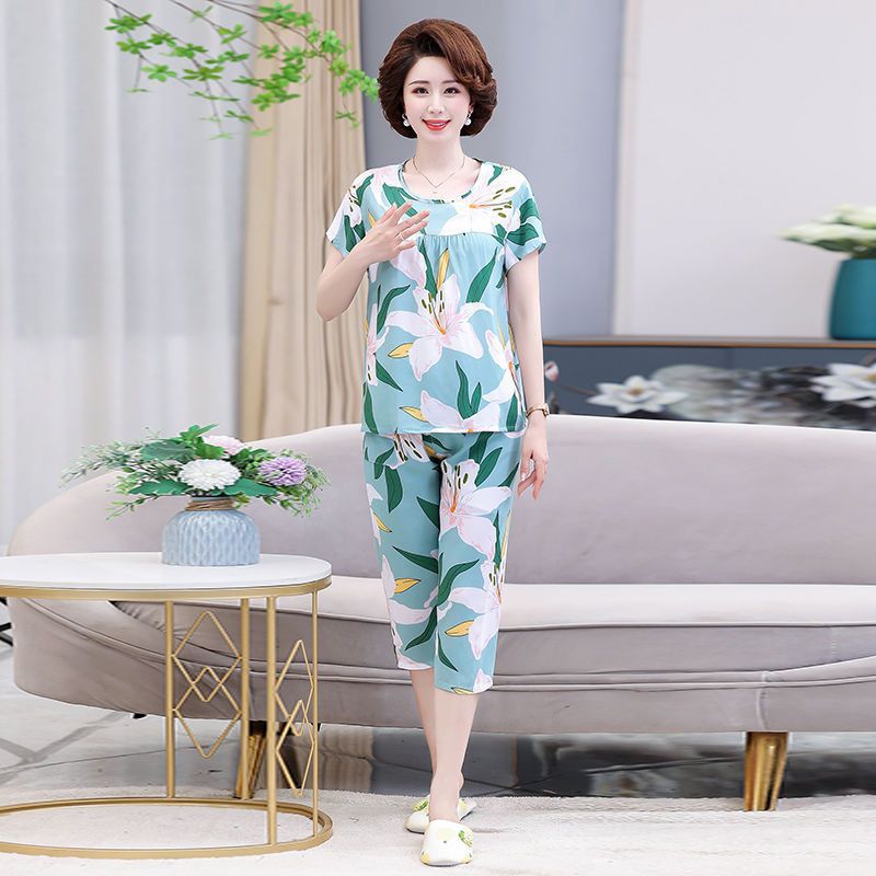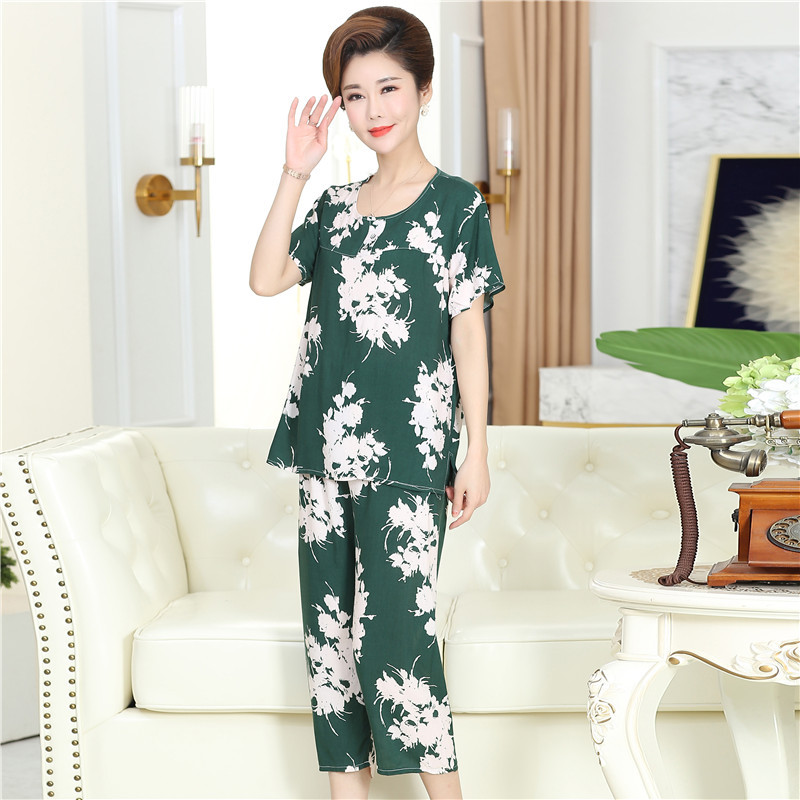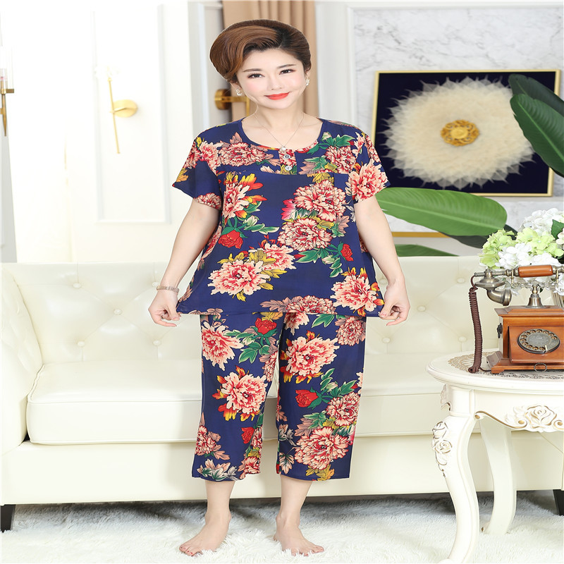 棉绸睡衣套装女夏季妈妈家居服短袖中老年人造棉加肥加大码两件套