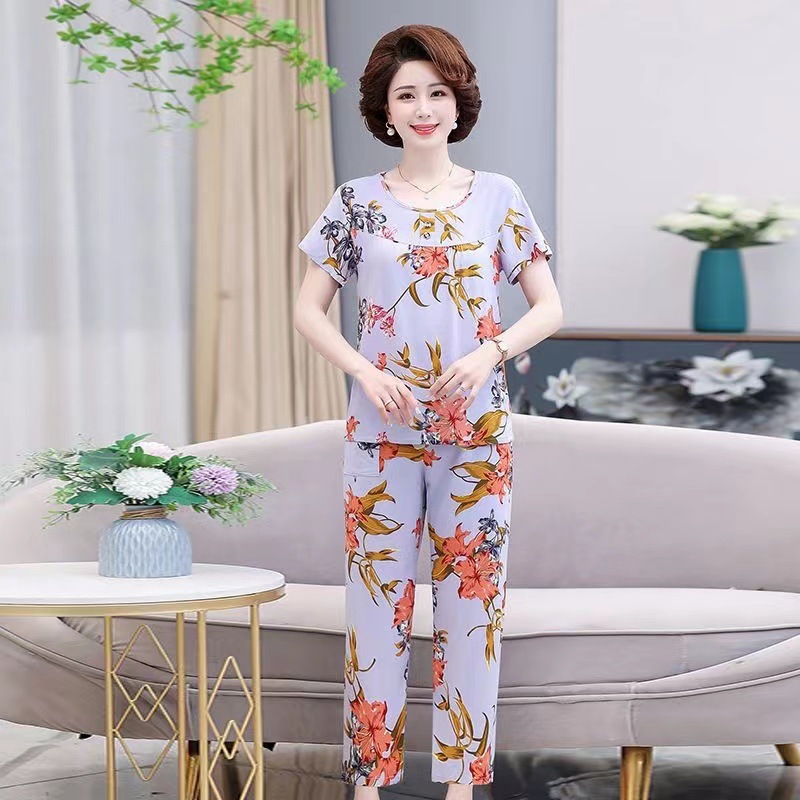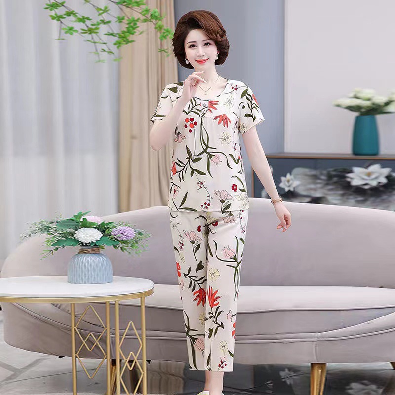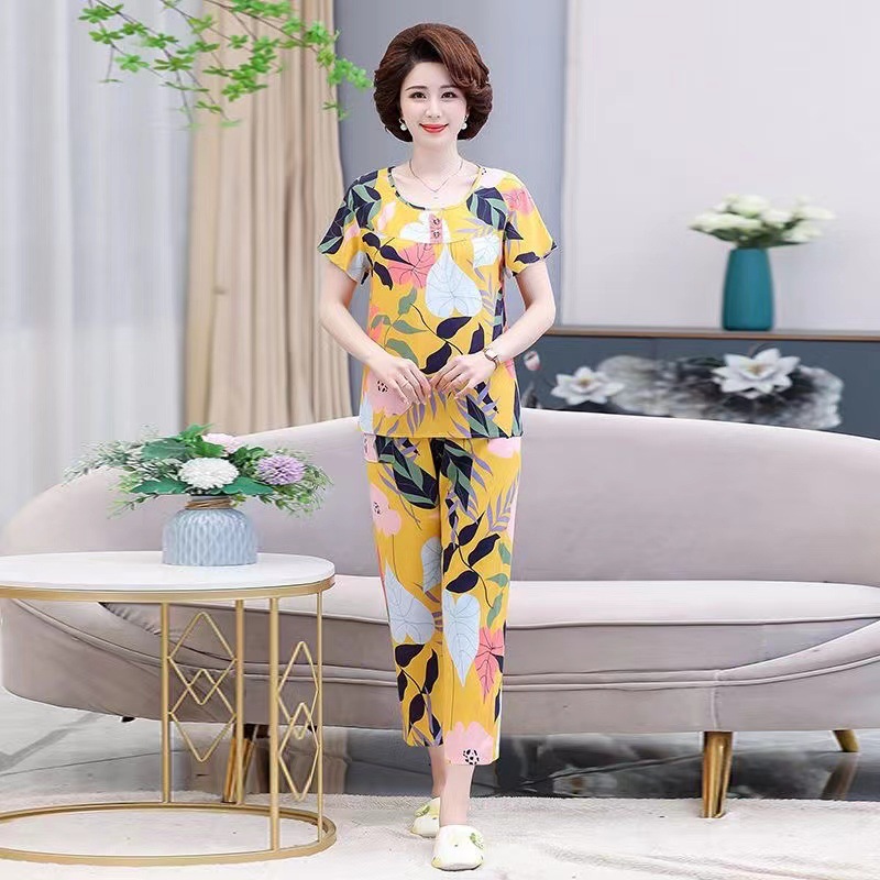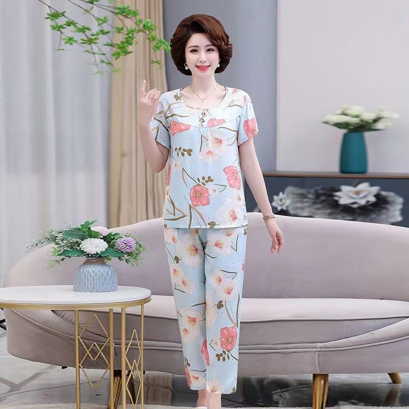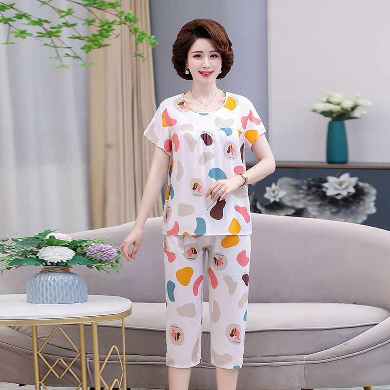 棉绸睡衣套装女夏季妈妈家居服短袖中老年人造棉加肥加大码两件套