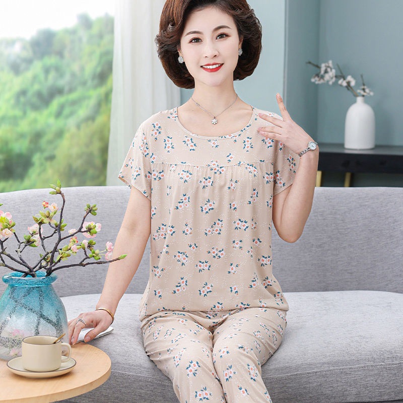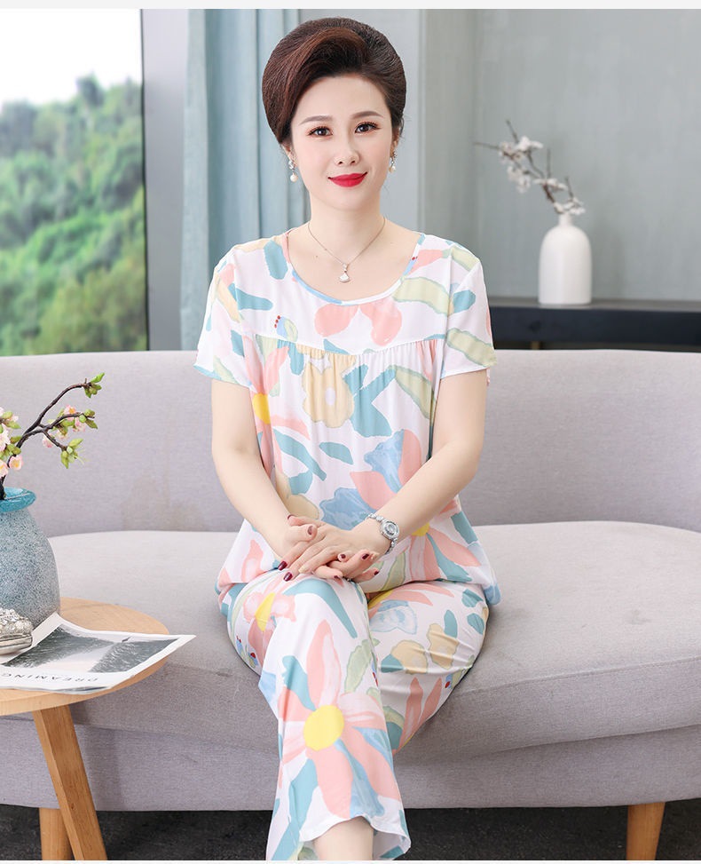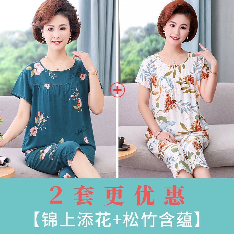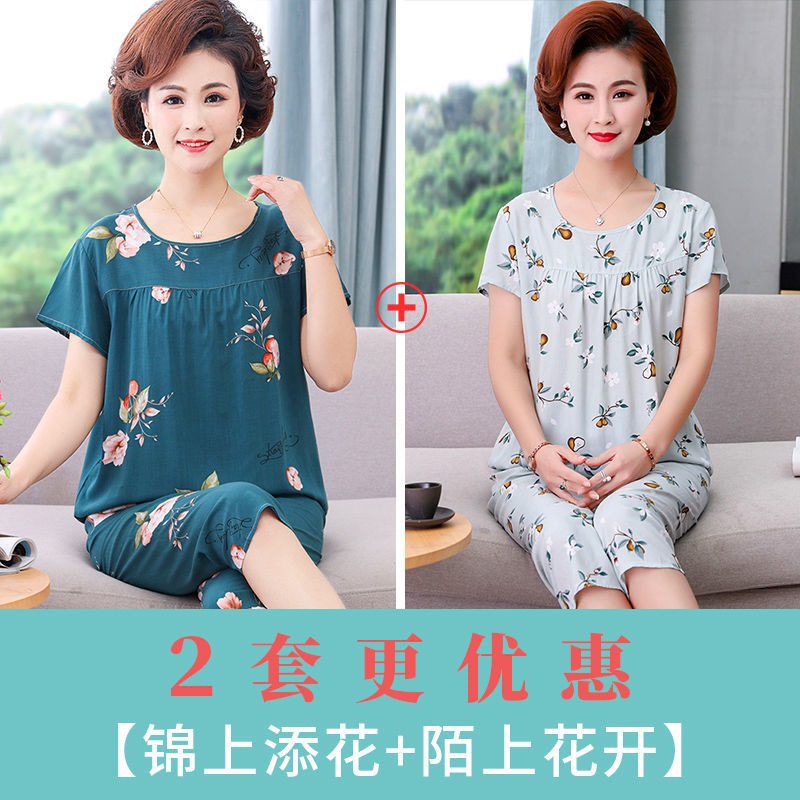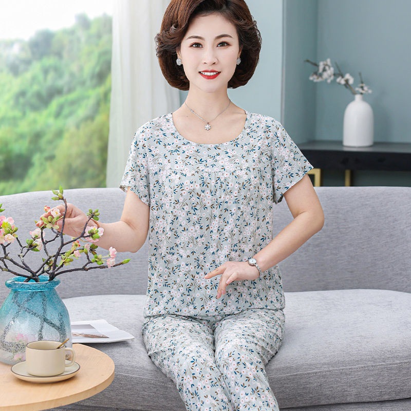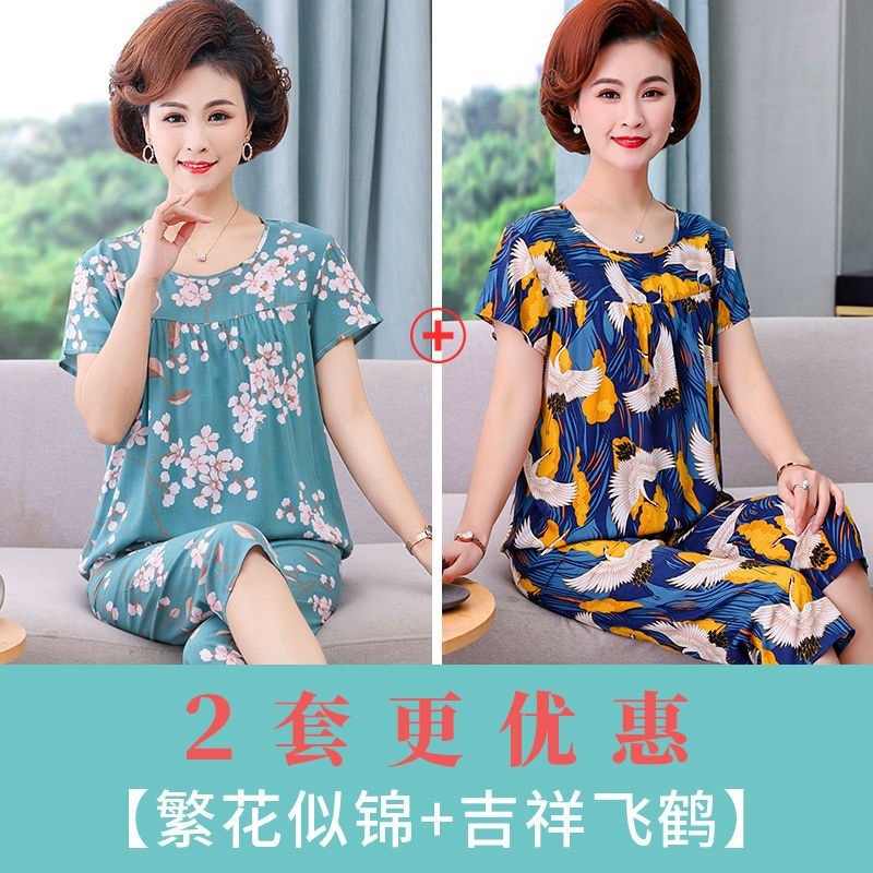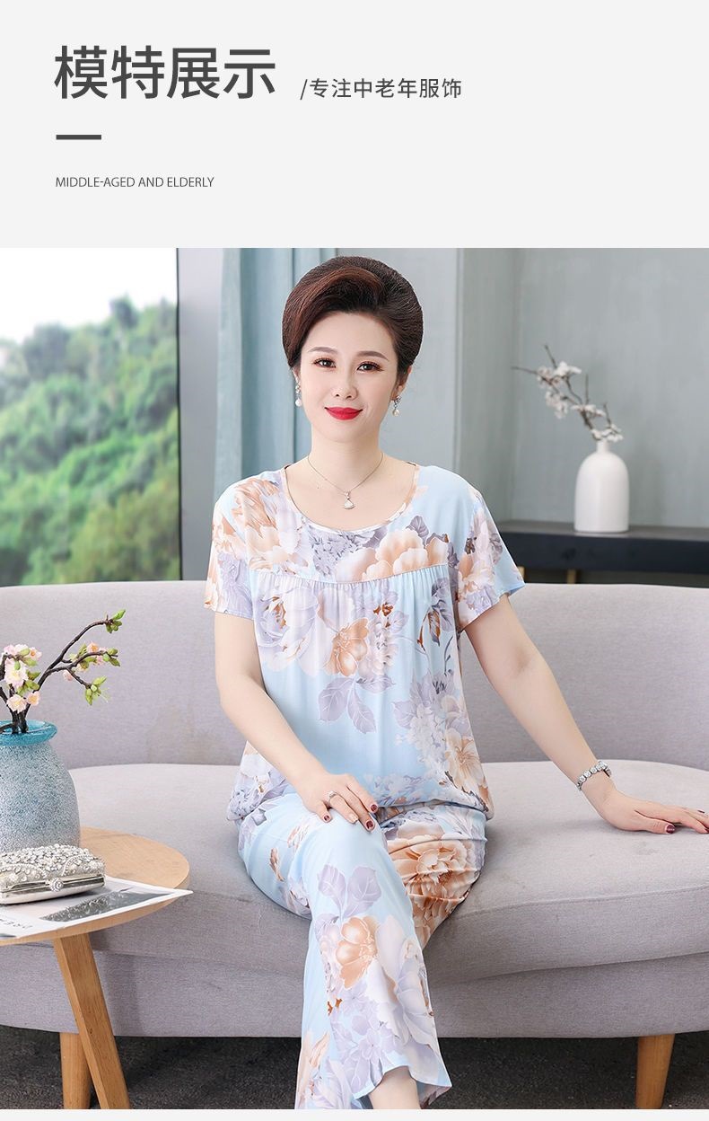 妈妈棉绸睡衣女薄款家居服人造棉中老年老人绵绸两件套装可外穿