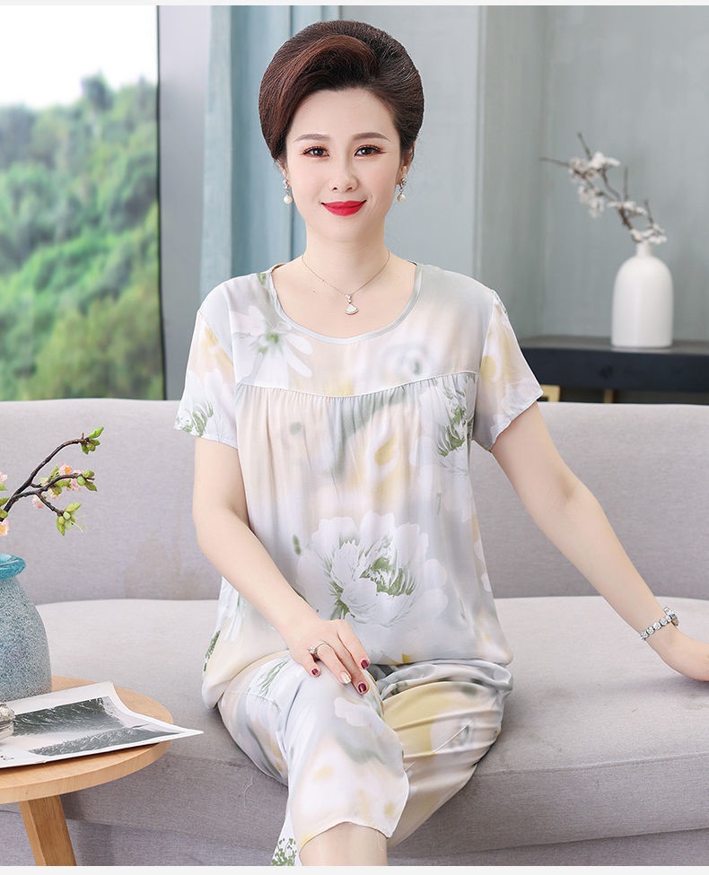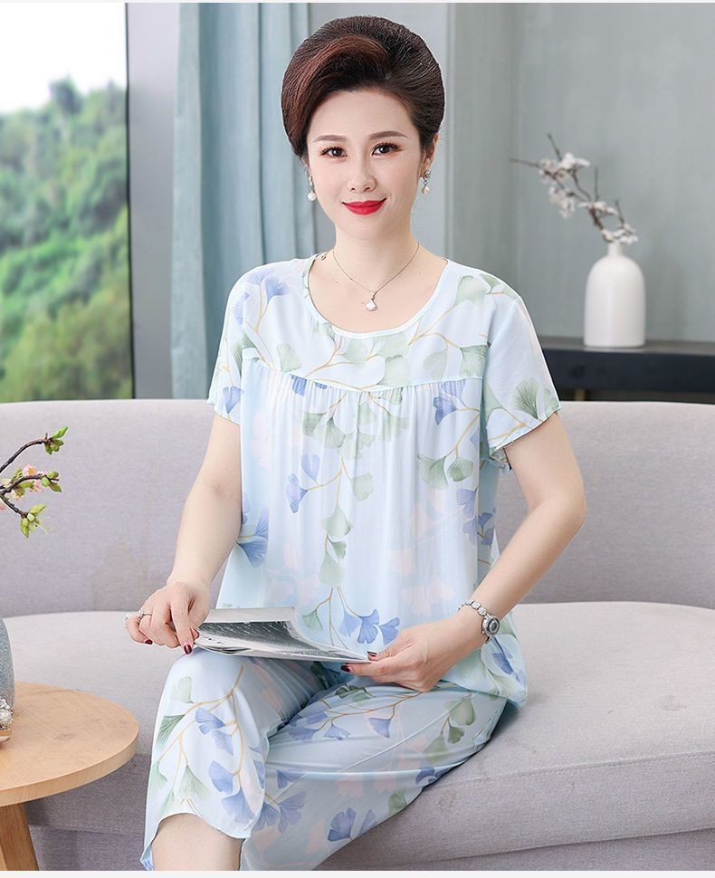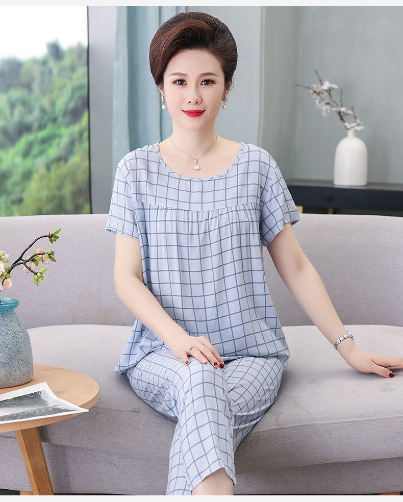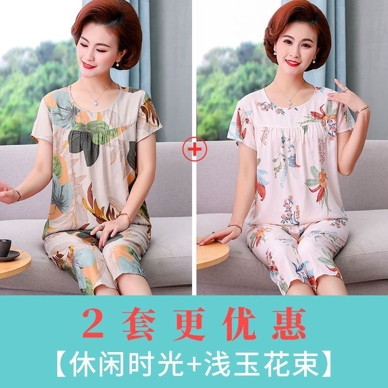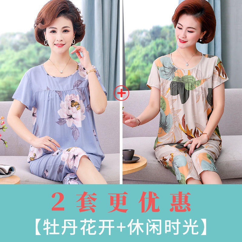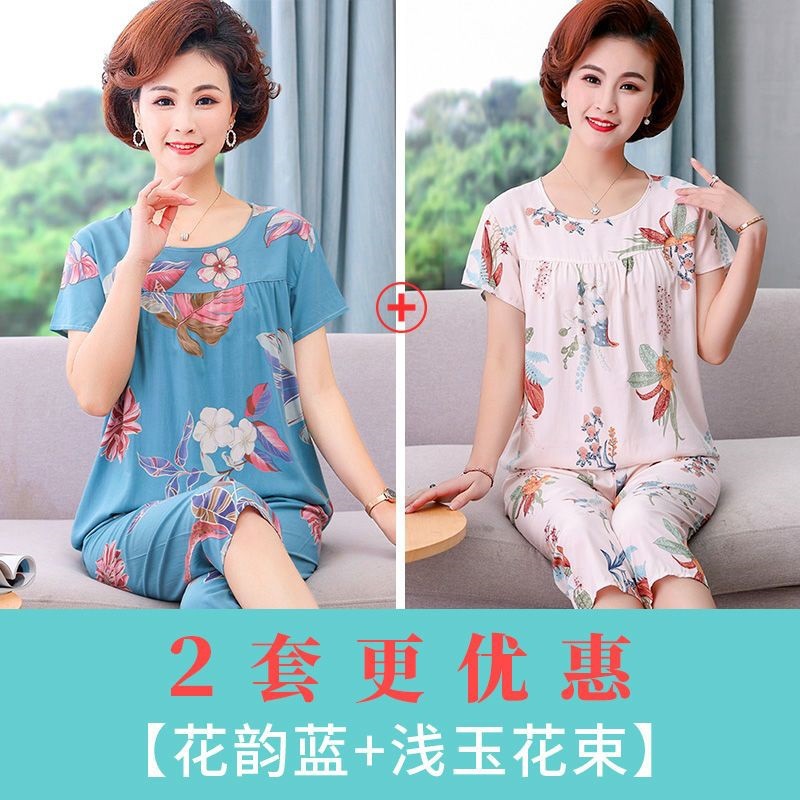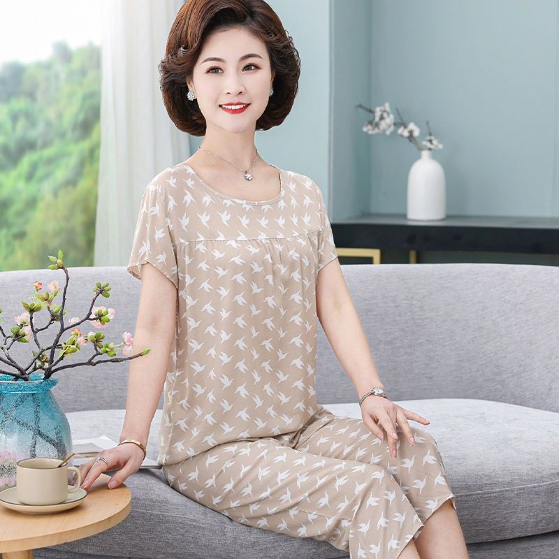 妈妈棉绸睡衣女薄款家居服人造棉中老年老人绵绸两件套装可外穿