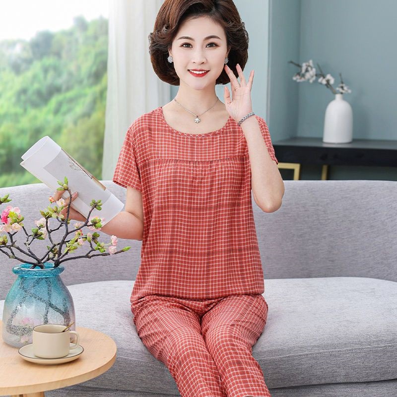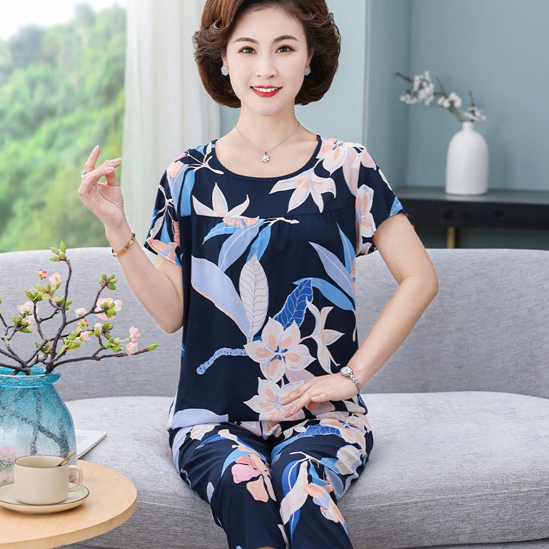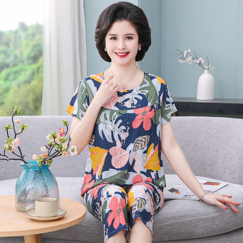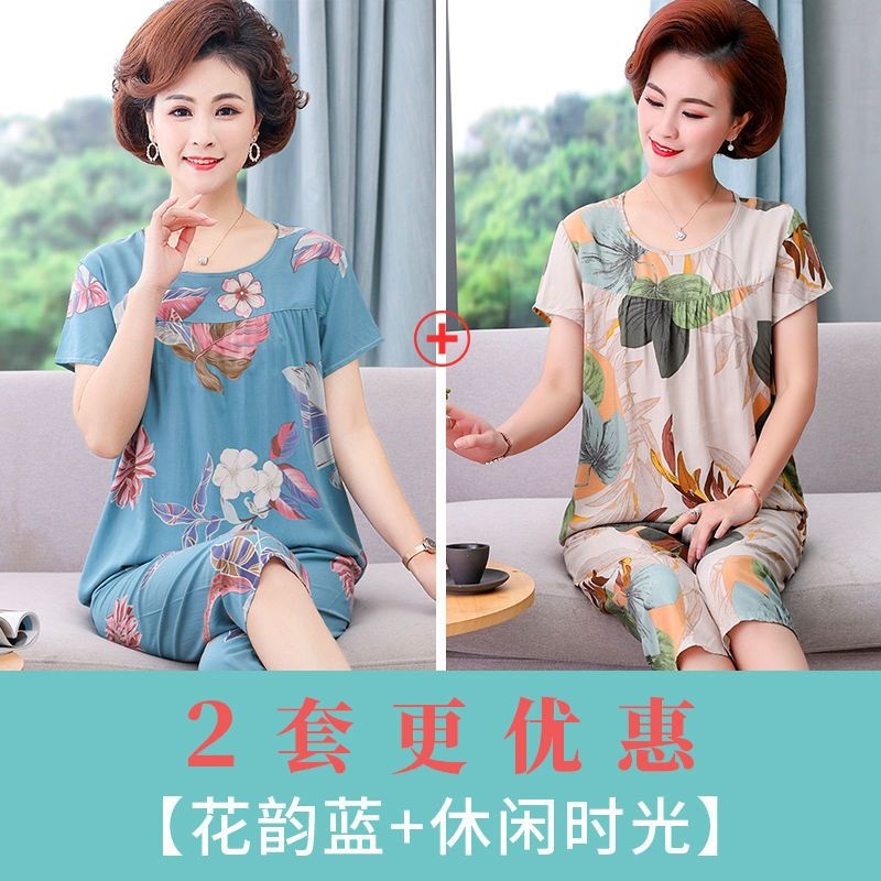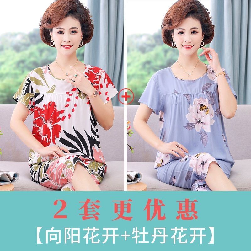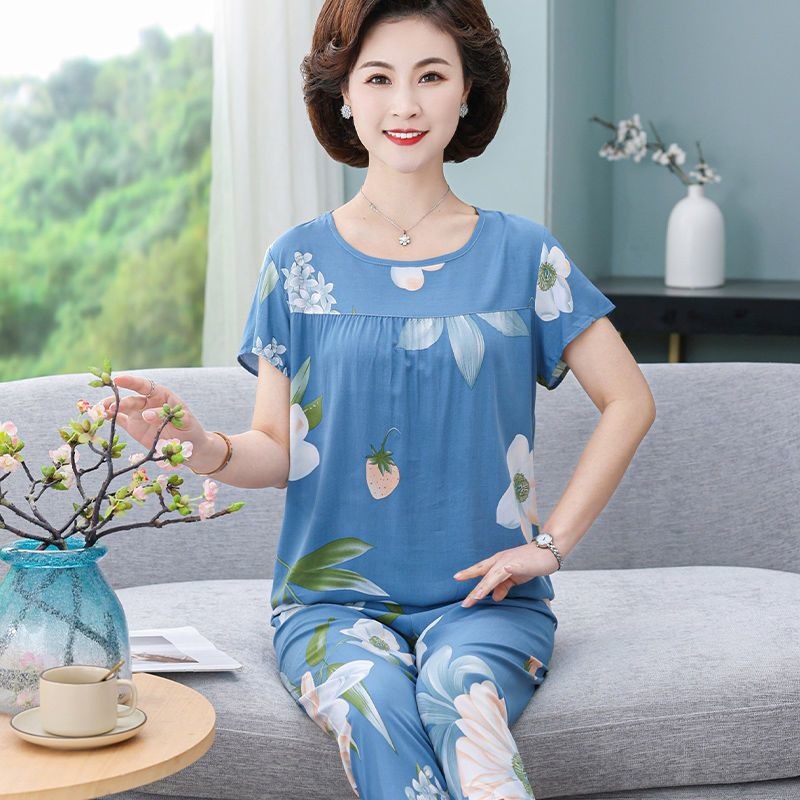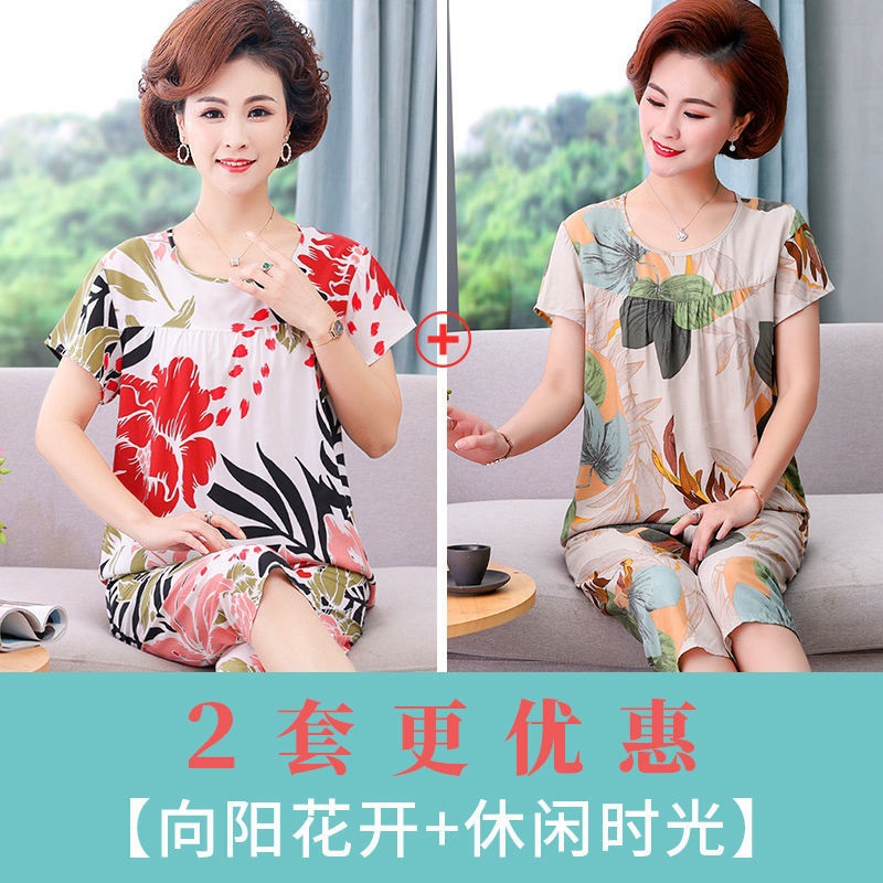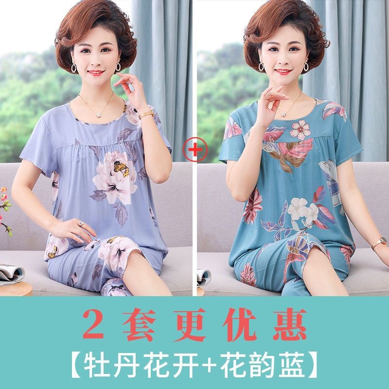 妈妈棉绸睡衣女薄款家居服人造棉中老年老人绵绸两件套装可外穿