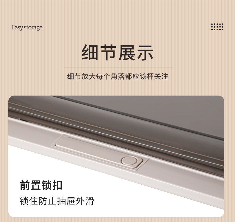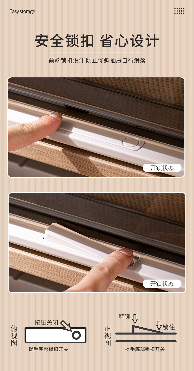 小号、中号、大号、加大号、特大号前段没有卡扣,其他尺寸前段都有卡扣哦!(ps:卡扣是安全锁扣,搬大抽屉的时候可以防止内抽滑出)