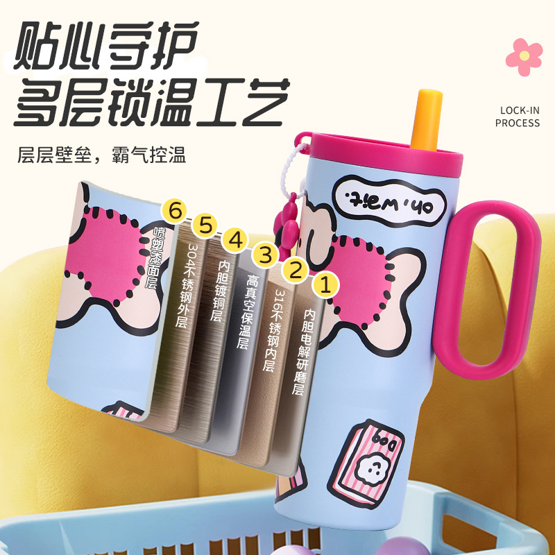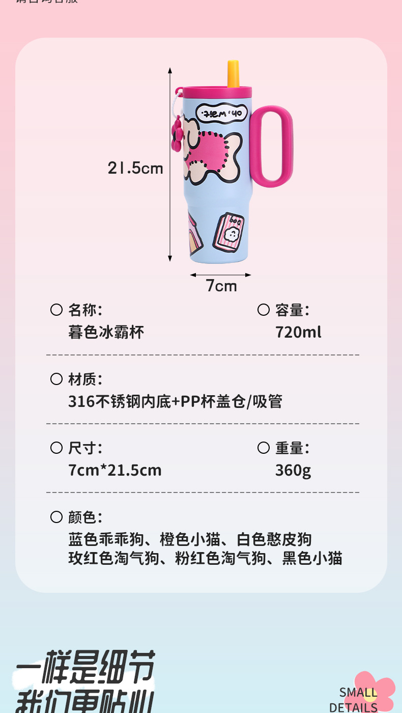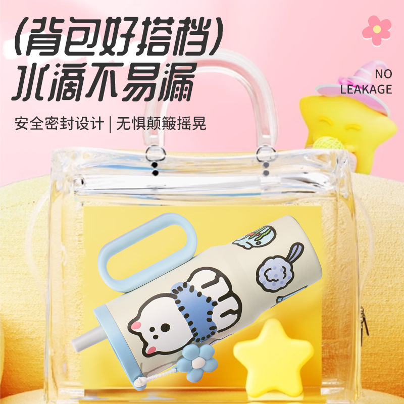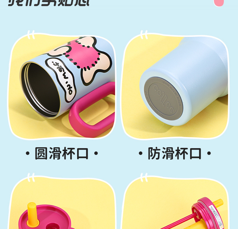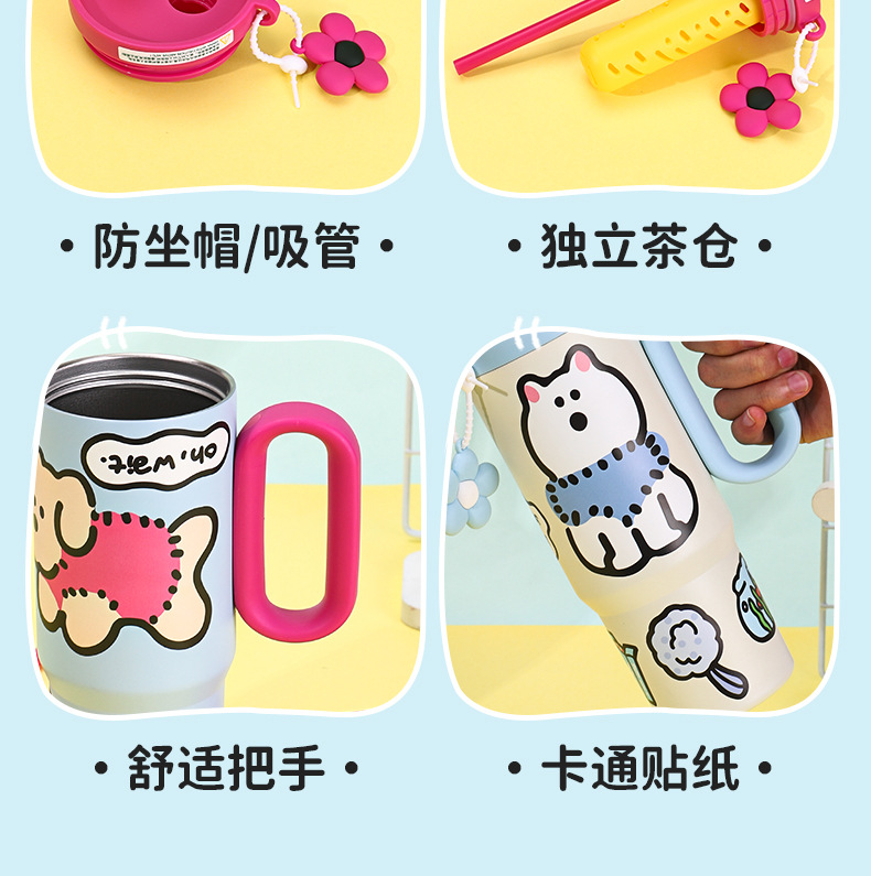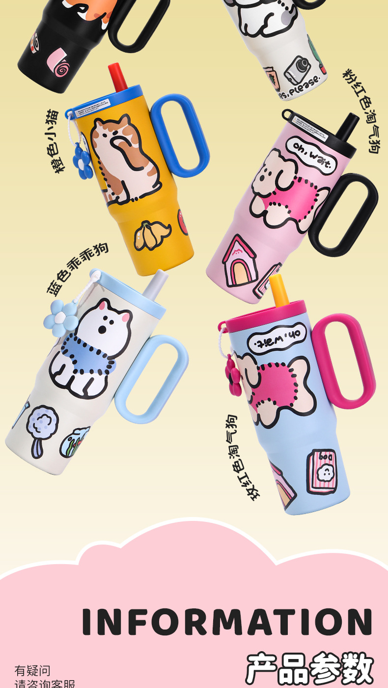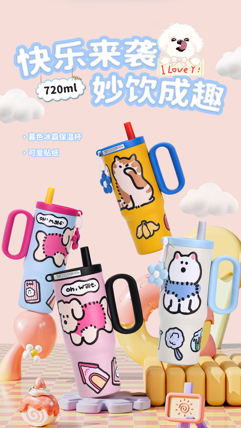 可爱猫狗316不锈钢保温杯女生高颜值保冷冰霸杯带手柄吸管汽车杯