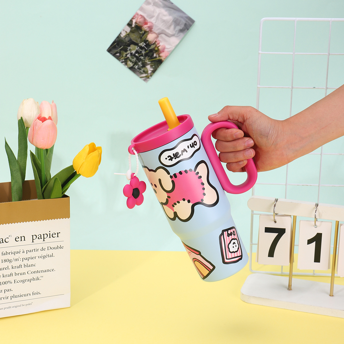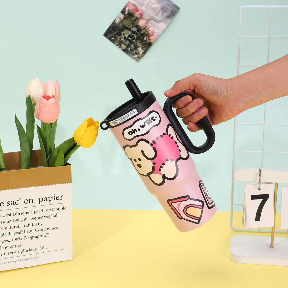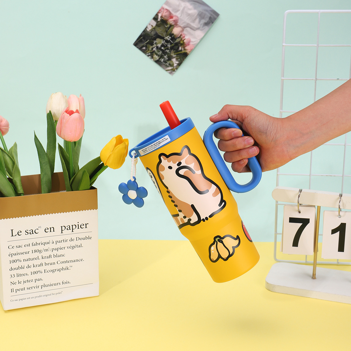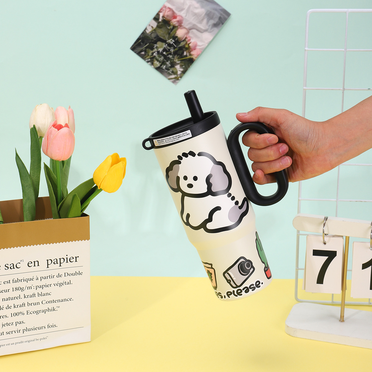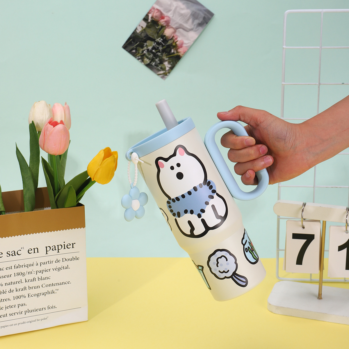 可爱猫狗316不锈钢保温杯女生高颜值保冷冰霸杯带手柄吸管汽车杯